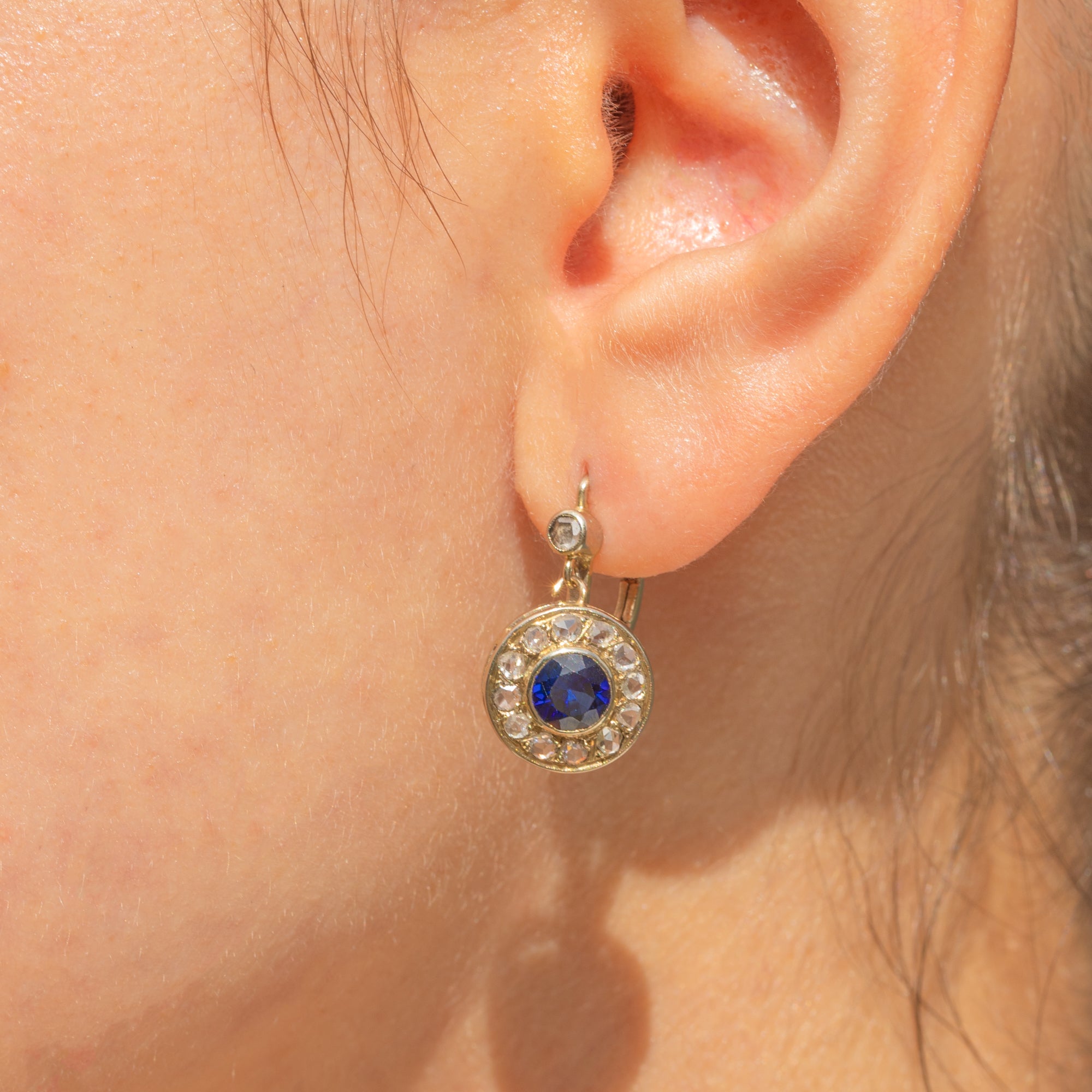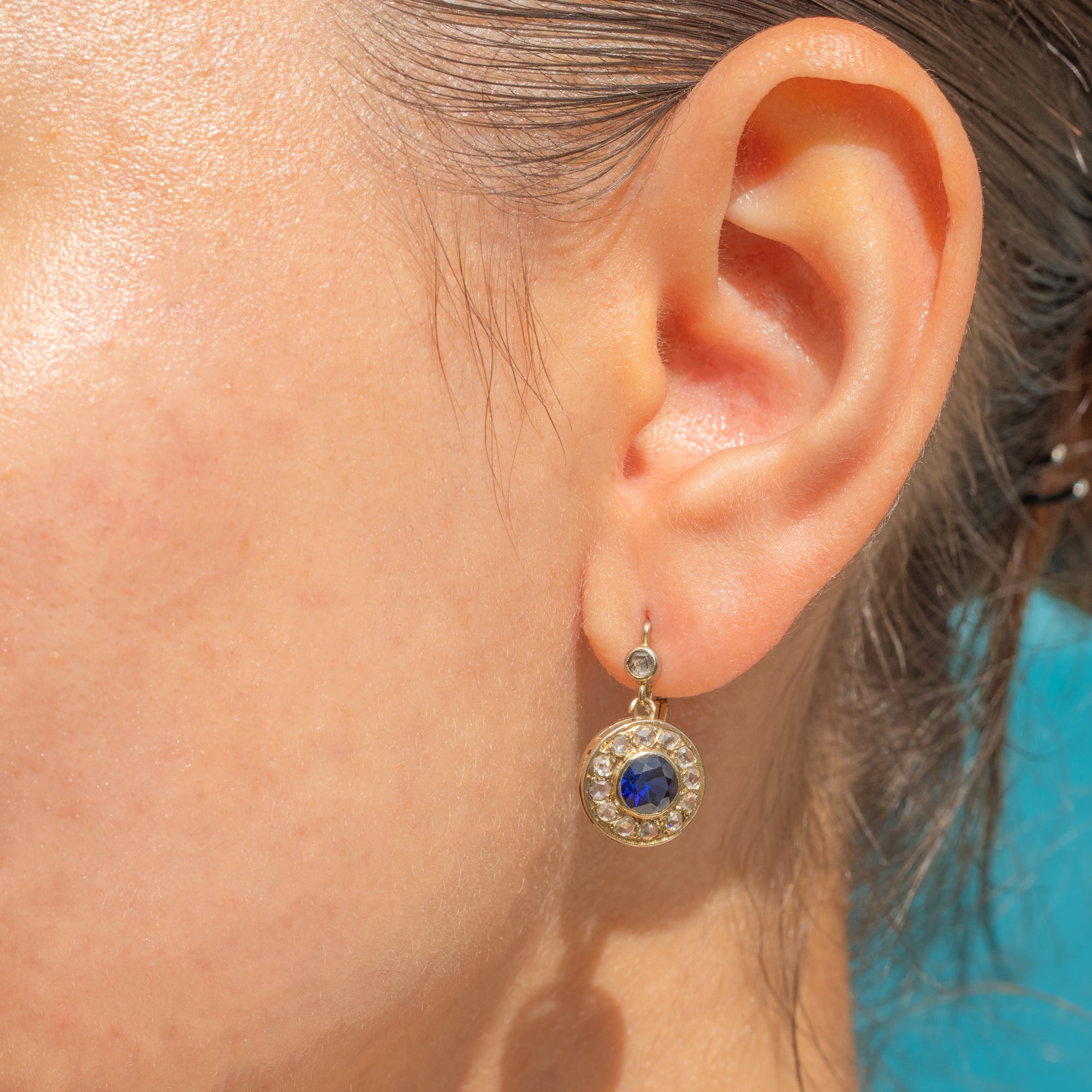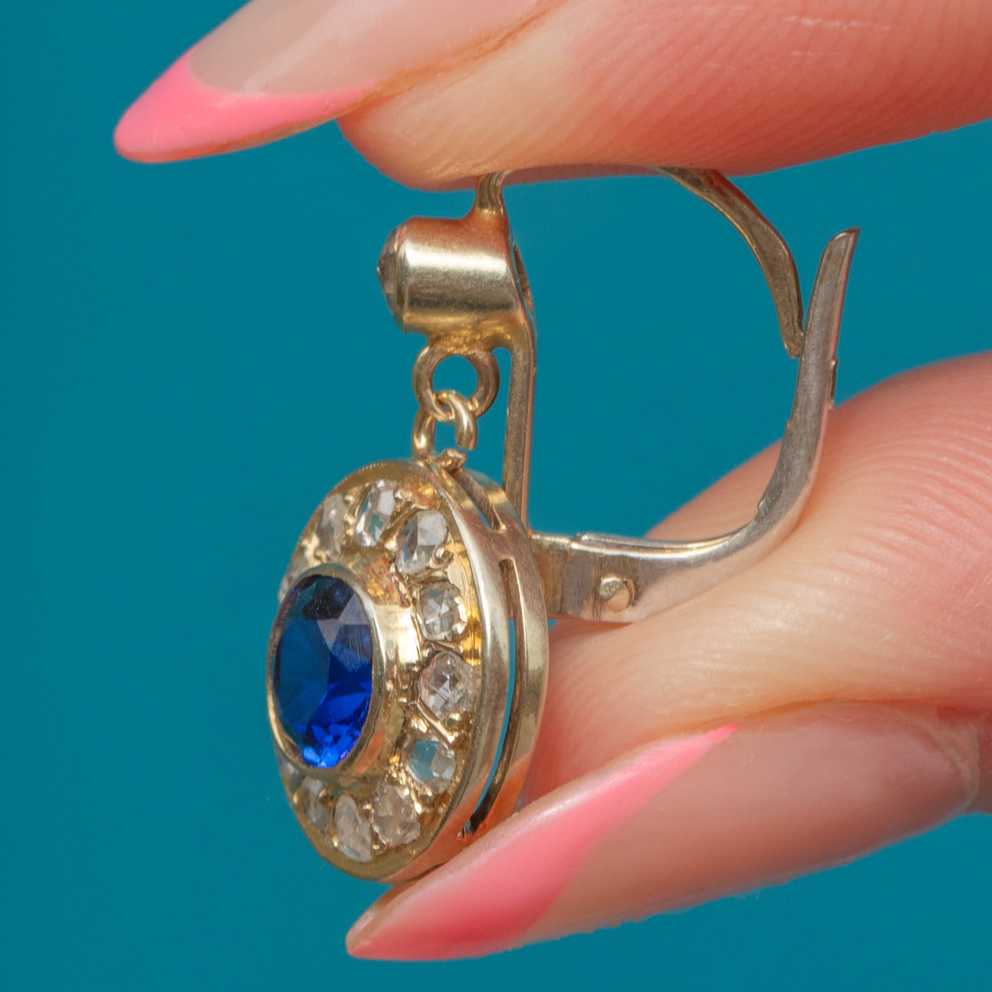 EXCELLENT: These antique French 18ct Gold Sapphire and Diamond cluster drop earrings are in wonderful condition. The Sapphires and rose-cut Diamonds are radiant and secure within their settings, free from chips or abrasions. With her lever backs in perfect working order, these antique earrings can be worn with the utmost confidence!