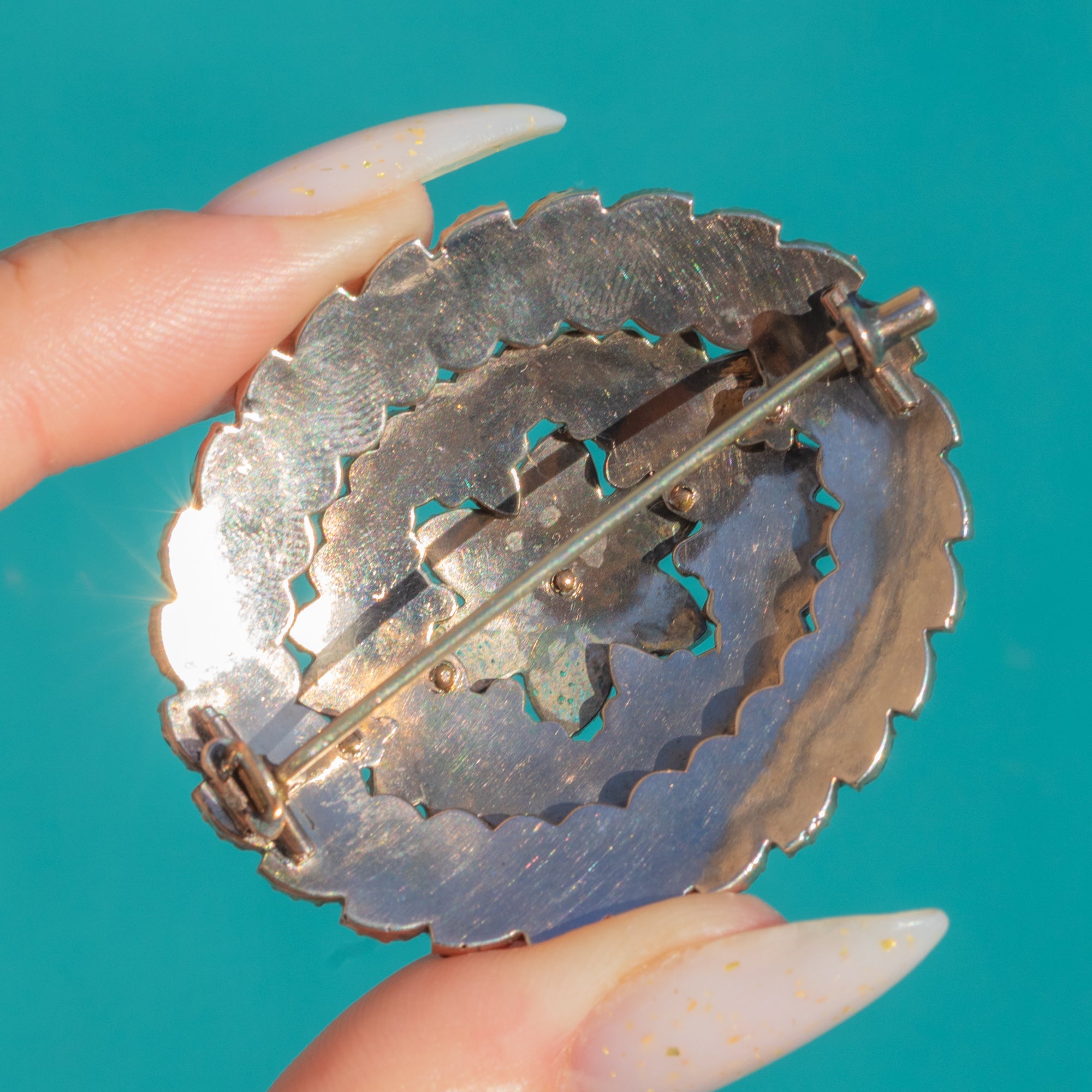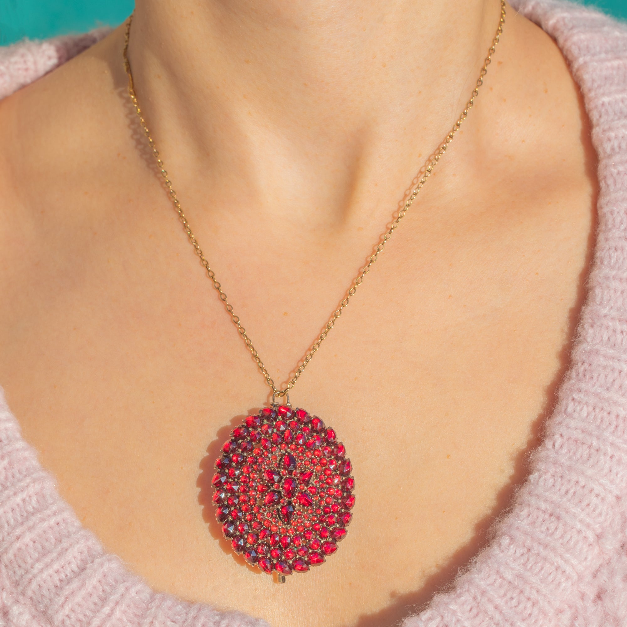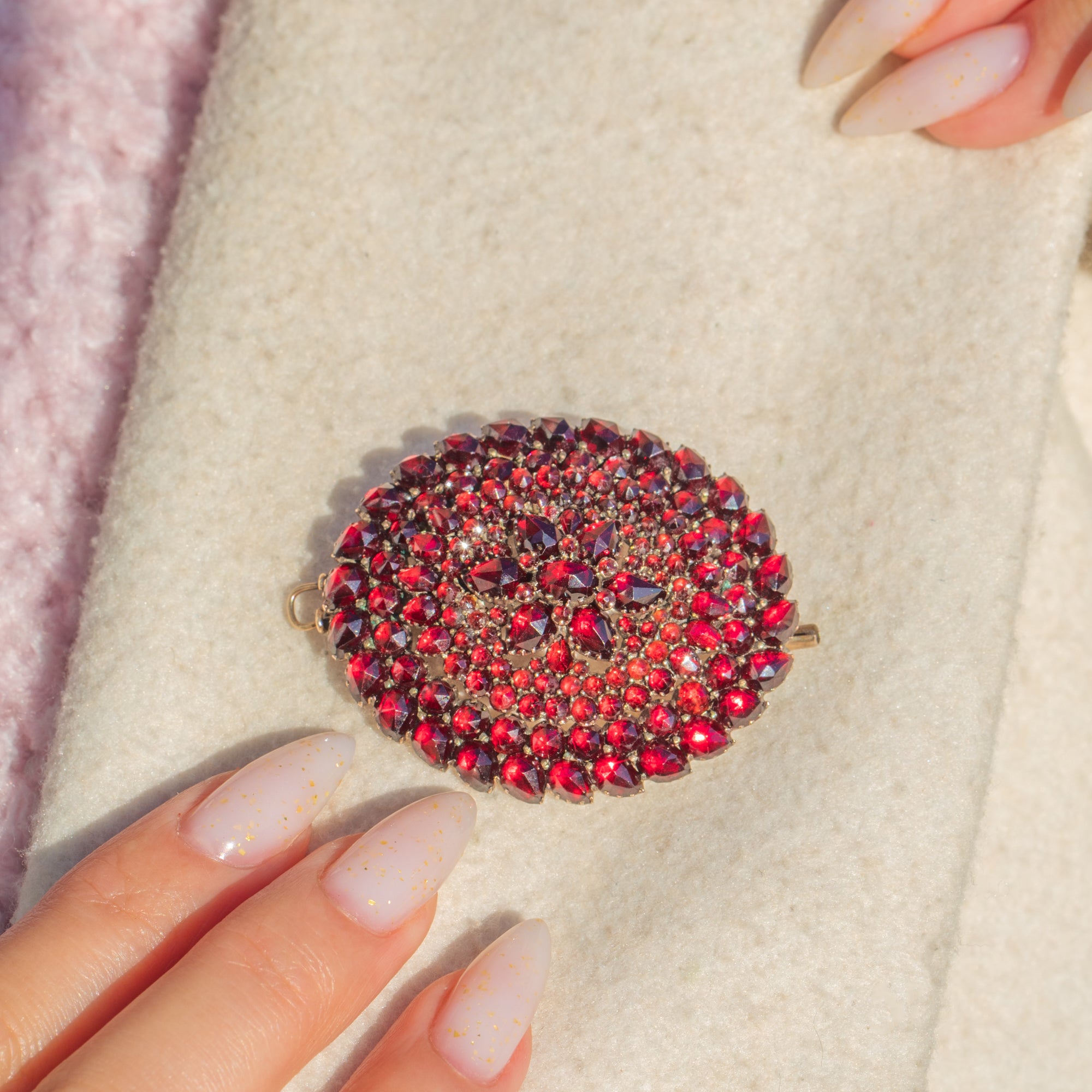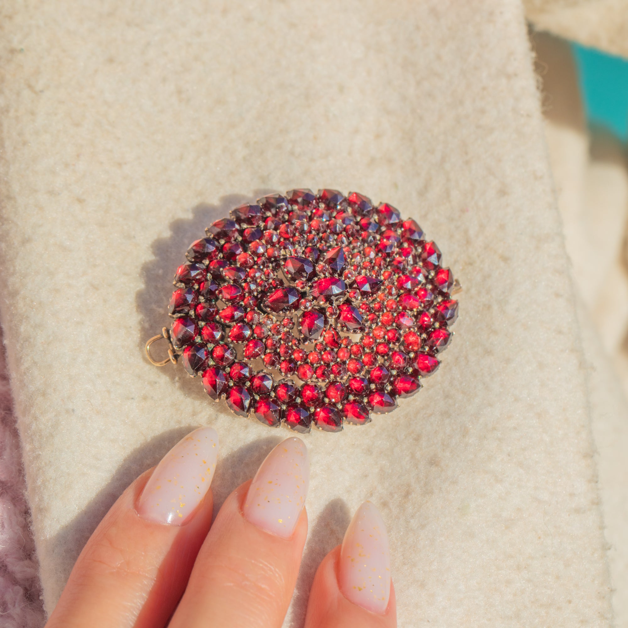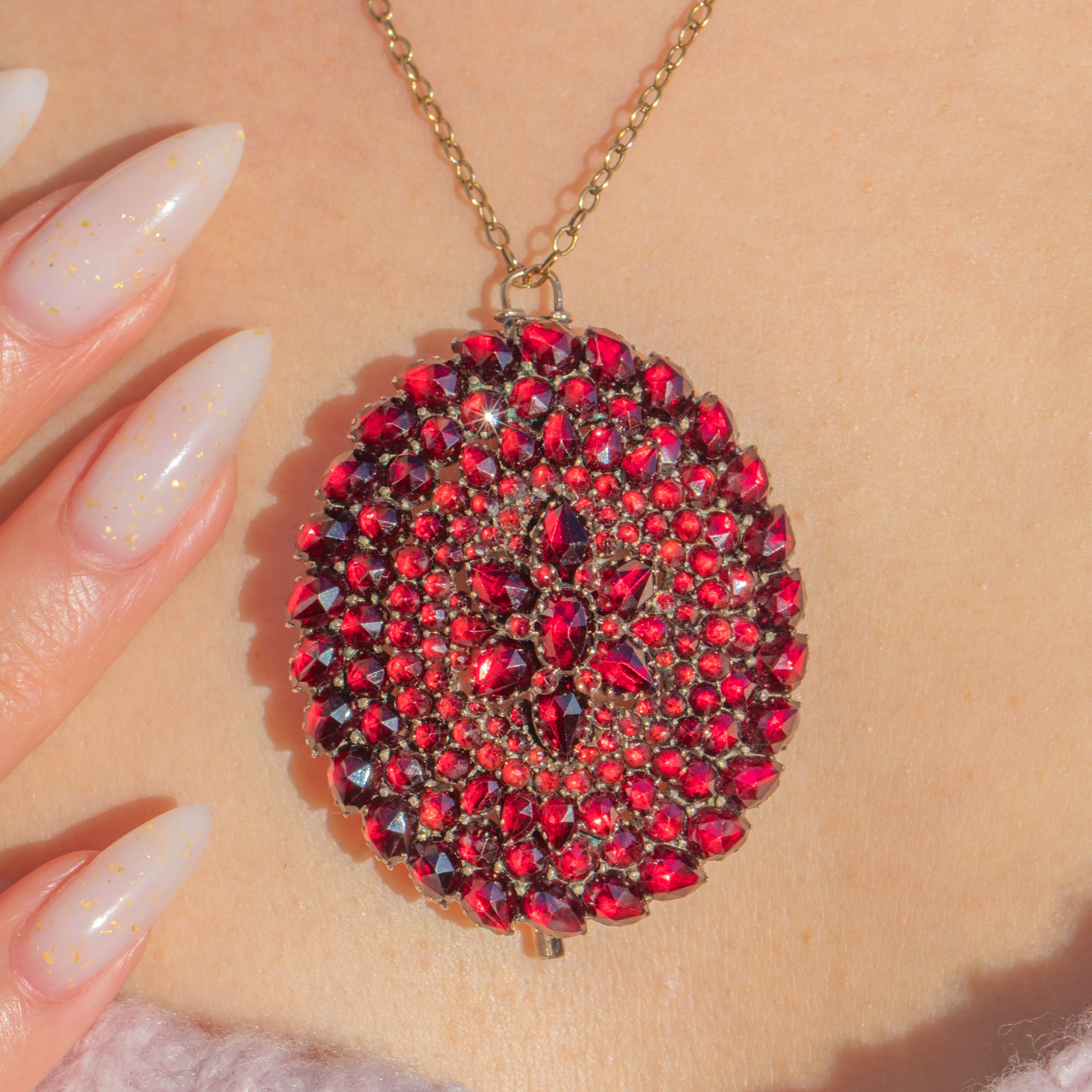 Glowing with saturated pomegranate-red light, this dramatic Victorian brooch pendant is a triumph of pavé-set Garnets. The domed cluster is arranged in concentric rosette tiers with a star-like centre, culminating in a scalloped fringe of pear-shaped stones—an opulent Victorian statement that shimmers beautifully on the neckline or lapel.