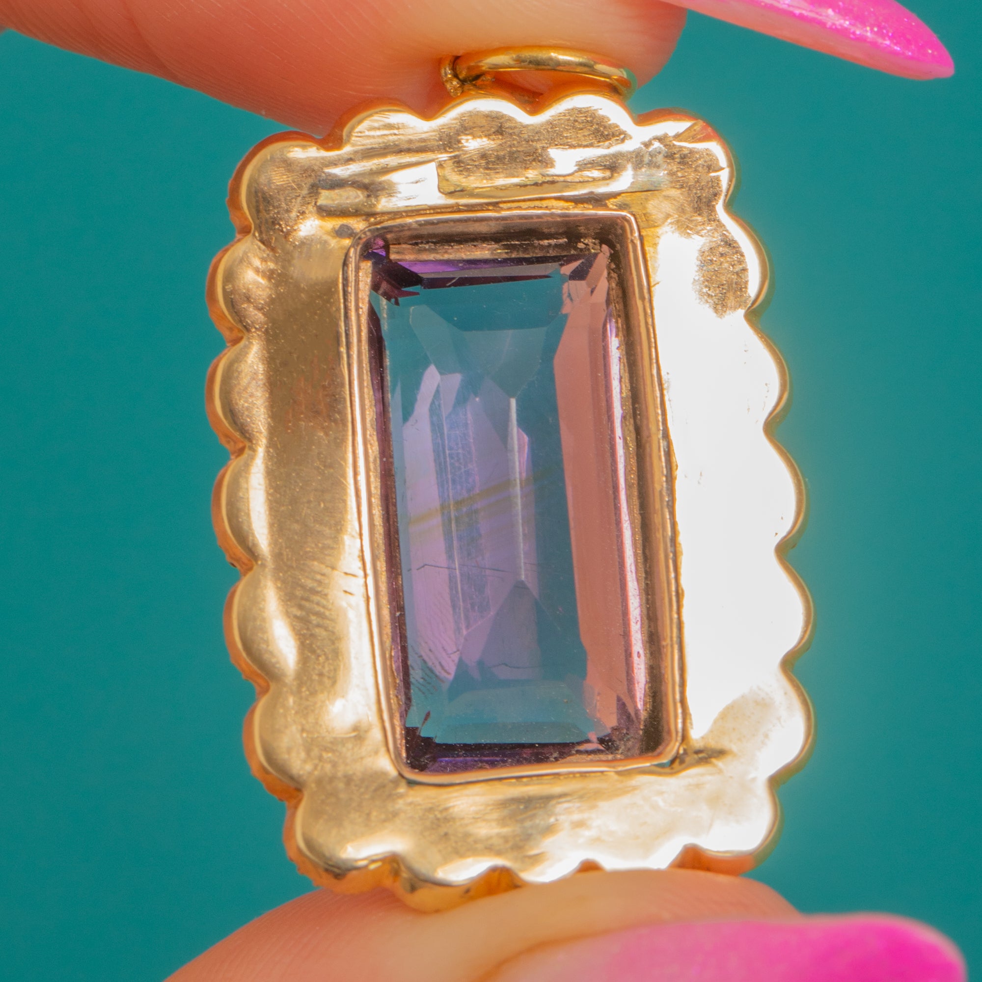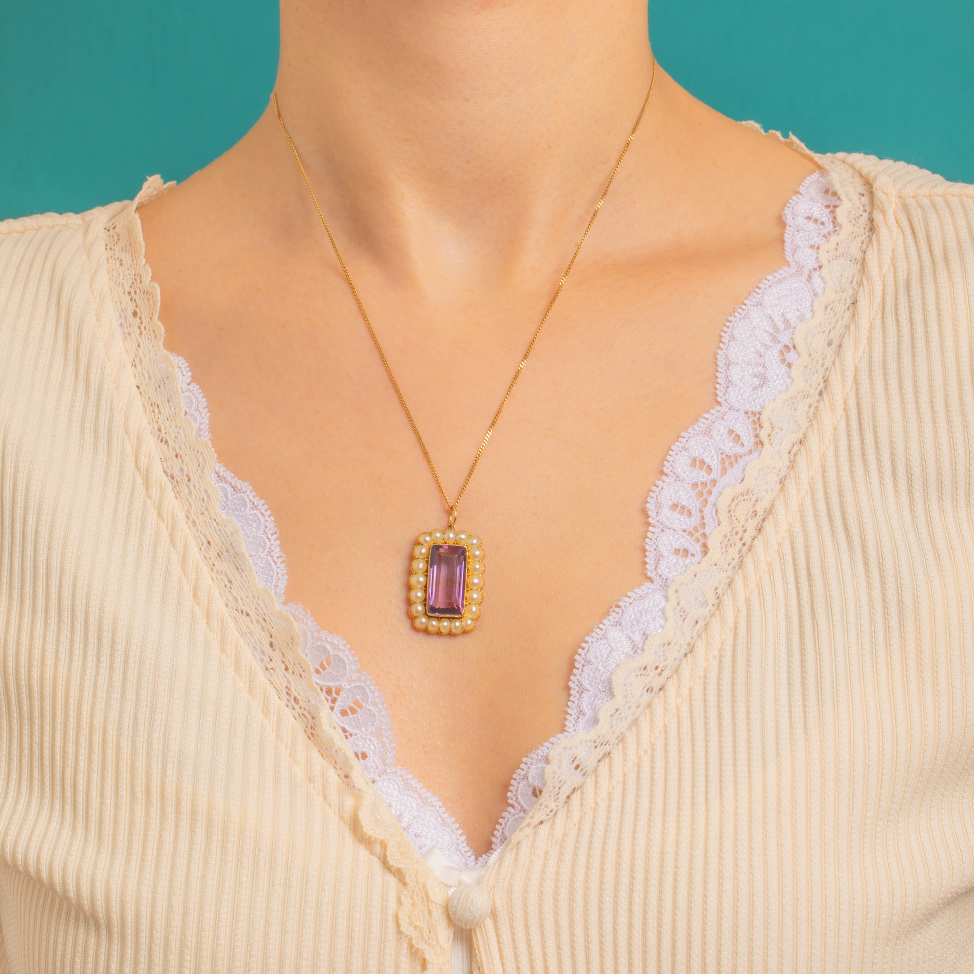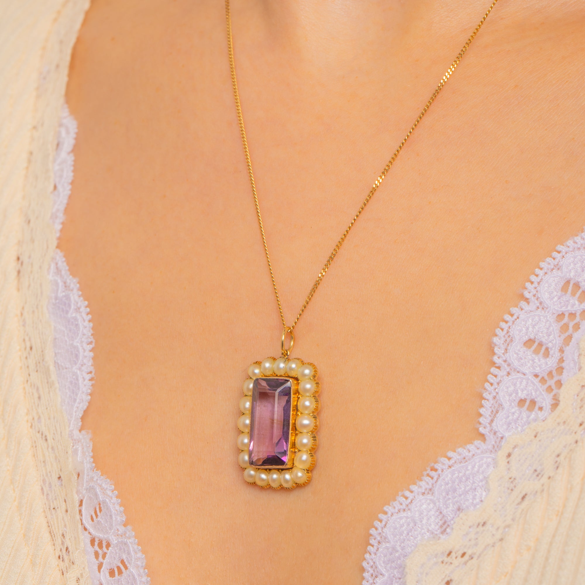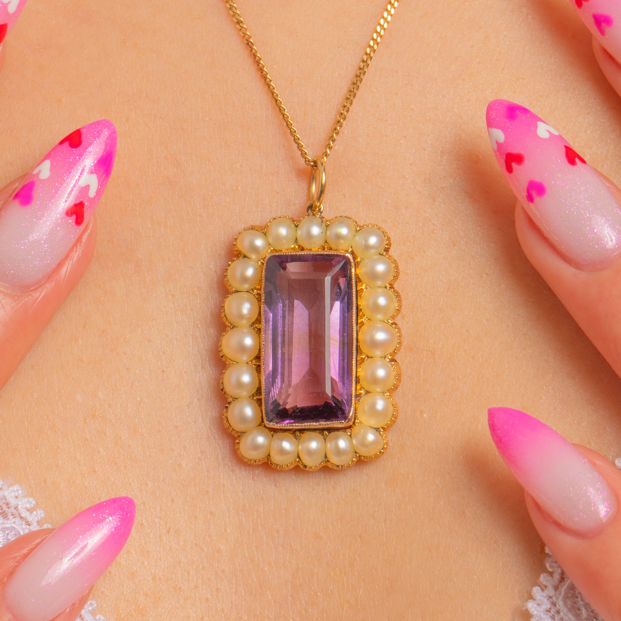 Brimming with Georgian elegance, this refined 15ct Gold pendant centres a sumptuous rectangular step-cut Amethyst of approximately 10.00ct, its rich violet hue beautifully complemented by a halo of creamy Pearls. The raised bezel highlights the gemstone’s clean geometry, while the scalloped, piecrust surround lends a soft, romantic finish.