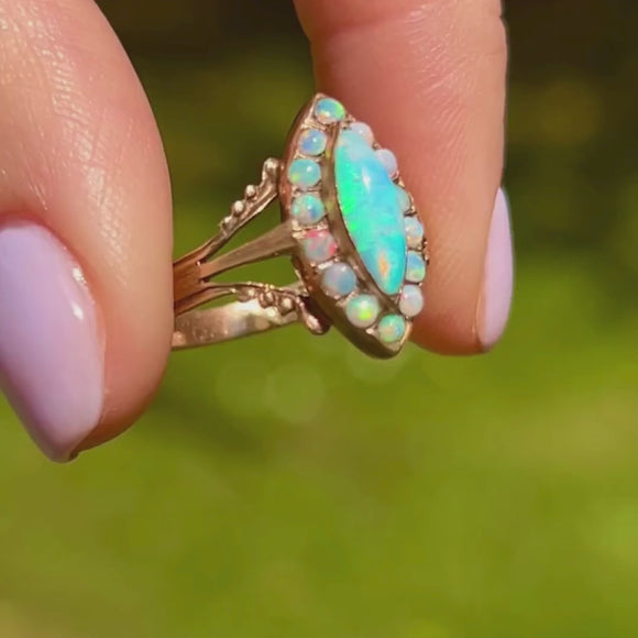 VERY GOOD. This antique Gold Opal marquise cluster ring is in very good condition! Each Opal is secure, smooth to the touch, with rich glacial hues running throughout. The Gold has a rich saturation throughout with only minimal signs of a resize on the back of the band that cannot be seen when worn. The tapered shoulders are symmetrical and perfectly shape the marquise centre piece!