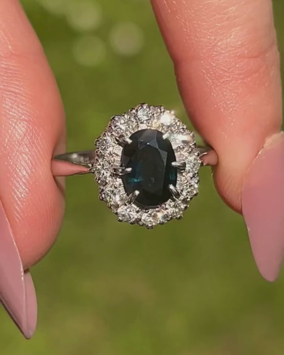 A striking antique natural Sapphire Diamond ring to adorn your finger! This gorgeous ring is home to a 1.60ct natural blue Sapphire, with a 0.25ct halo of sparkling Diamonds.