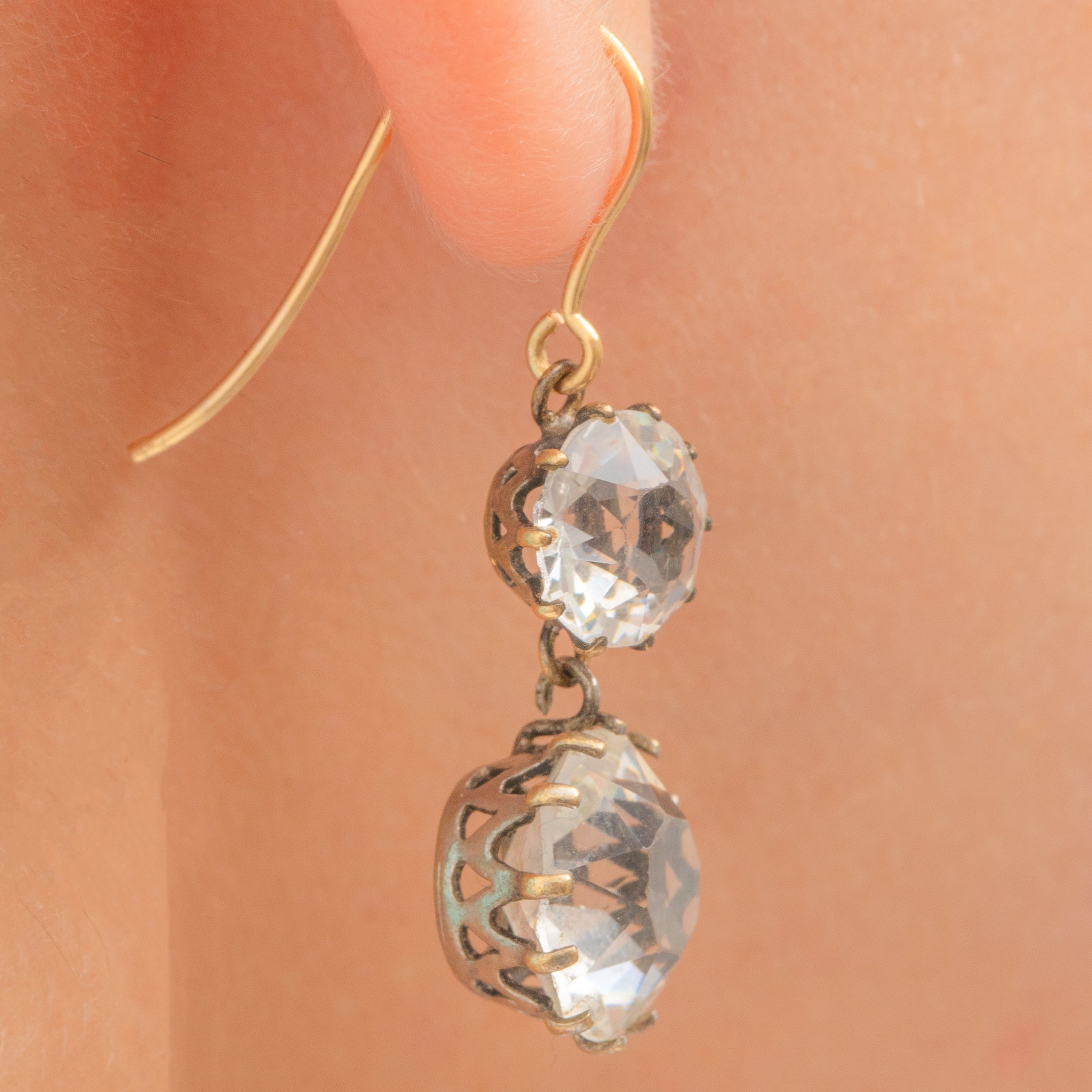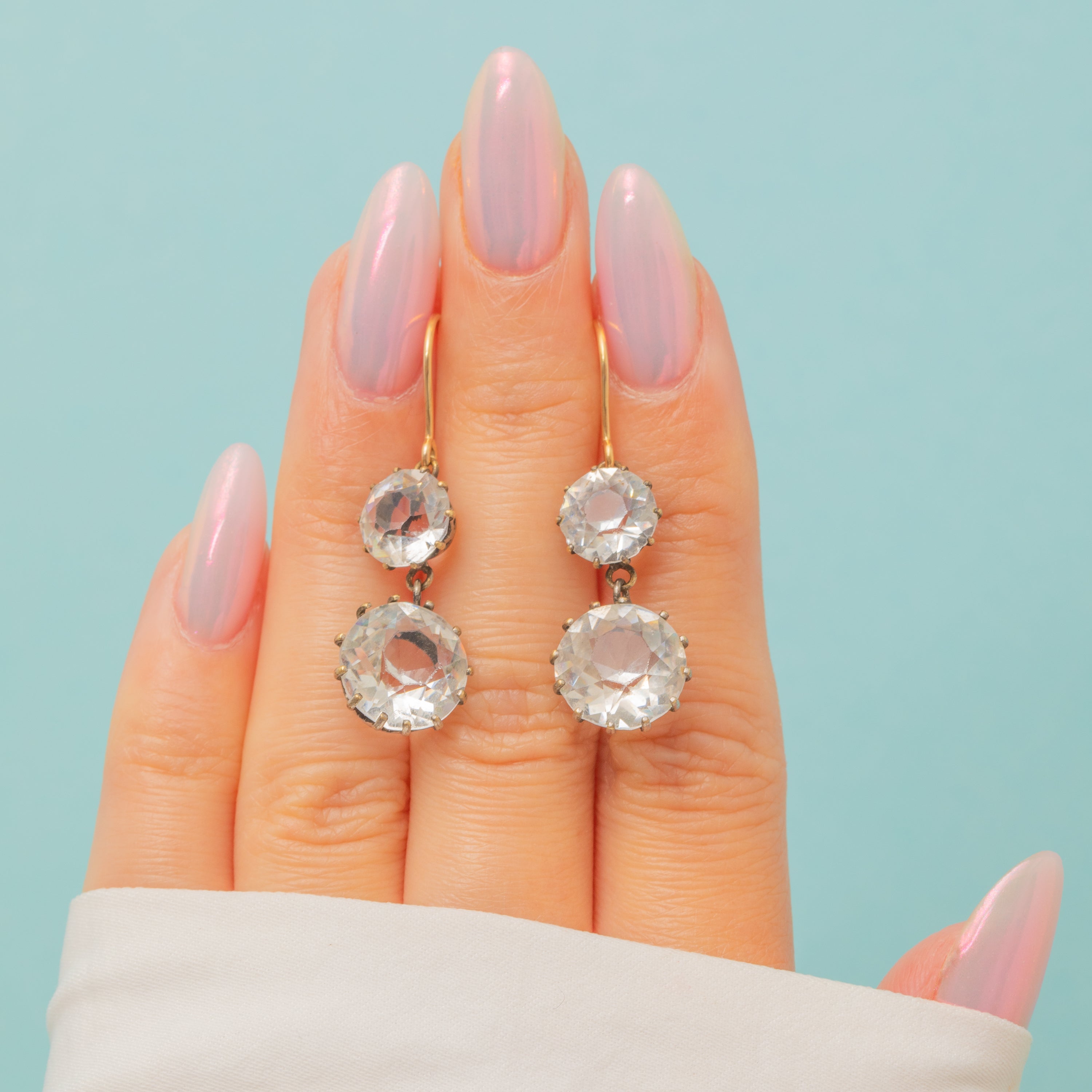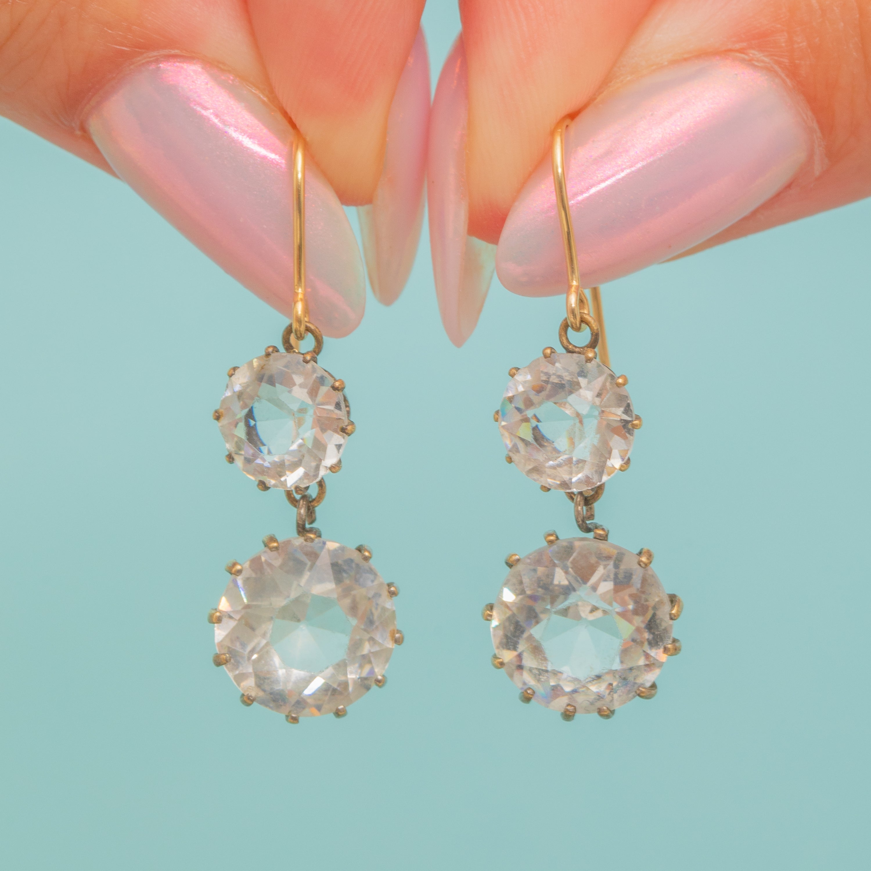 Each antique earring suspends two graduating Paste stones, each one faceted gorgeously and presenting a dazzling radiance as it catches the light. Complete with buttery 9ct Gold hooks, these Victorian earrings dance with movement as they perch beneath your lobes and are perfect for adding a touch of glamour to any attire!
