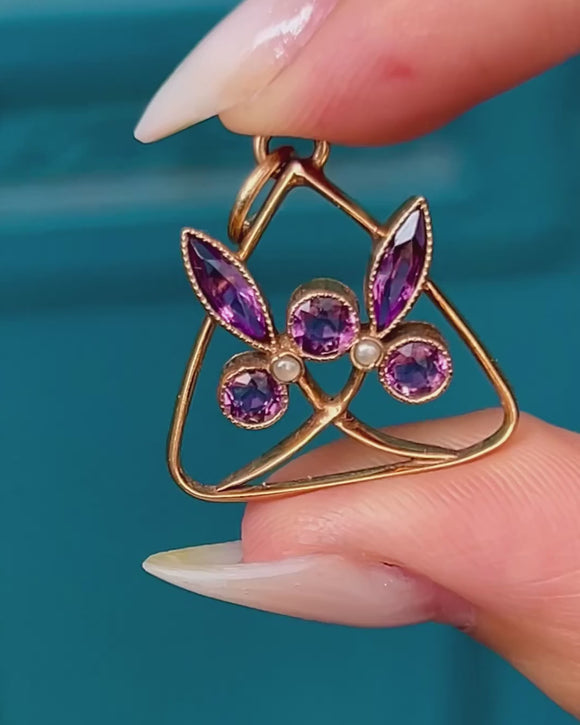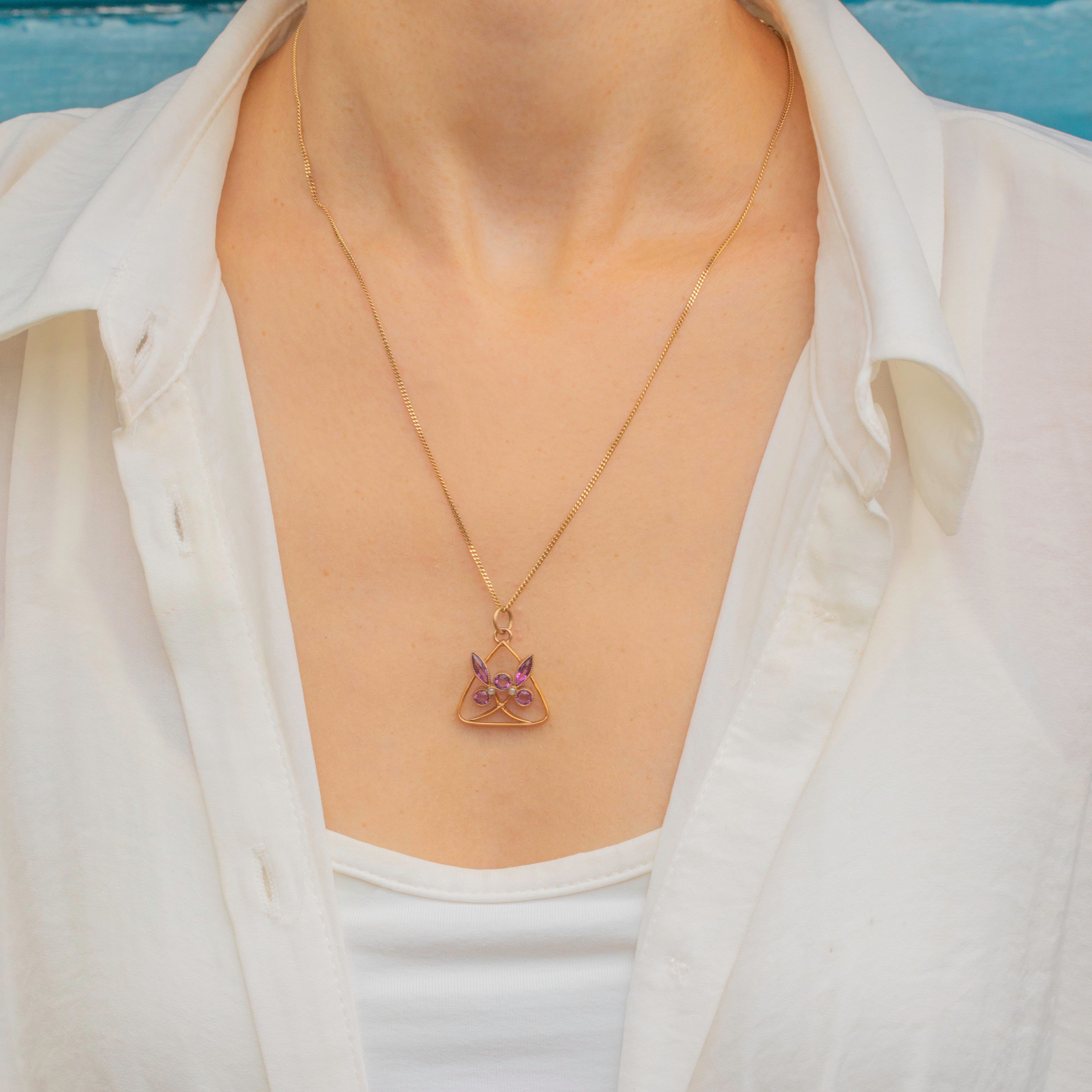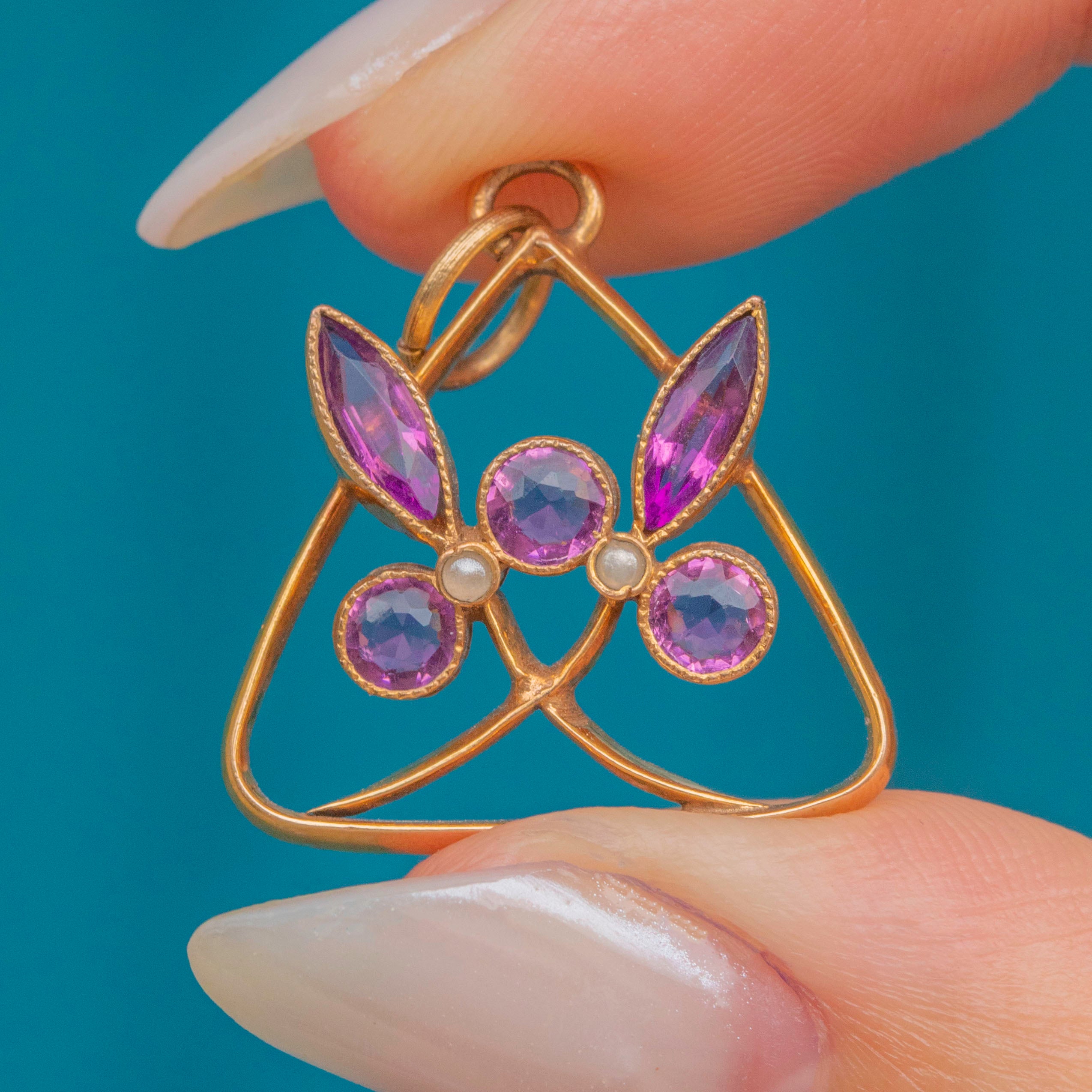 This Victorian pendant is a striking example of jewellery from the era! Gorgeous pink Paste and shimmering Seed Pearls are displayed within the curvaceous form of the pendant, giving it a floral and feminine appeal.