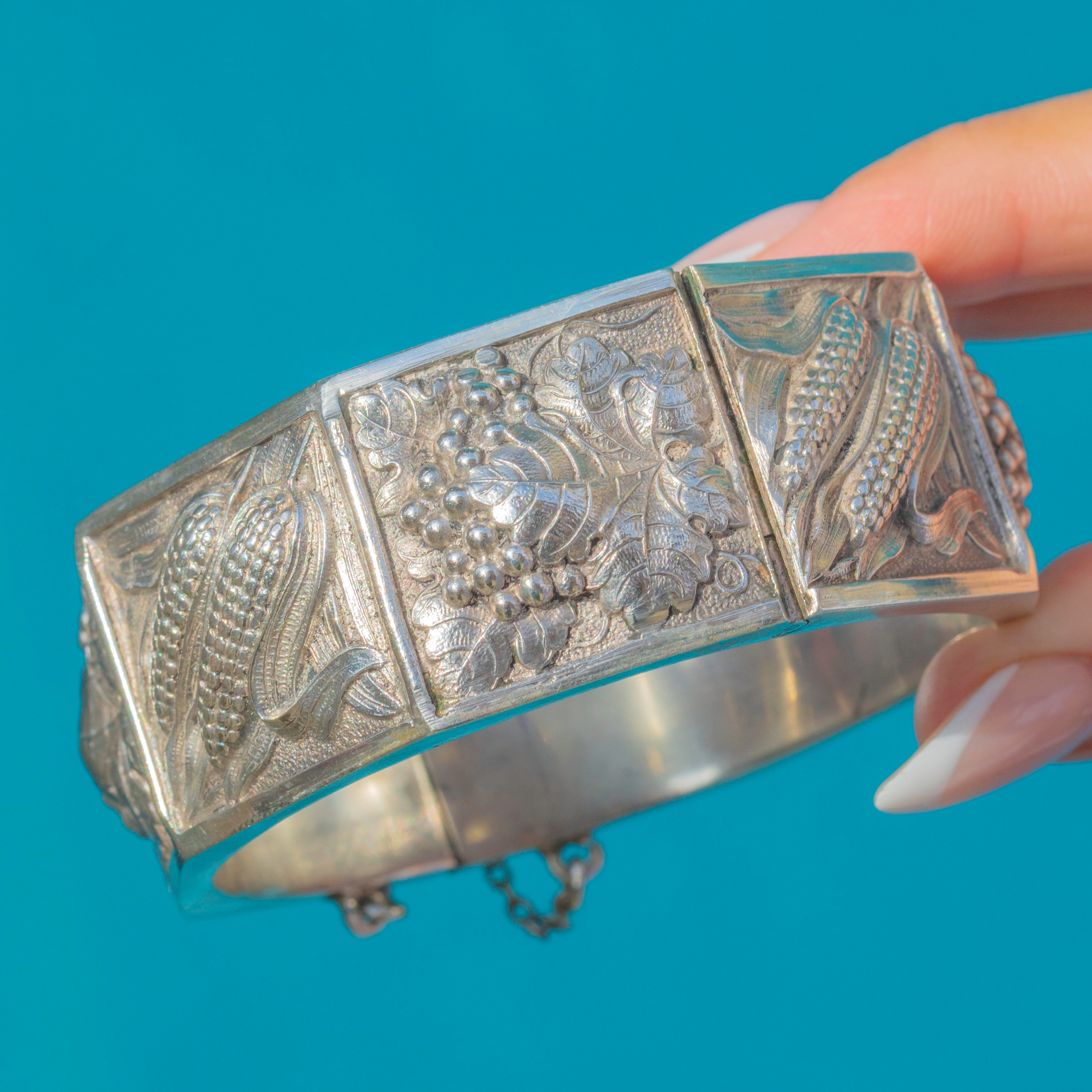 EXCELLENT. This splendid antique Portuguese Silver harvest motif bangle is in excellent condition! Each of the panels has a beautifully detailed harvest motif which has accrued a glorious patina that makes every millimetre stand out. The bangle closes securely and is complete with a safety chain for added security. The Silver has remained wonderful throughout the years and there is really no damage to note other than subtle signs of wear visible on the inside of the band.