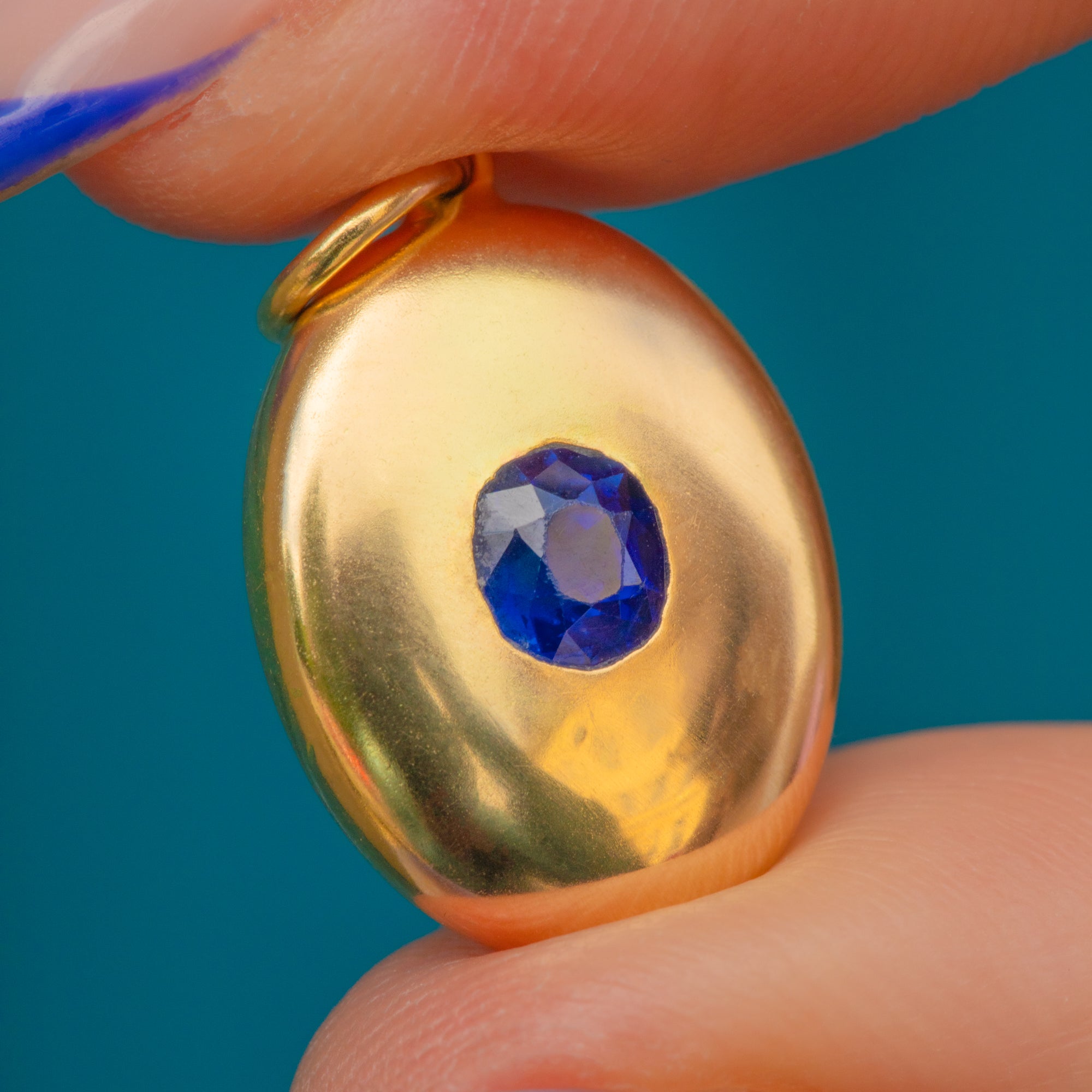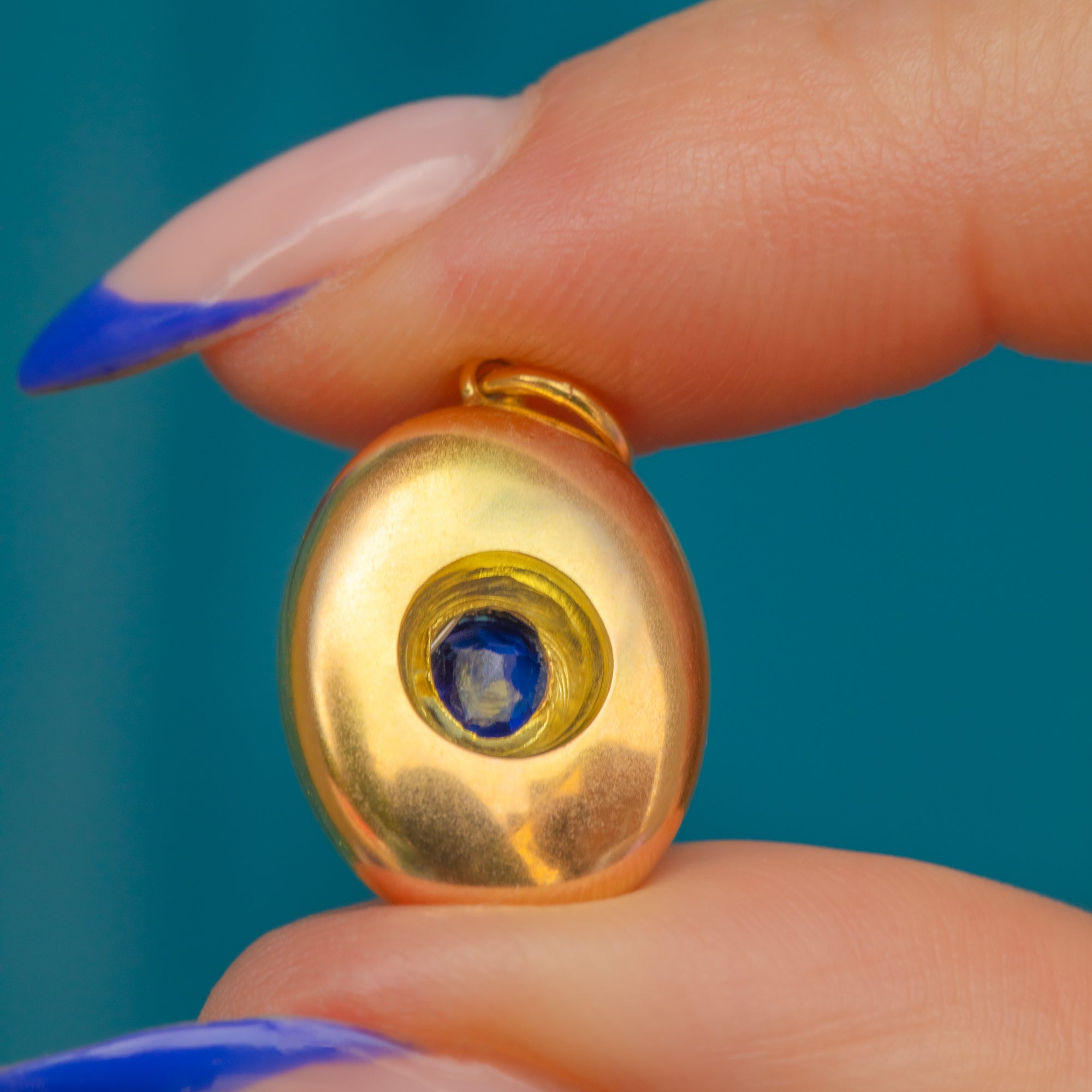 VERY GOOD-EXCELLENT. This antique puffy 18ct Gold Sapphire Charm is in wonderful condition! The Sapphire sits securely within its setting offering a mesmerising sparkle, and although there is some slight wear to the edge of the facets this can only be seen under close inspection. The 18ct Gold has wonderful reflective qualities with a mouthwatering buttery hue throughout. Suspended from a soldered jump-ring, you can wear this Sapphire pendant with the utmost confidence!