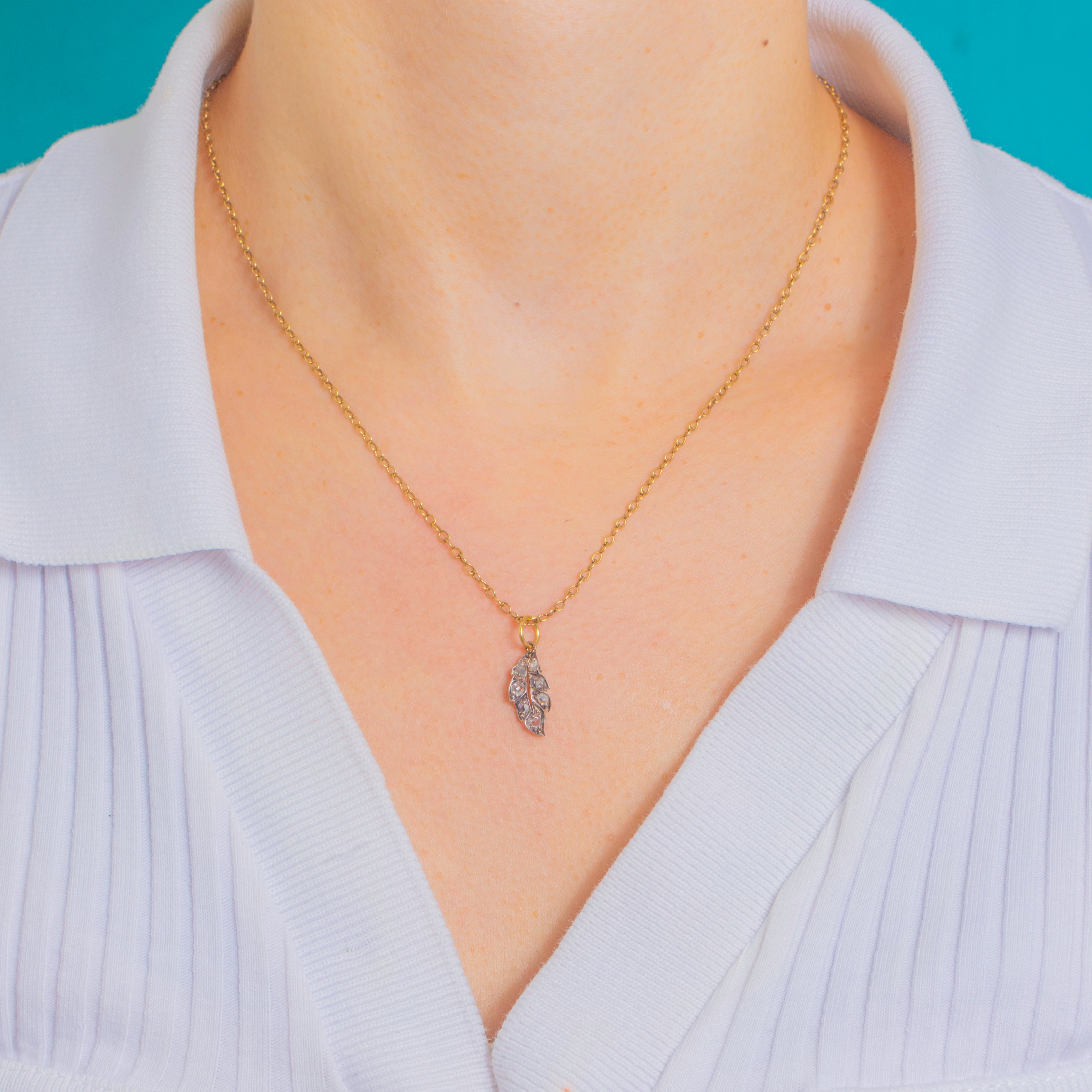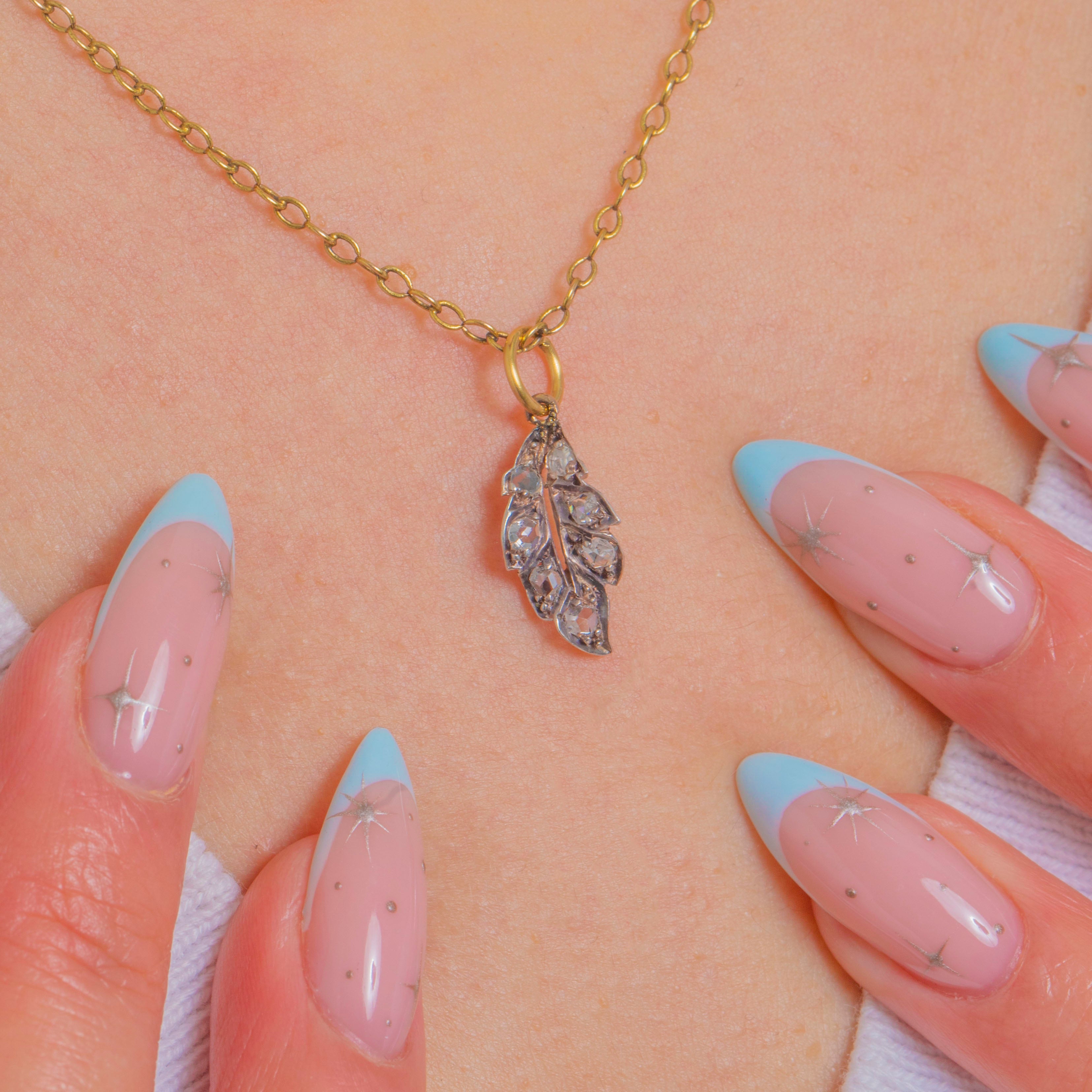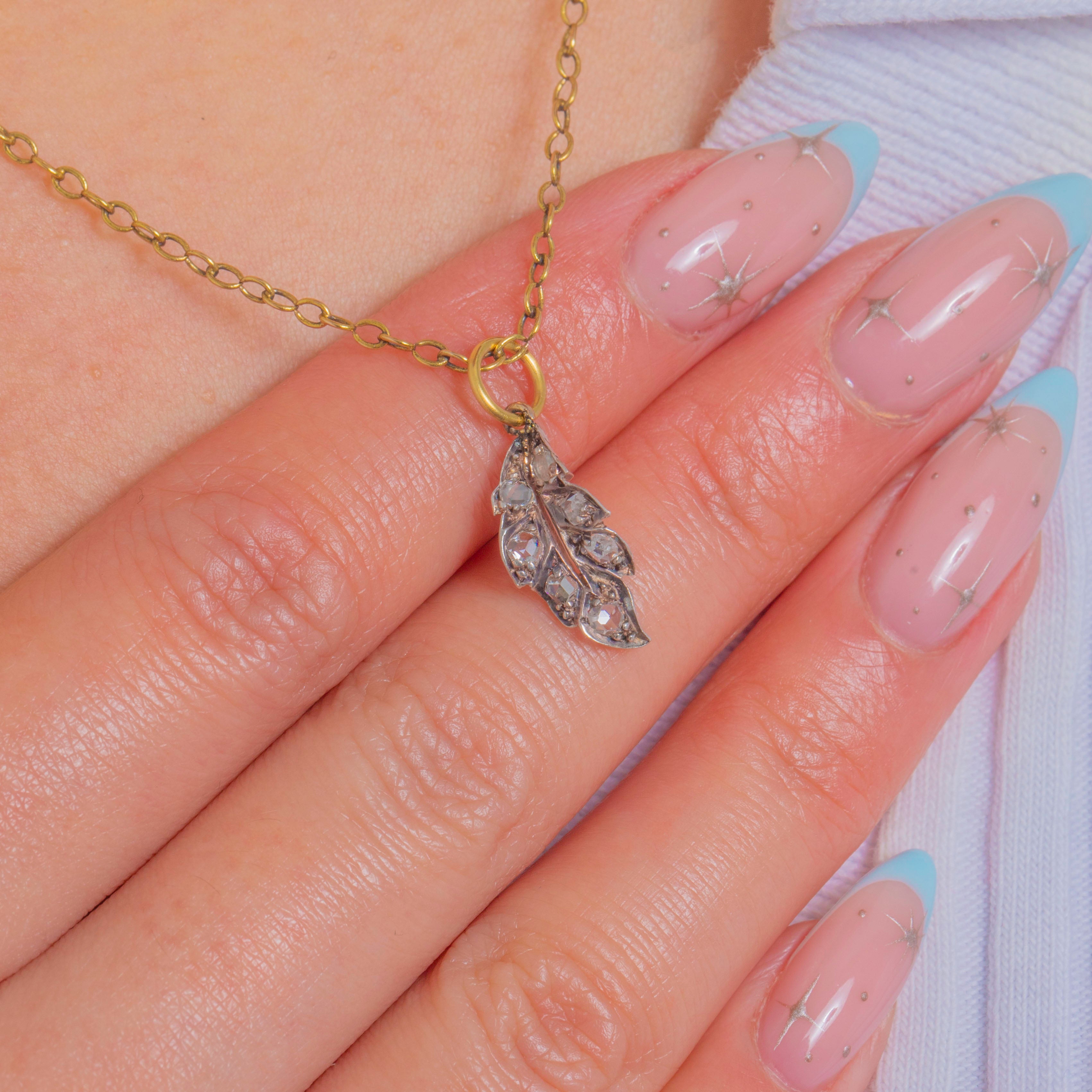 Delicate and romantic, this Victorian leaf charm is ablaze with tiny rose-cut Diamonds that twinkle softly with every movement. Hand-crafted in classic Silver-topped Gold, the naturalistic foliate silhouette is defined by a central vein, softly curved edges and fine bead settings for that beautiful antique texture.