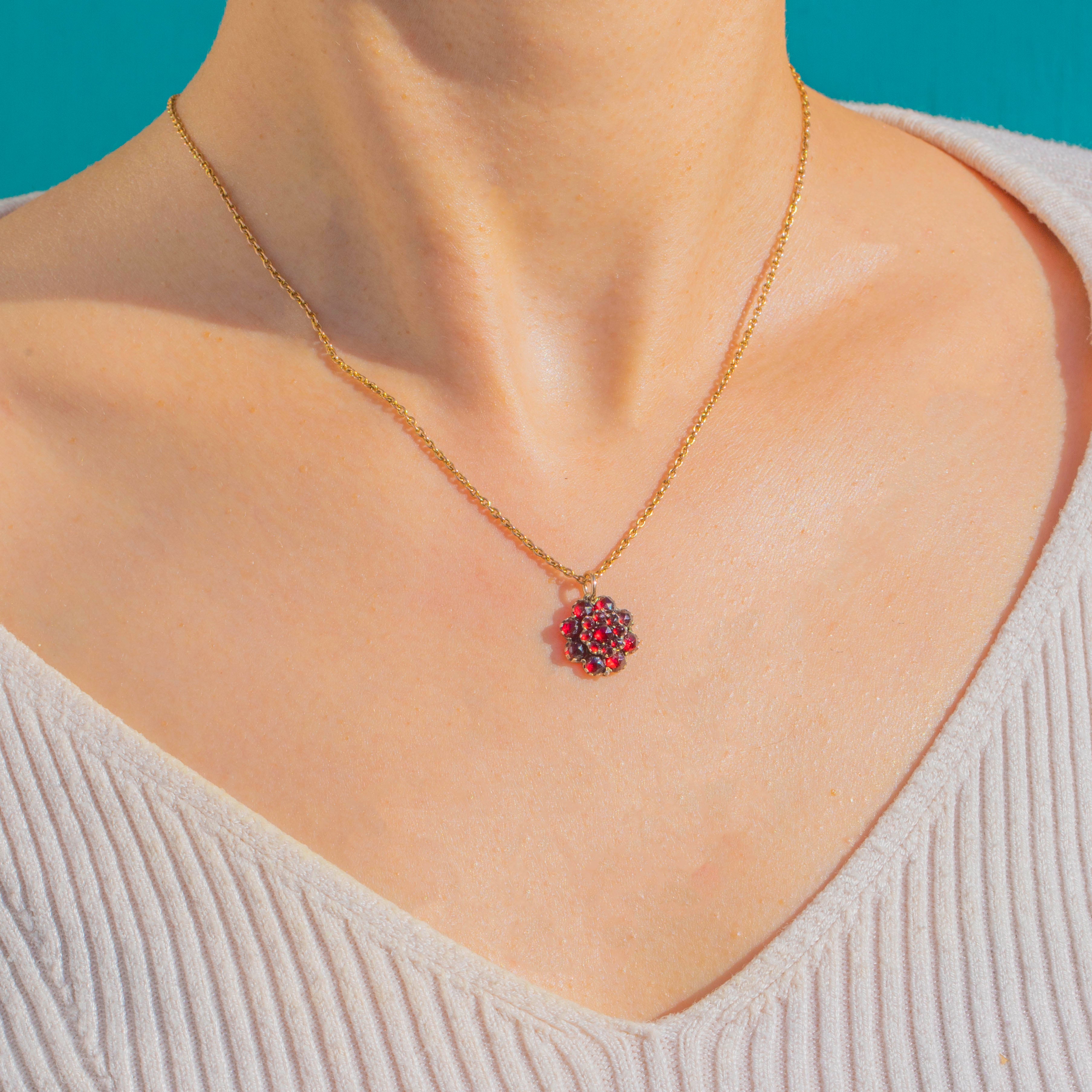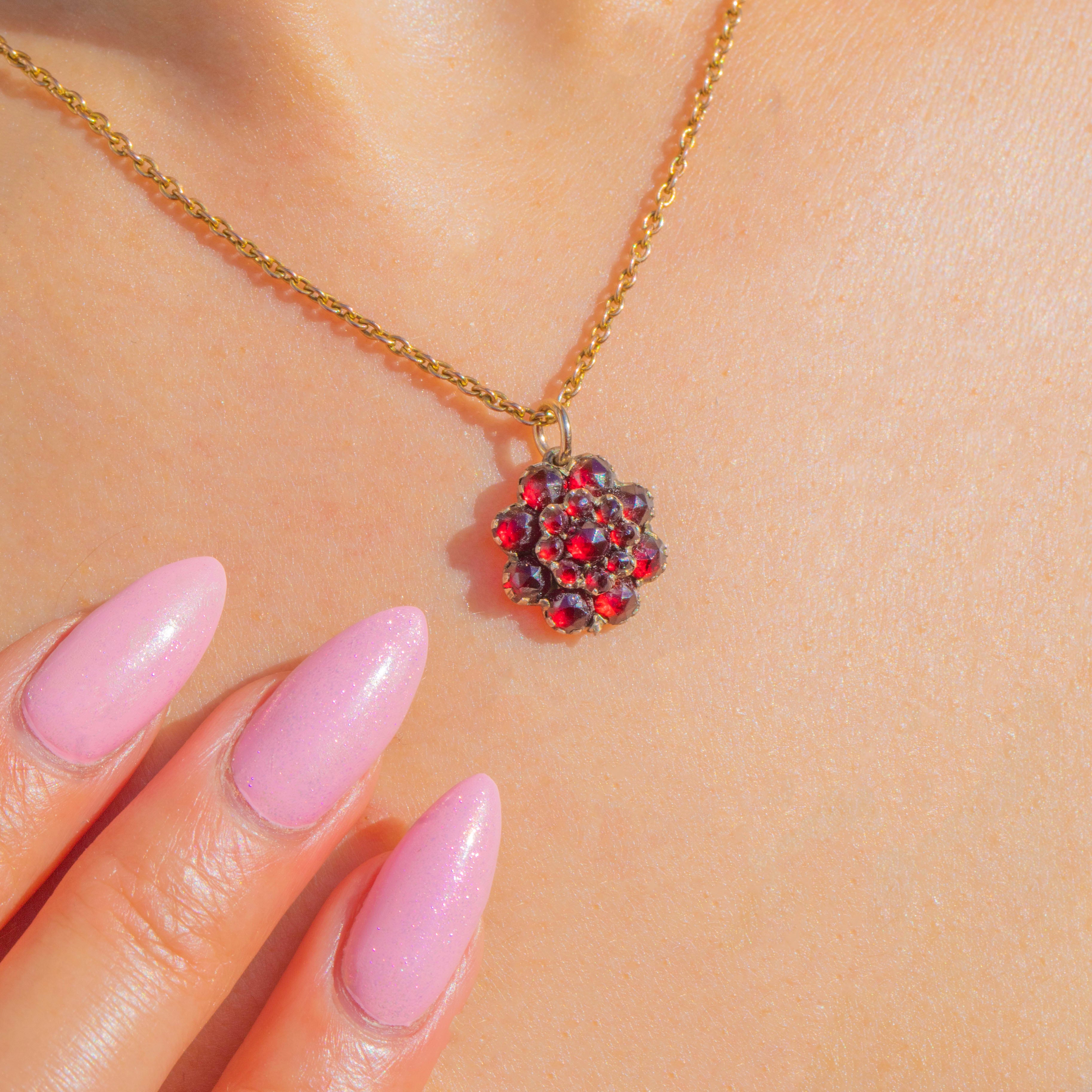 This antique Victorian charm is a wonderfully sweet little flower cluster, set throughout with glowing rose-cut Garnets in rich wine-red tones. The domed floral arrangement gives the piece lovely depth and texture, while the faceted stones catch the light beautifully.