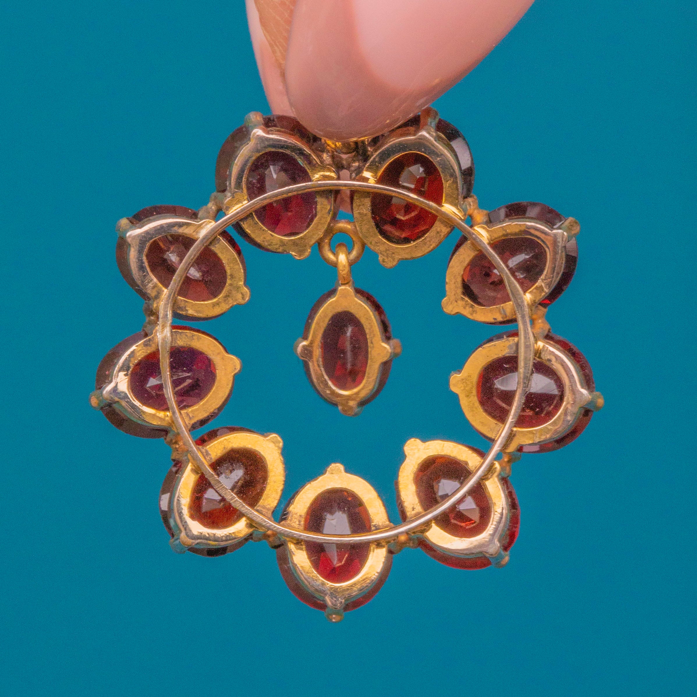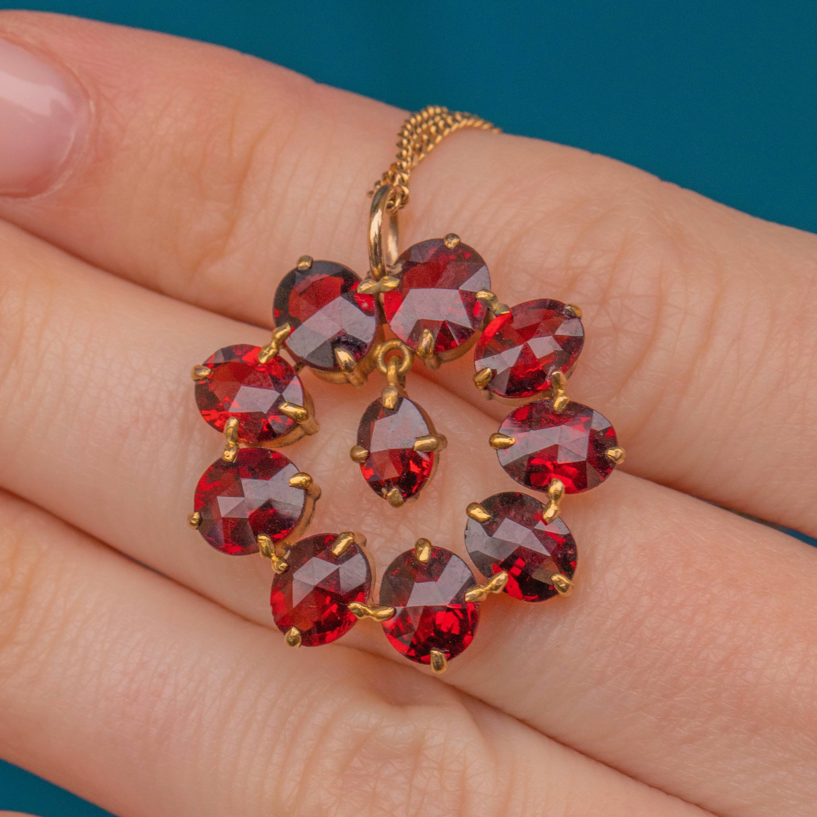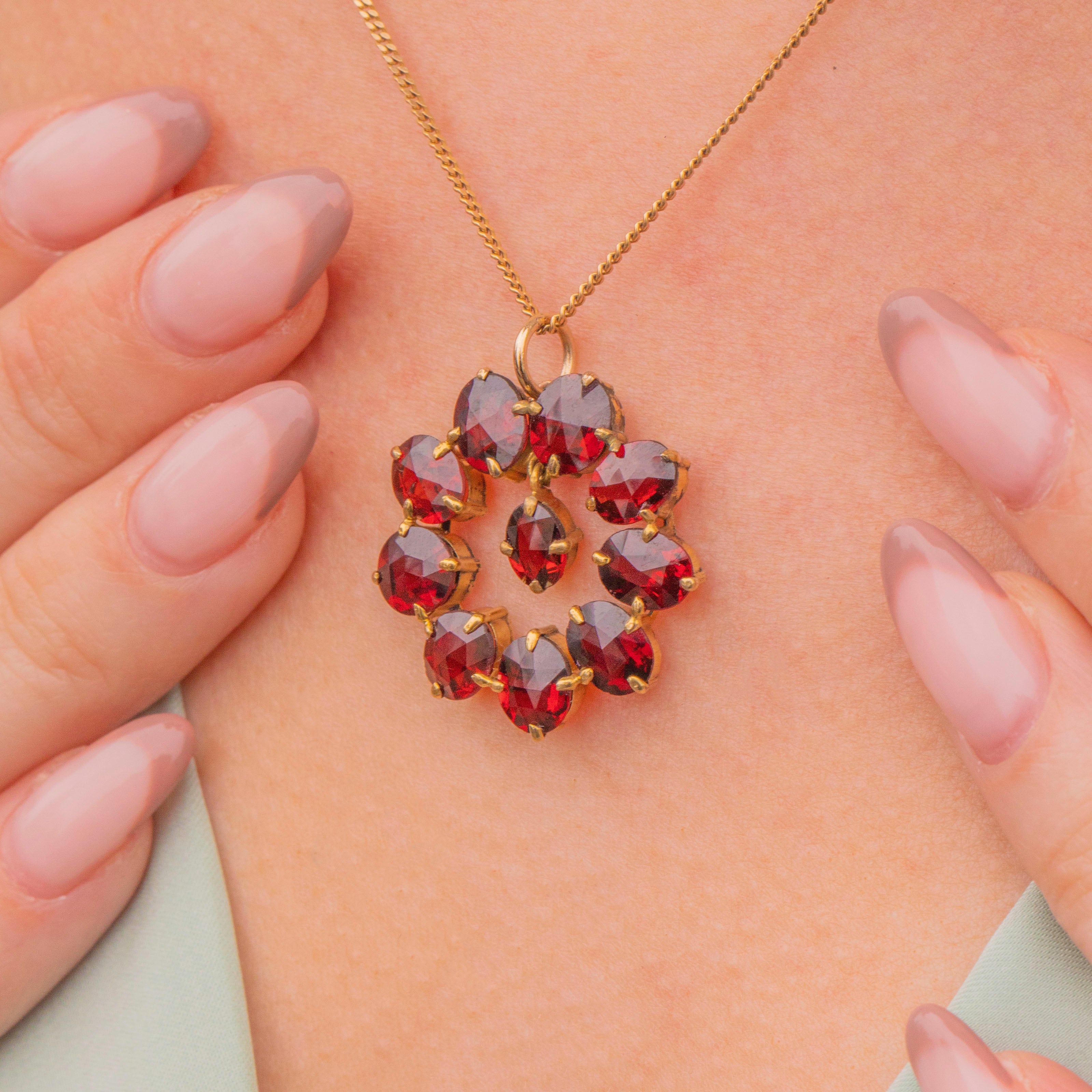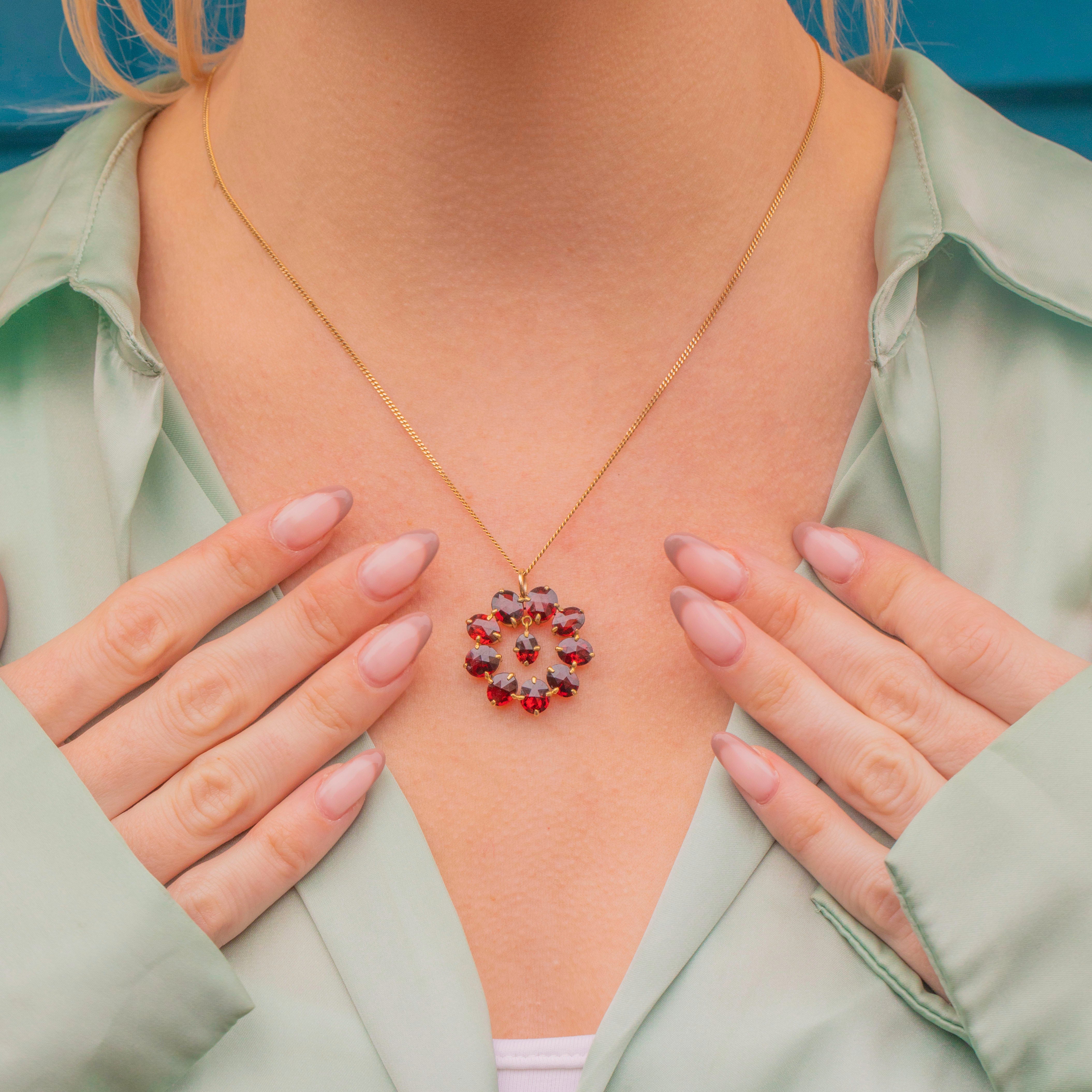 Crafted from buttery 9ct Gold, this roundel pendant features ten brilliant Garnets, boasting 8.86ct. Each Garnet radiates a rich, crimson hues from their gorgeous facets, and is complimented effortlessly by the warmth of their settings.