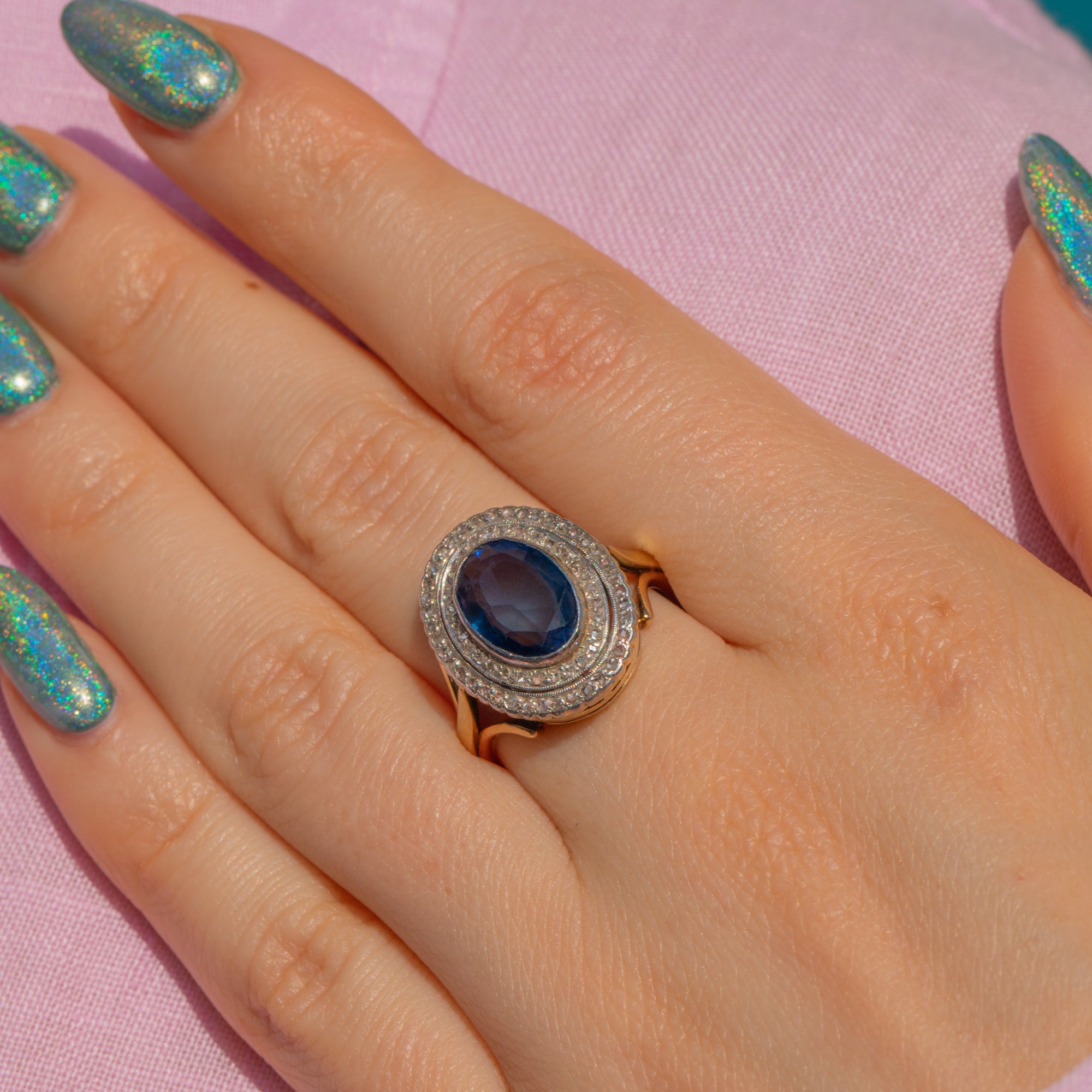 This antique Sapphire and Diamond oval cluster ring is an absolute showstopper! Centred by a 1.40ct Sapphire flaunting spellbinding midnight blue hues, she is haloed by not one but two rows of dainty Diamonds, each one with a characterful sparkle that will make you weak at the knees.
