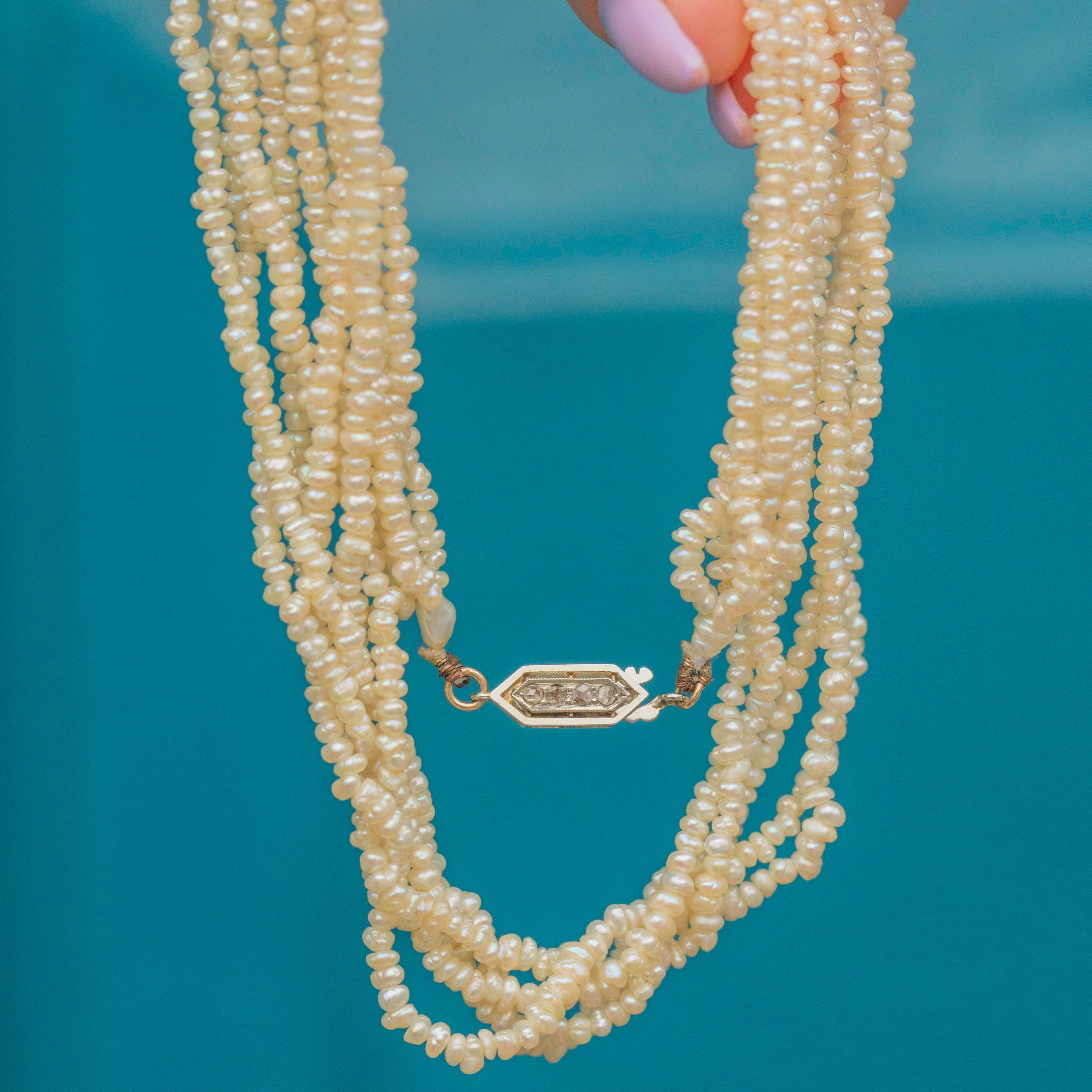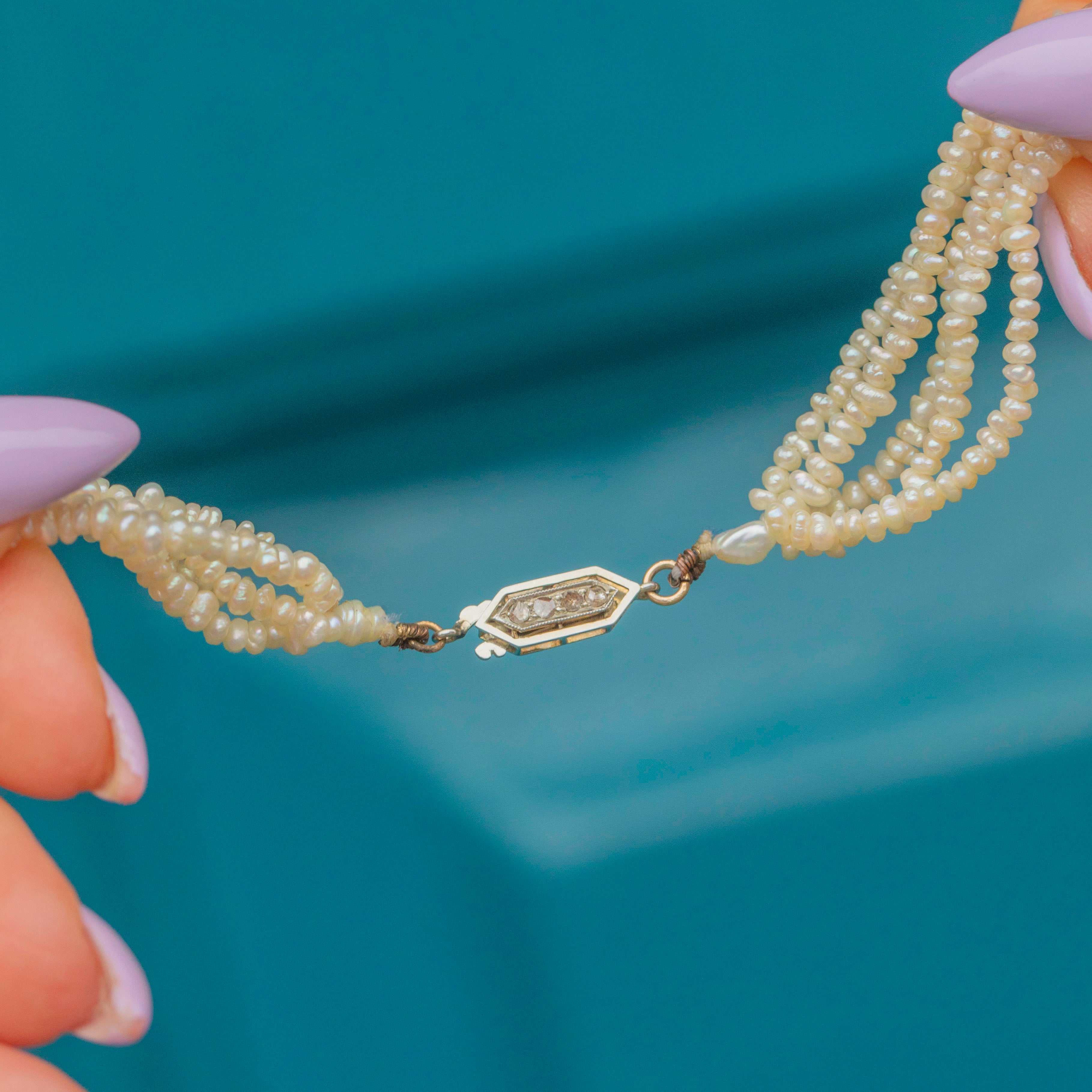 EXCELLENT. This antique Seed Pearl five strand necklace is in superb condition. Each of her Pearls is lustrous and secure, as are the rose-cut Diamonds. With her clasp in perfect working condition and a fitted box for extra security, she is a true must-have!