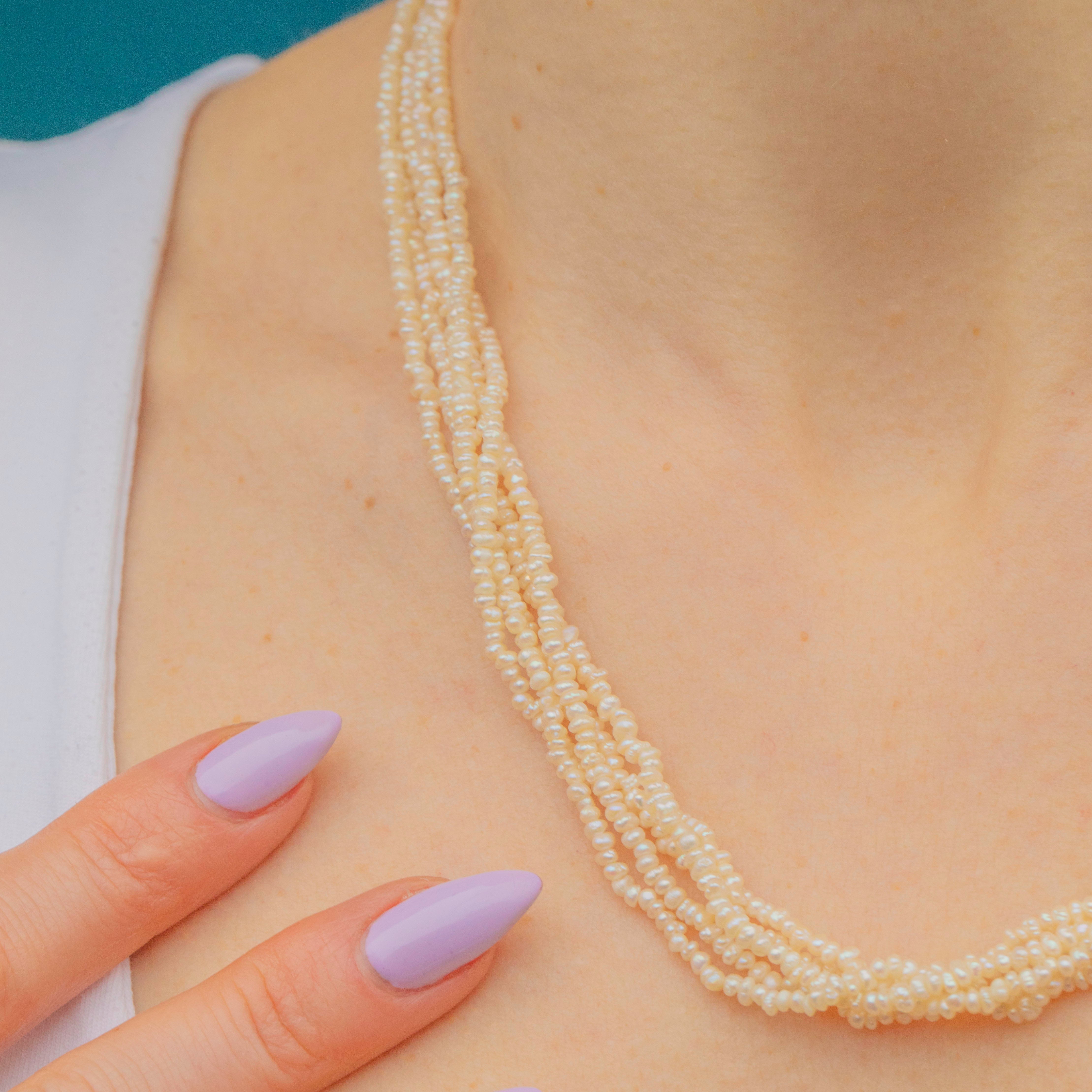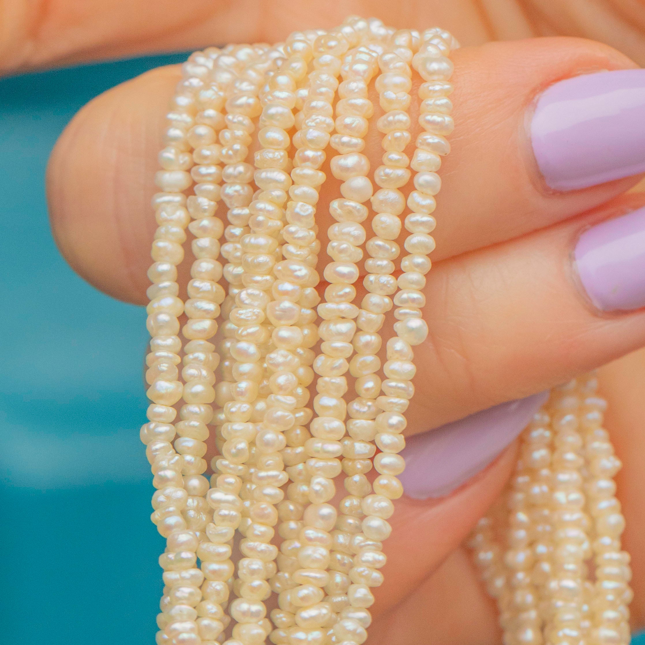 Radiating a timeless sophistication, this Edwardian necklace consists of five strands of delicate natural seed Pearls, each displaying a magnificent iridescence as they catch the light.