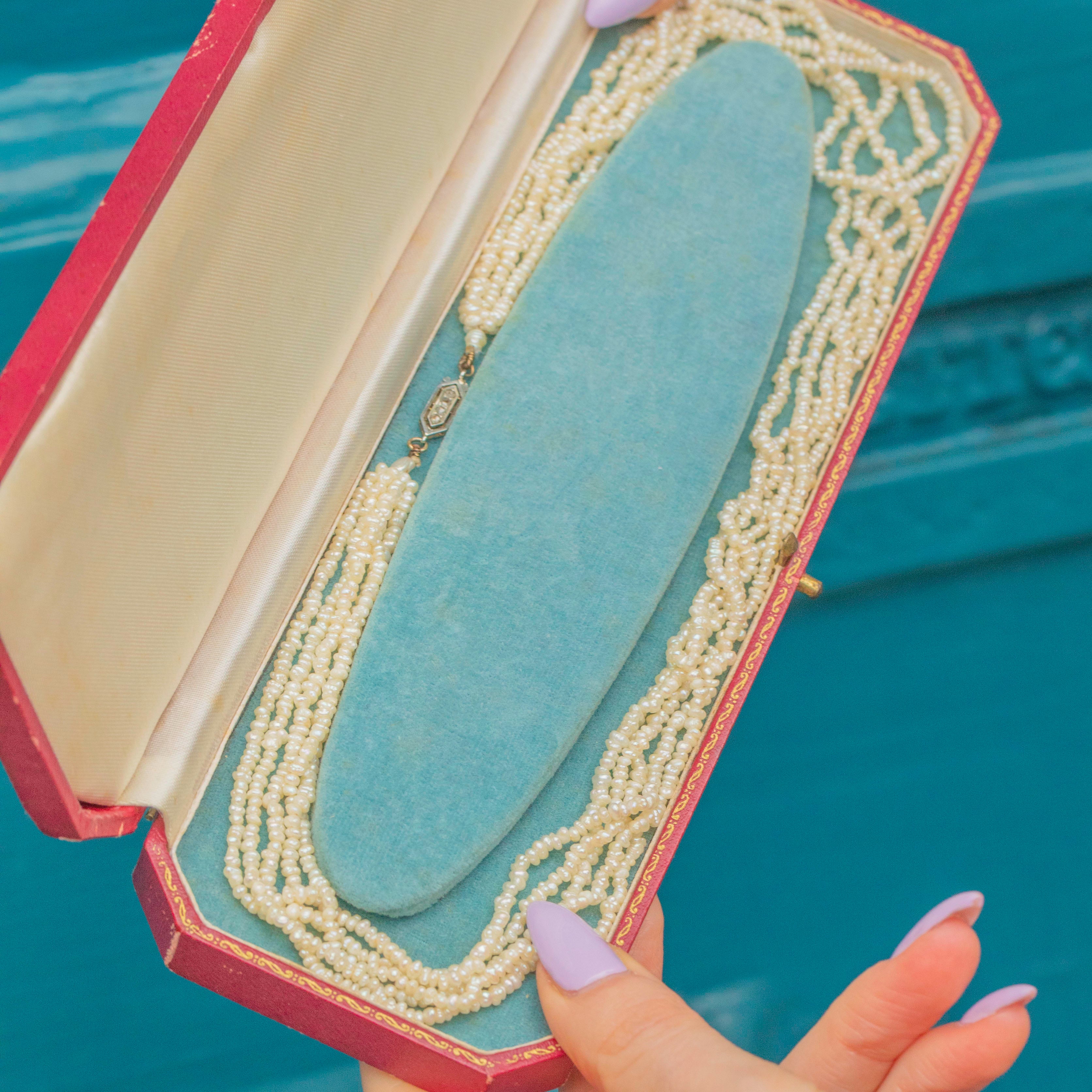 Antique Seed Pearl Five Strand Necklace- 18ct Gold Diamond Clasp, Fitted Box
