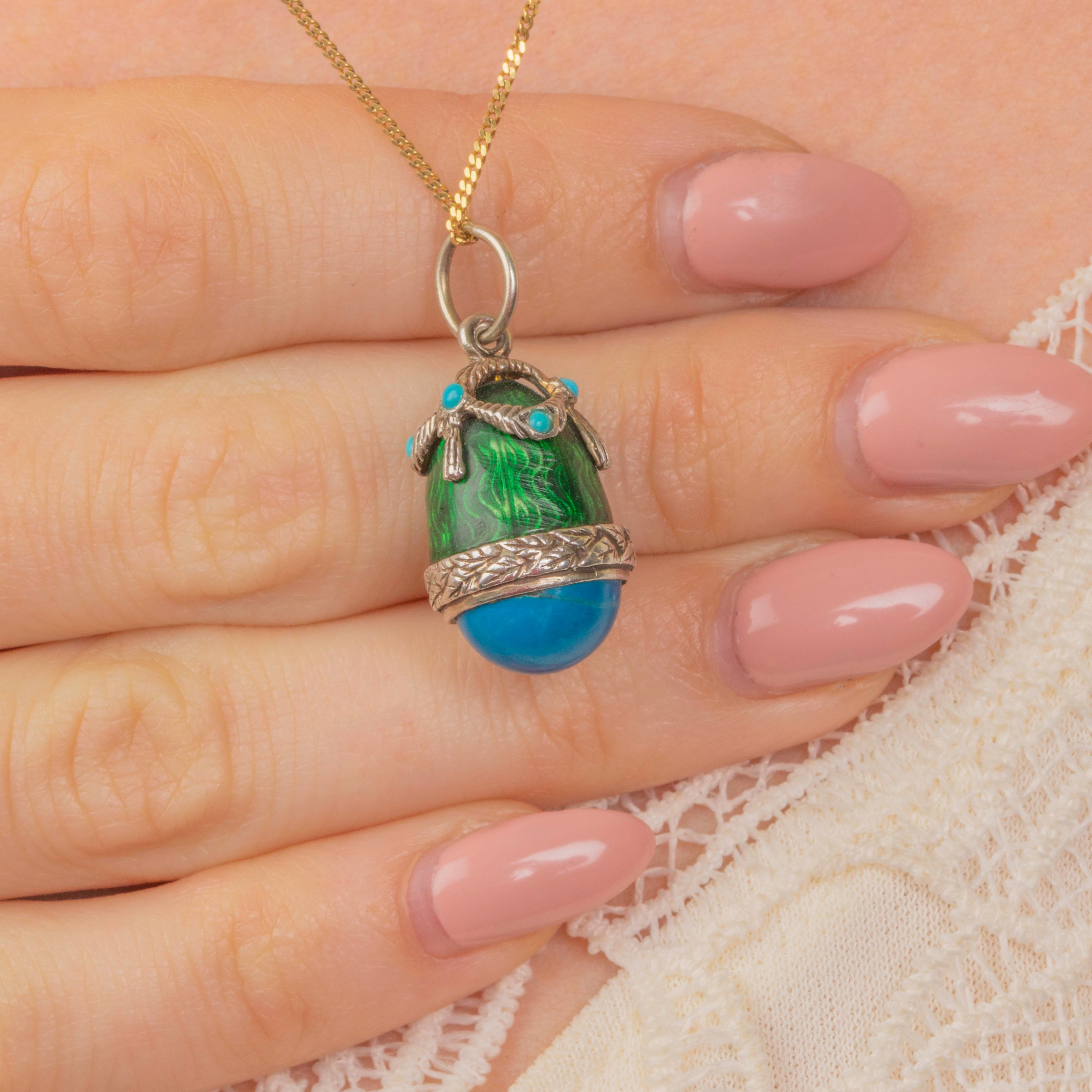 EXCELLENT. This antique Silver Blue & Green Enamel egg pendant is in excellent condition. The vibrant Green and Blue Enamel is free from chips or cracks, while the Silver band features well-defined engravings. The bale and setting exhibit a lovely light patina. Overall, this pendant is a beautifully preserved piece ready to be enjoyed.