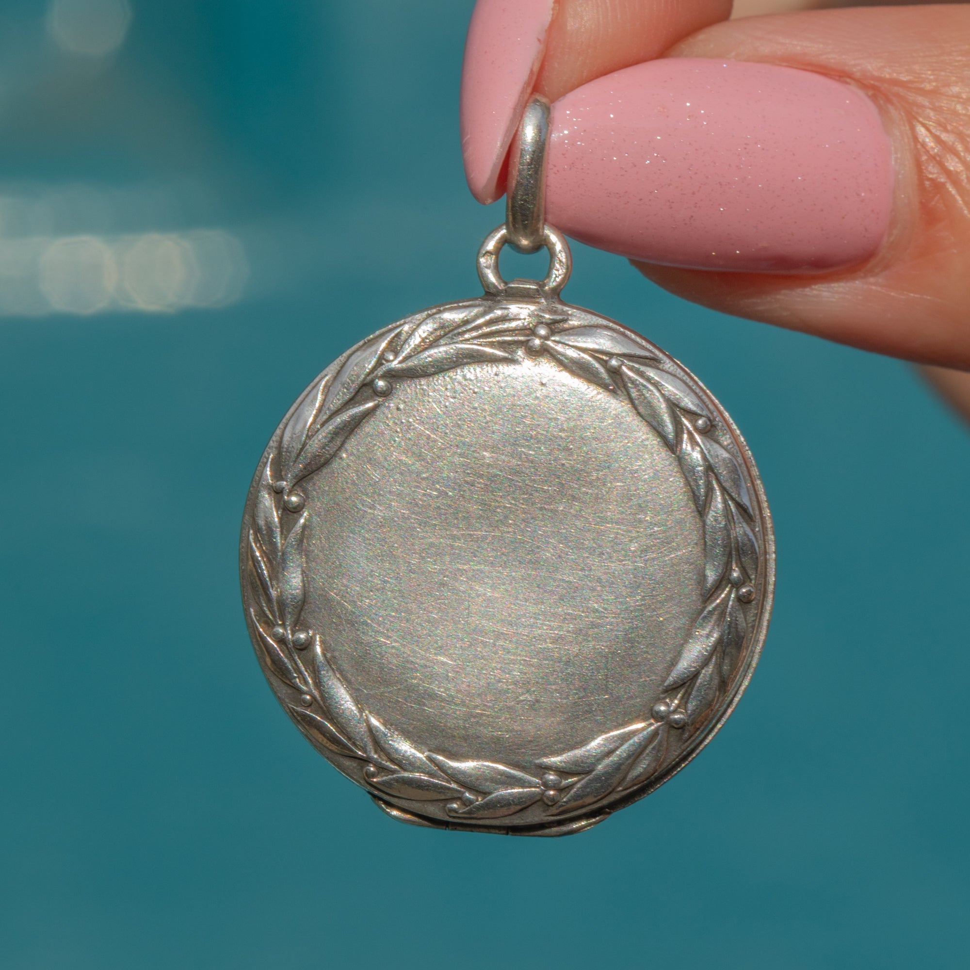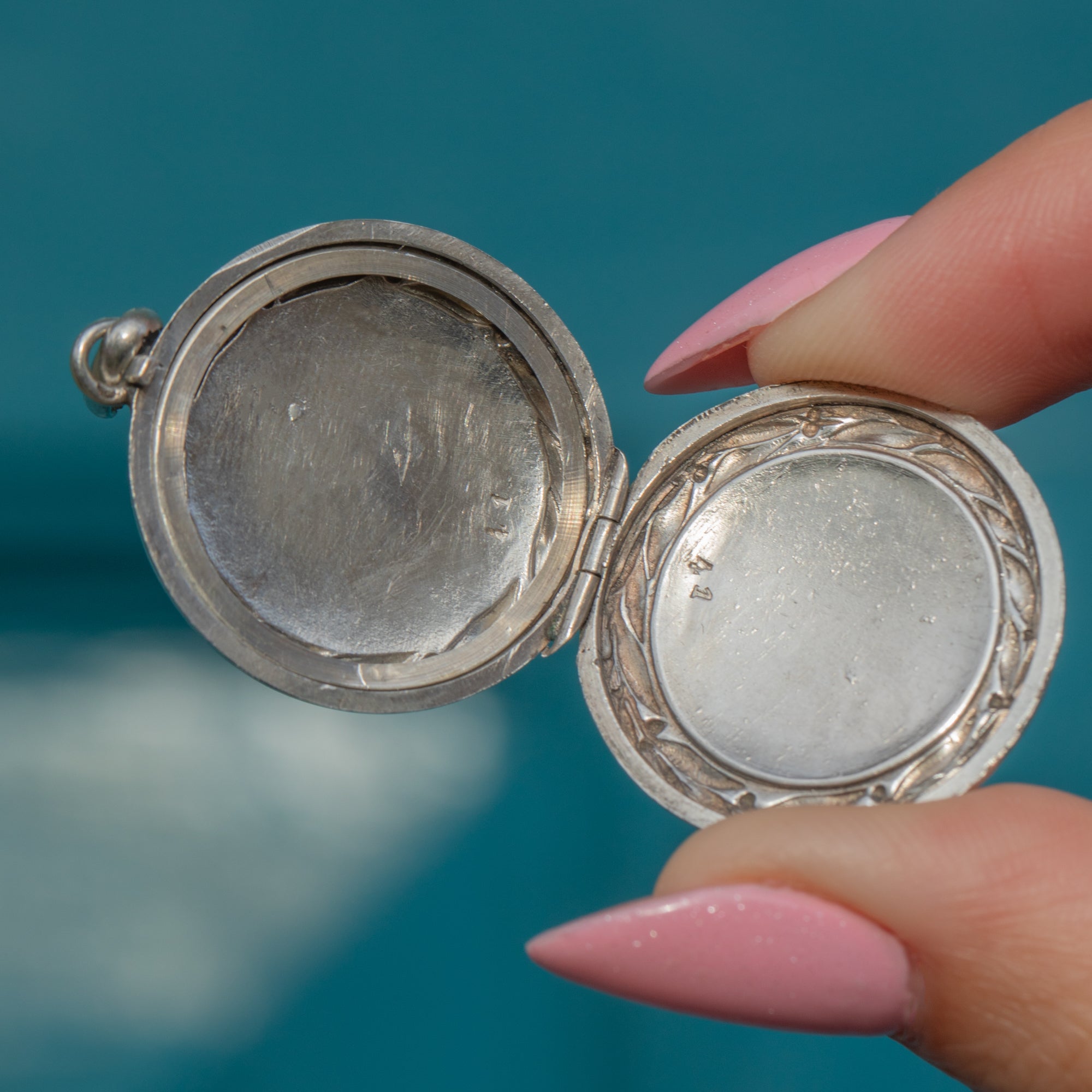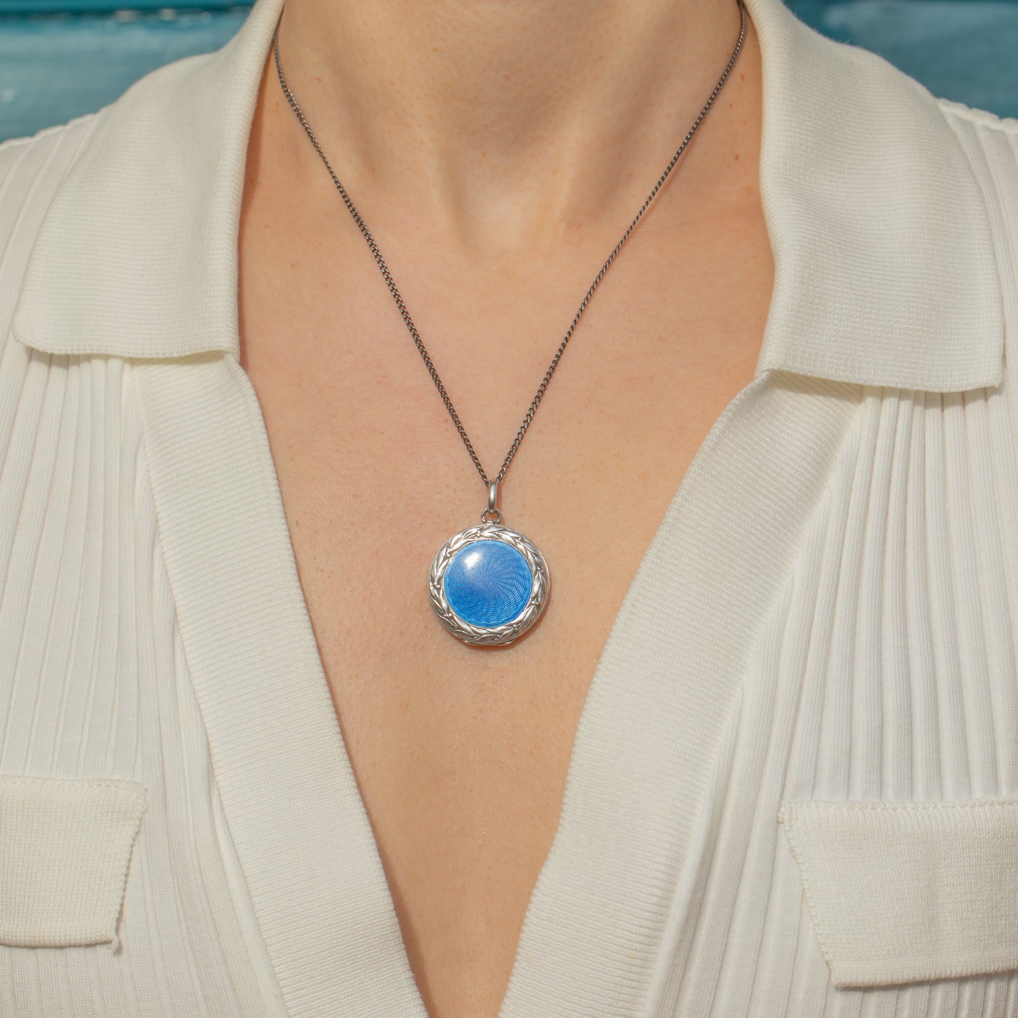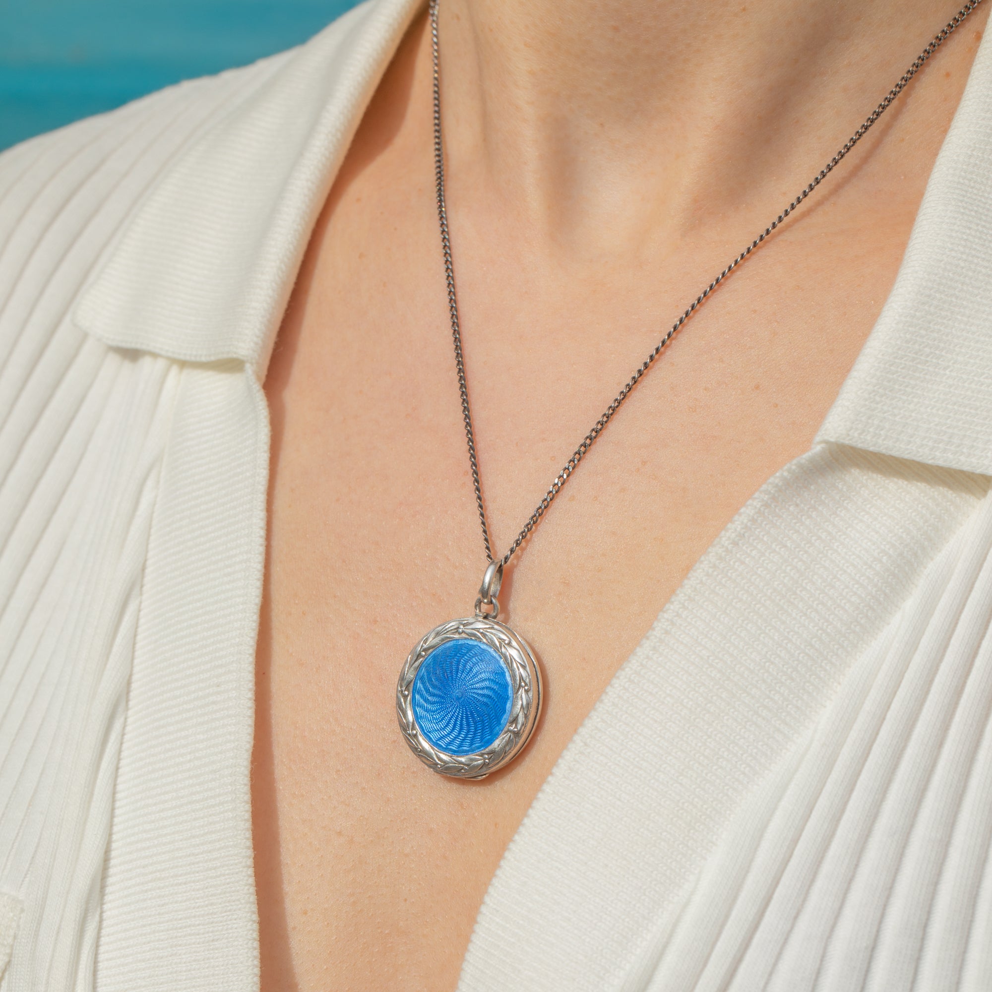 This exquisite Art Nouveau Silver cornflower blue Guilloché Enamel locket is nothing short of delightful! The radiant, soft blue Enamel is accented by delicate Guilloché detailing, which shimmers beneath the surface, giving the piece depth and grace with every turn.