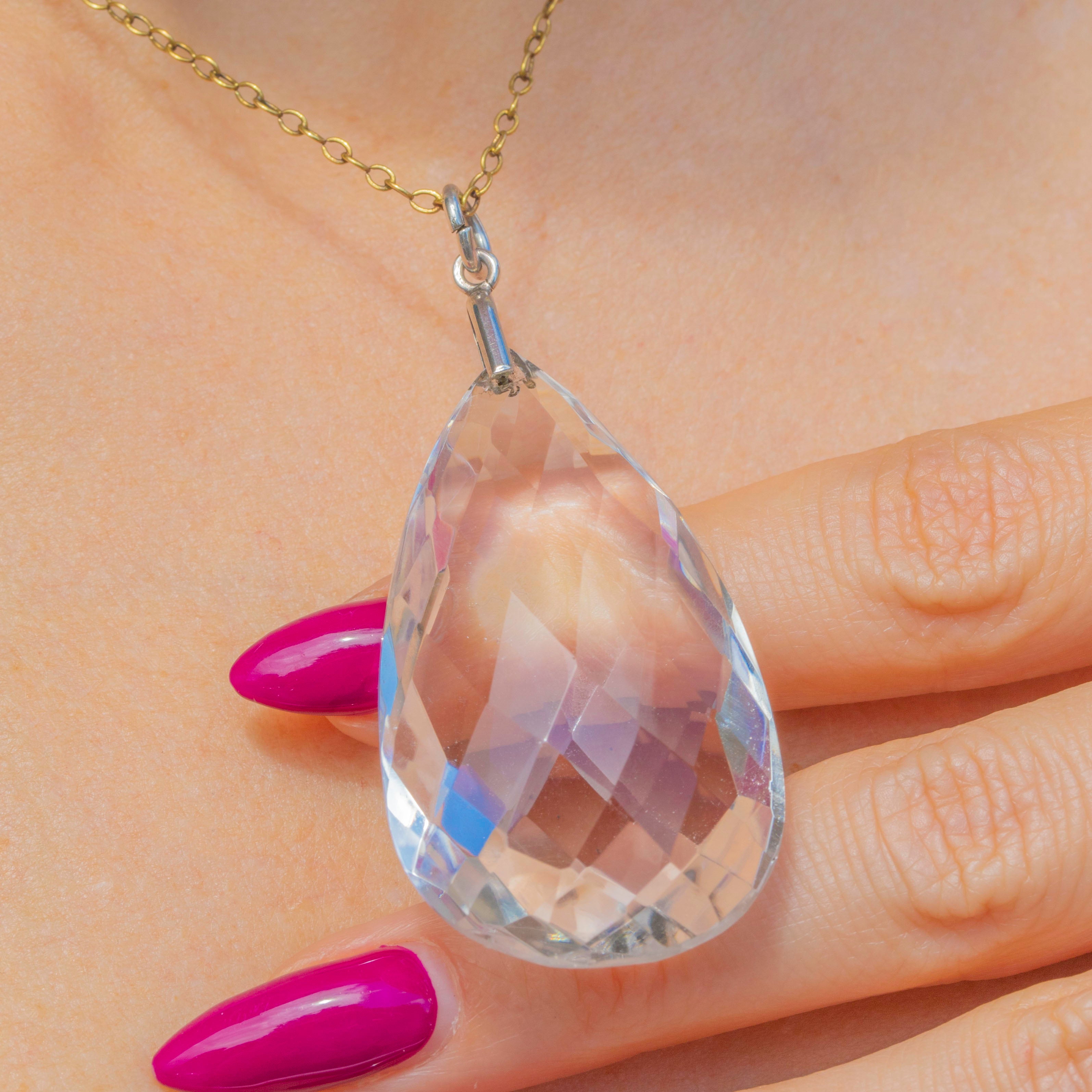 This Art Deco Rock Crystal pendant will add a bold, glimmering accent to your décolletage! The 61.90ct pear-cut Rock Crystal creates a wonderful display as its large, geometric facets catch the light.