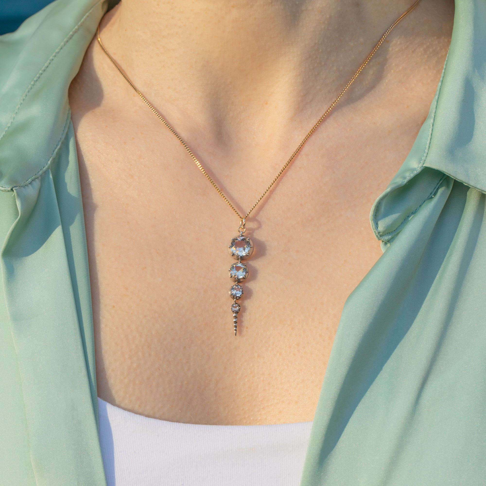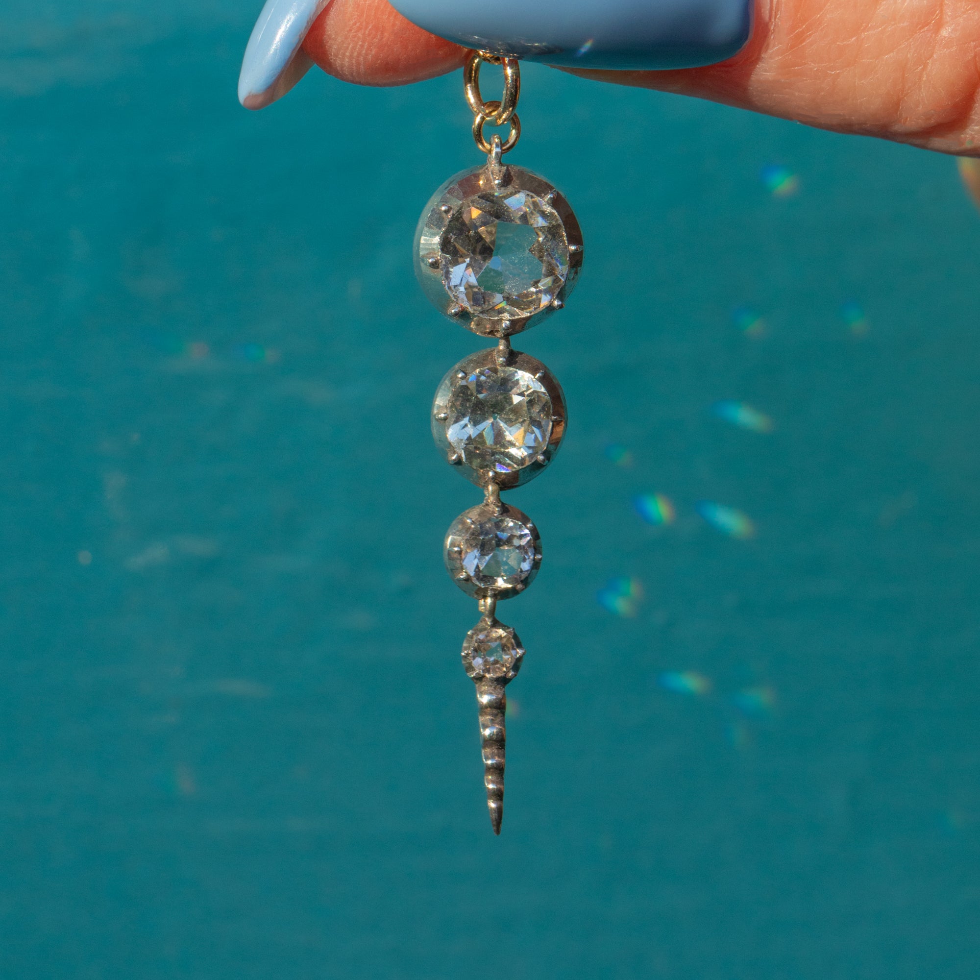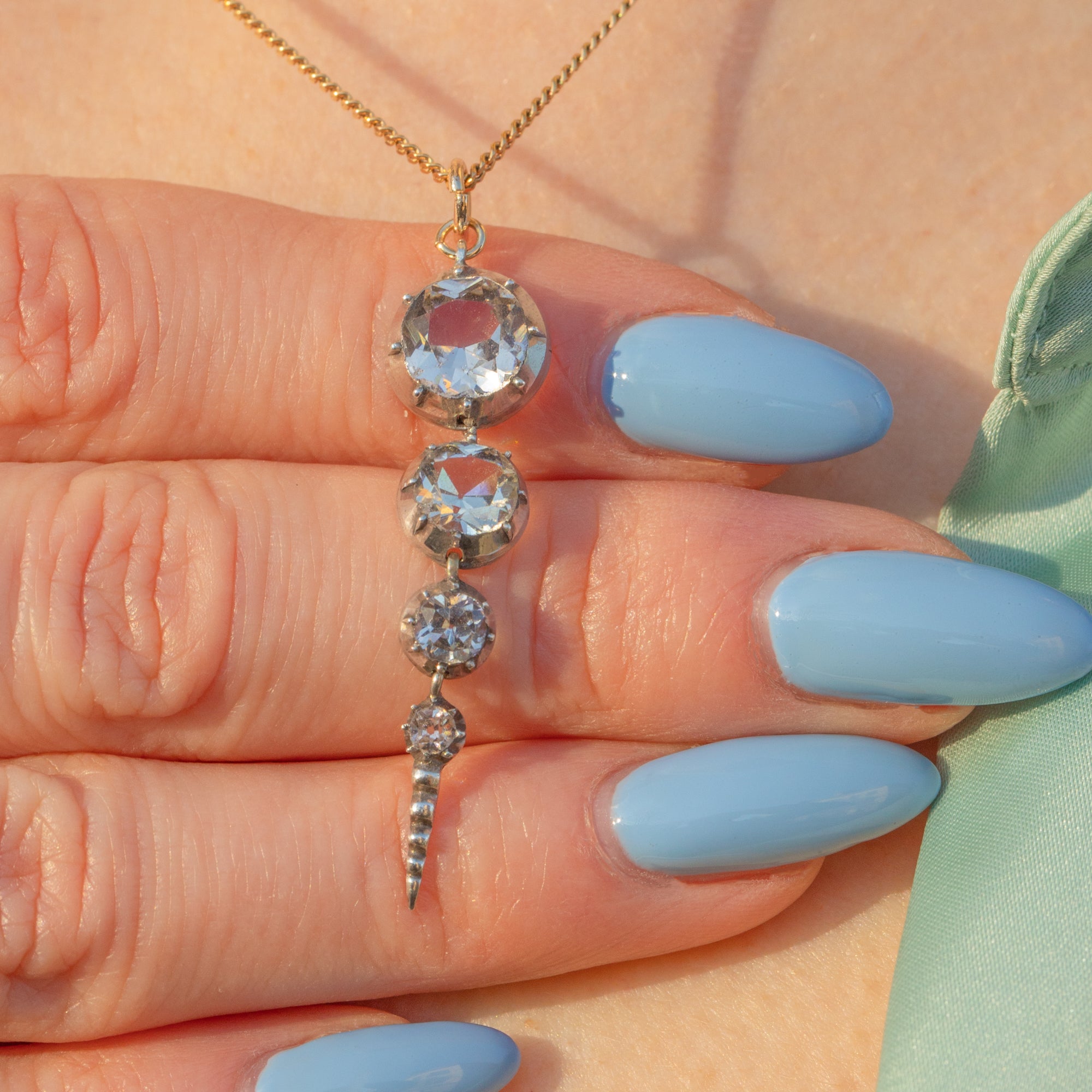 This elegant antique Silver Paste drop pendant features four dazzling Paste stones, graduating from a large stone at the top to a smaller one at the bottom. The graceful design moves fluidly, evoking the mesmerising sway of a scintillating snake.
