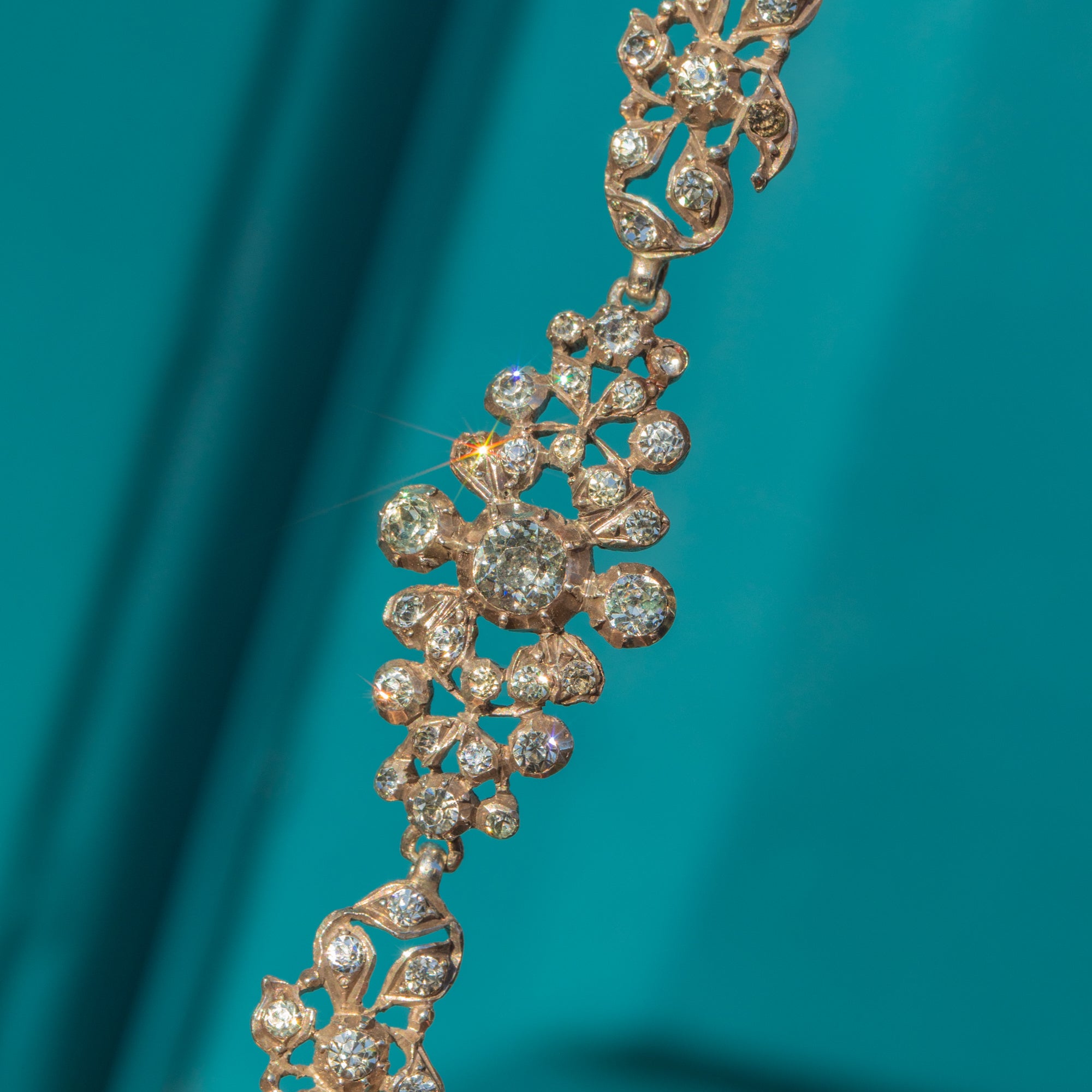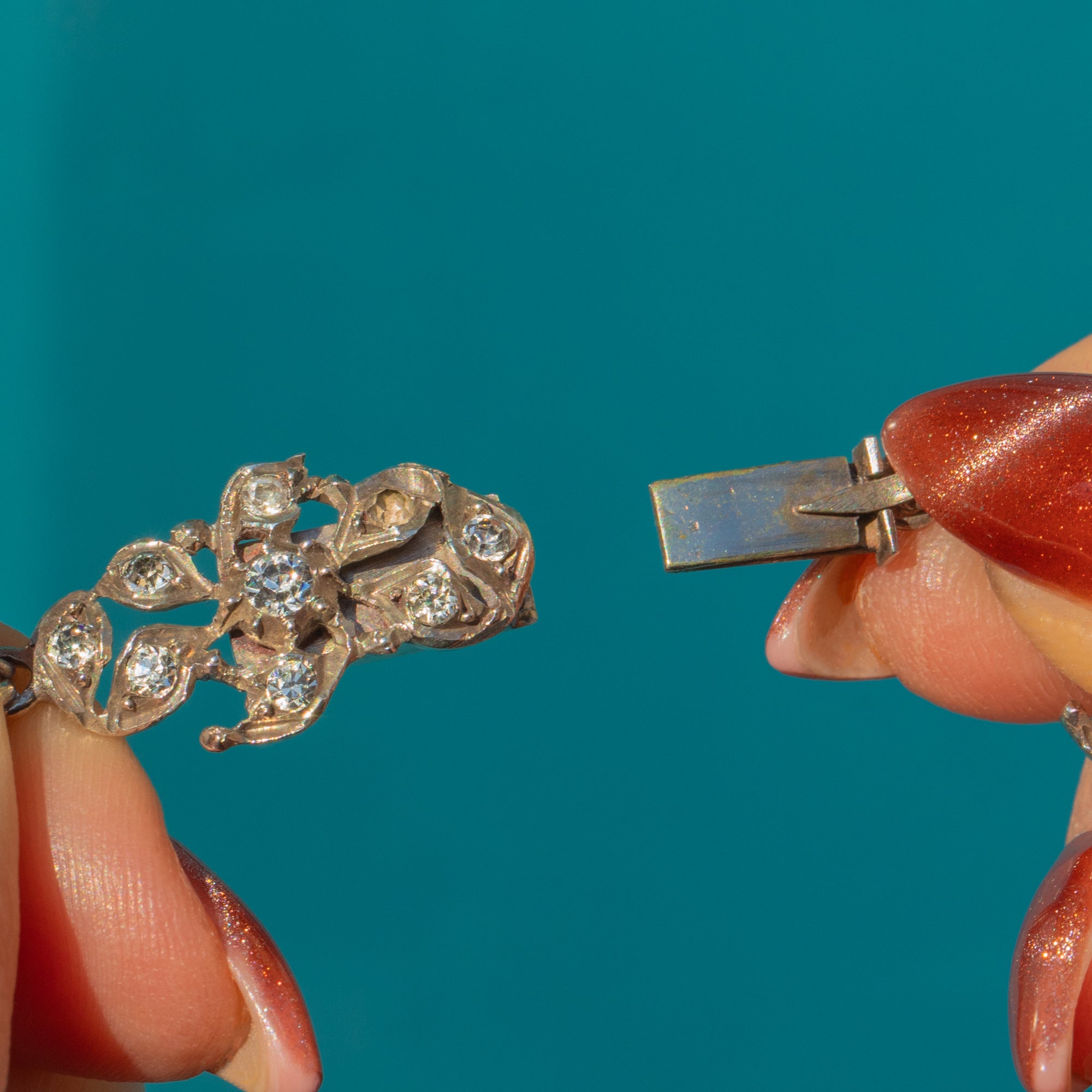 VERY GOOD. This antique Silver Paste floral bracelet is in very good condition. She is crafted wonderfully and has a lovely sparkle. The Paste stones are securely set, although some have a darkened or dulled colour, likely having been replaced over time. There are some signs of wear to the Silver on the inside of the bracelet commensurate with age, which cannot be seen when wearing. The links are securely affixed and the tongue clasp is in perfect working condition, so you can wear this splendid Victorian bracelet with absolute confidence!