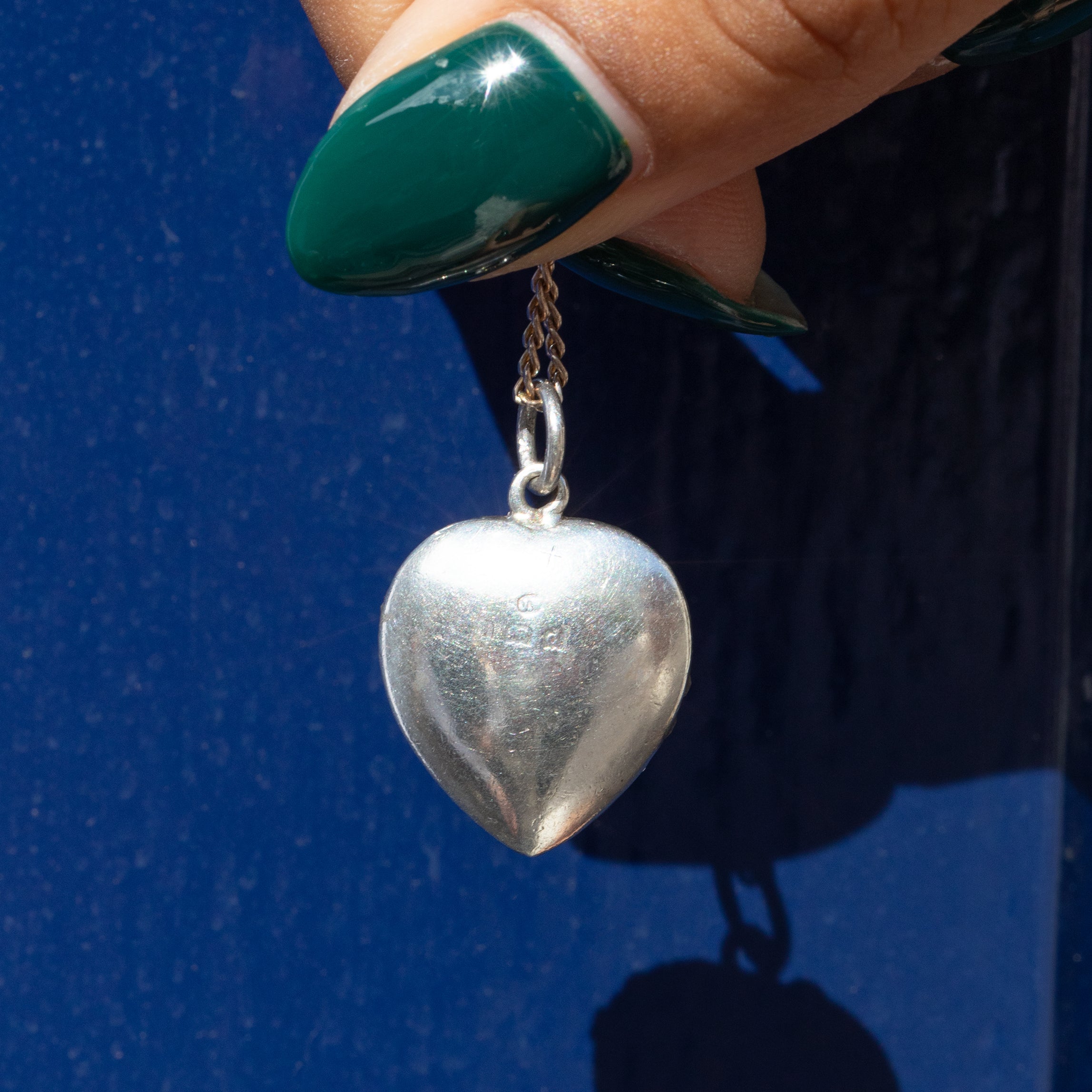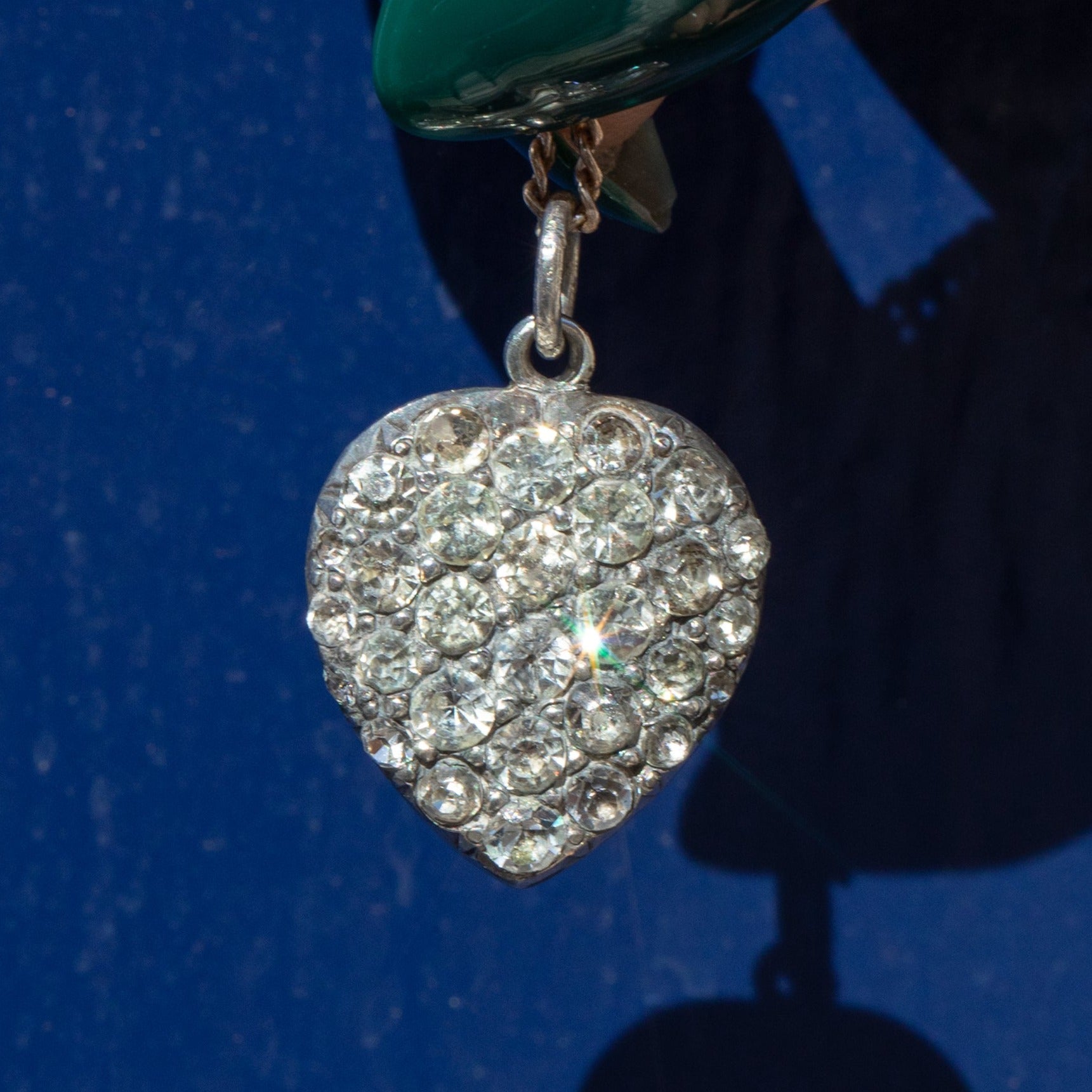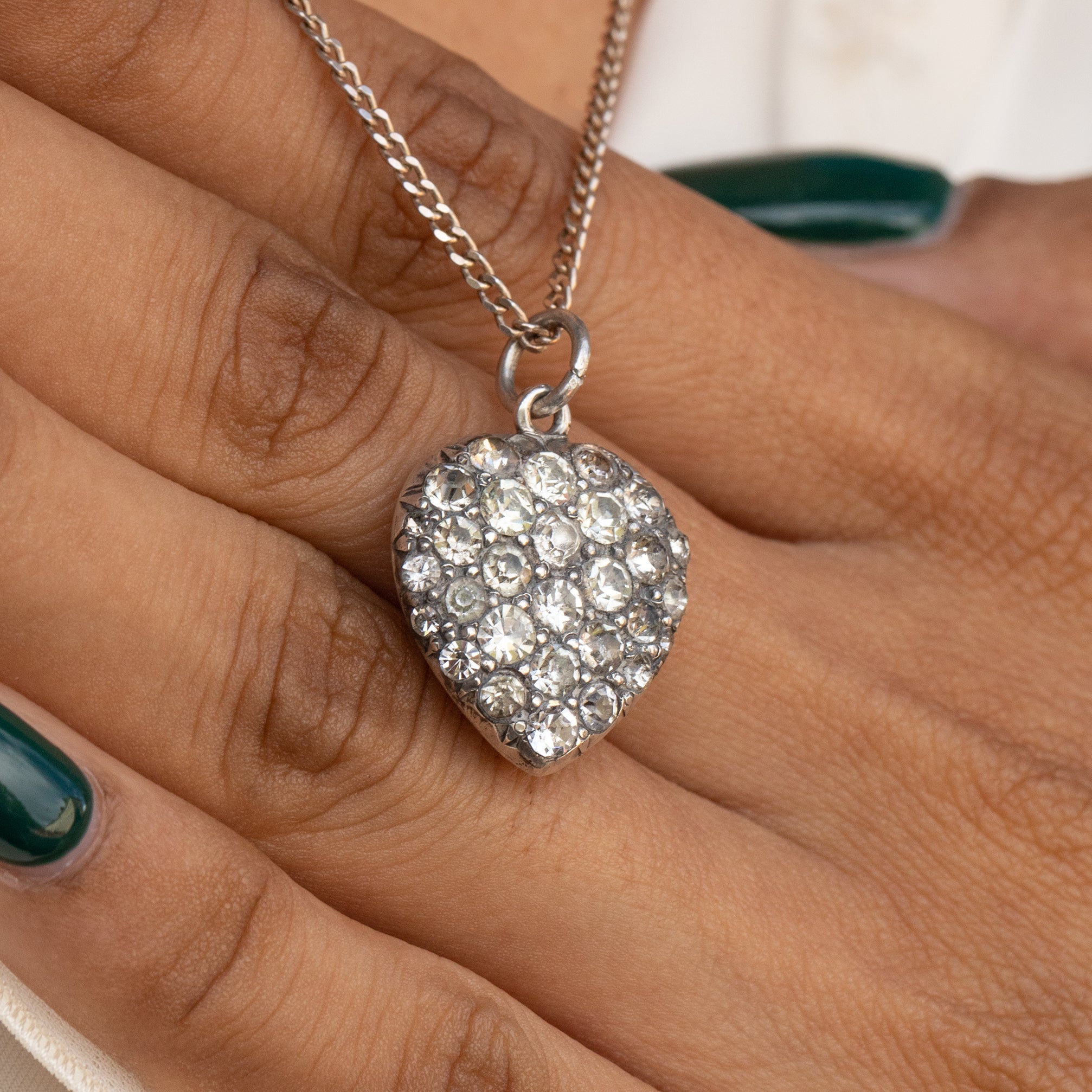 This exceptional antique Silver Paste heart pendant is a genuine Victorian piece, circa 1900. This dainty heart has been skillfully adorned with sparkling hand-cut Paste gemstones, beautifully contrasting with the patina that has accrued within the Silver settings.