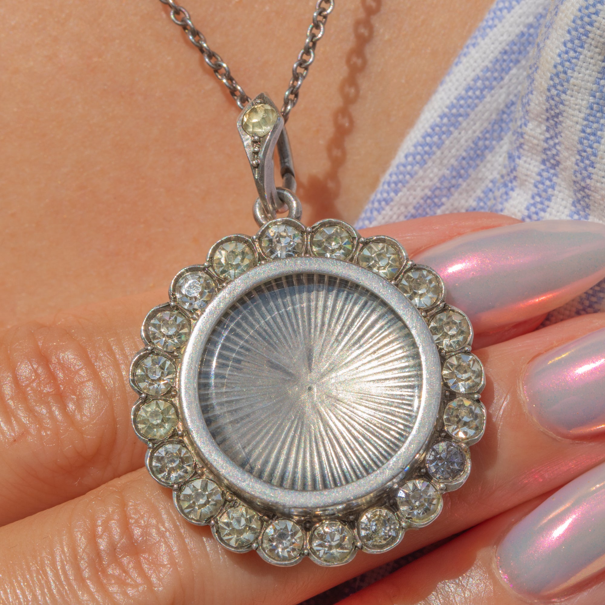 Plucked from the prettiest era, this antique Silver Paste picture locket is a fine example of Edwardian design! With an effortlessly feminine appeal, this Edwardian locket has been finely crafted from Sterling Silver and inlaid with bright Diamond Paste, creating a sea of scintillating sparkle as their crisp facets catch the light.