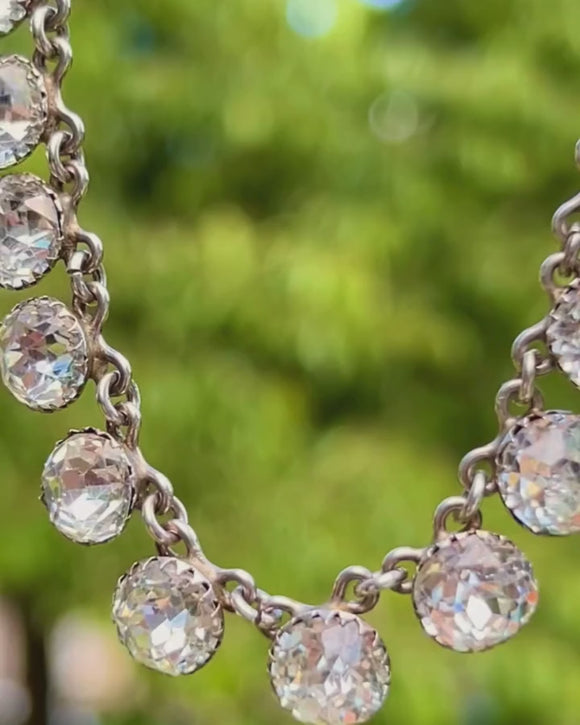 This antique Silver Paste riviere style necklace will bring a sea of sparkle to your collarbones! Fit for a ball, her 44 Paste gemstones dance beneath the light, flaunting crisp white glistens tracing all away around your neck in a classic riviere style.
