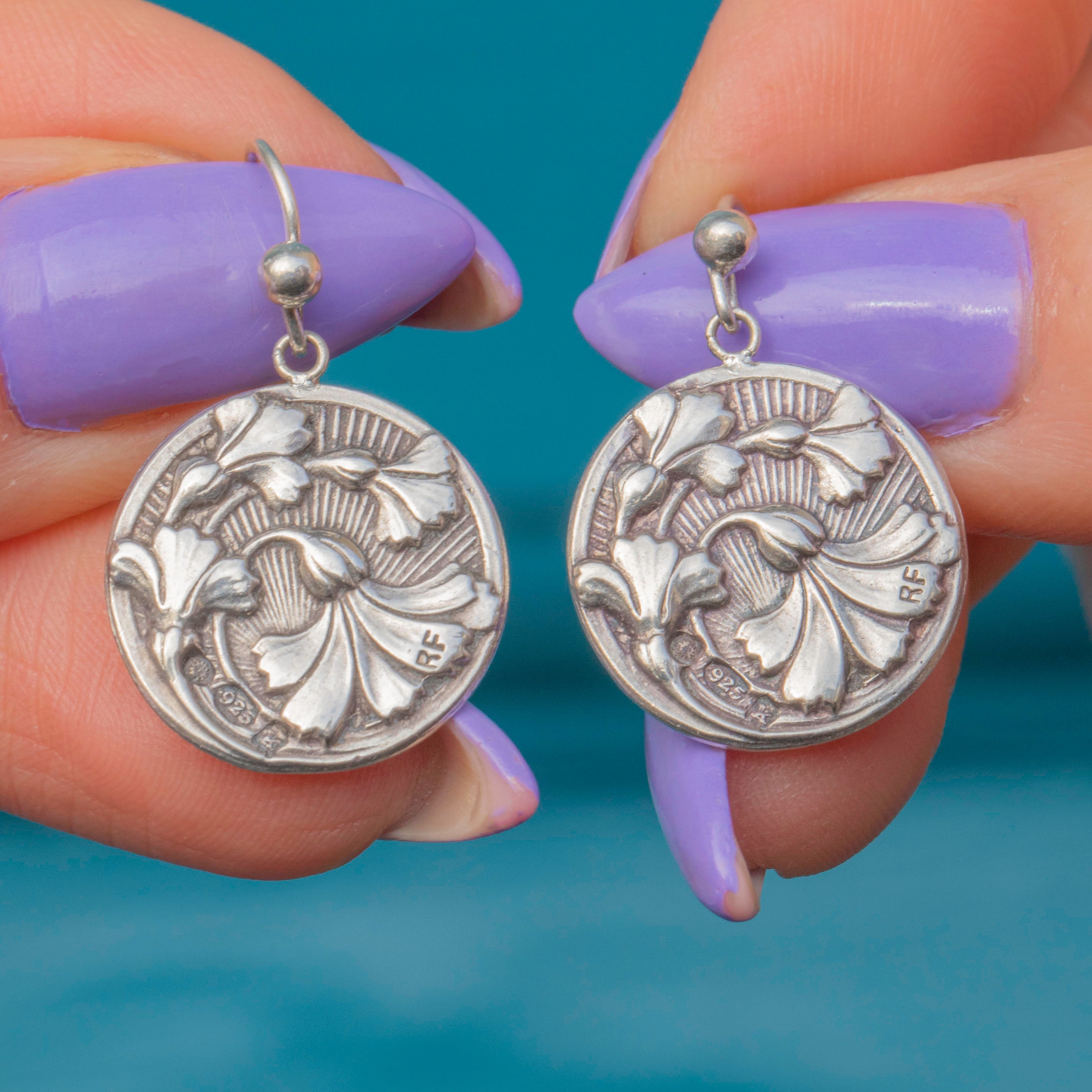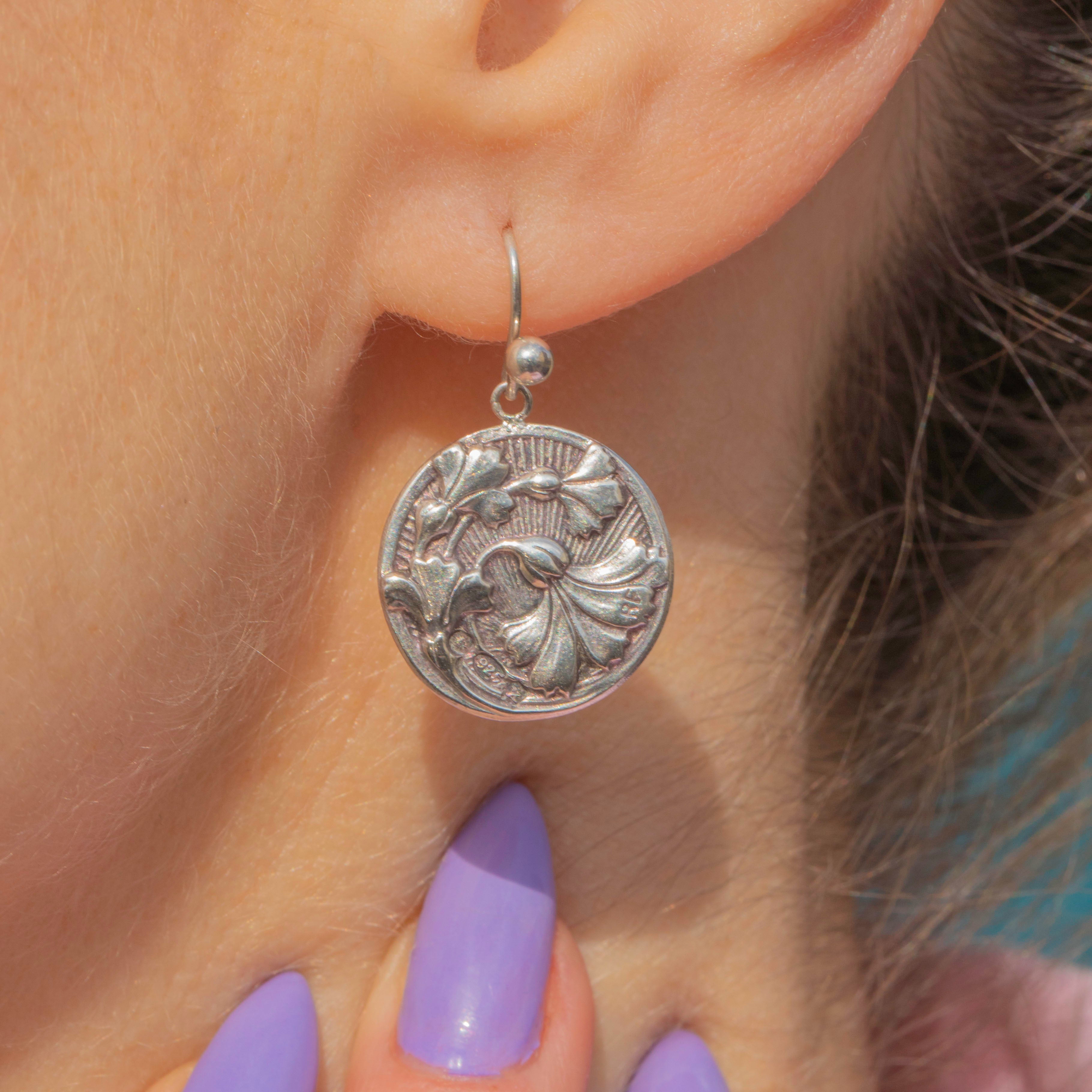 These antique Silver petunia floral earrings are a delightful pair! Crafted from bright Sterling Silver, each earring displays sweeping blooms enhanced by a light patina accrued within the grooves.