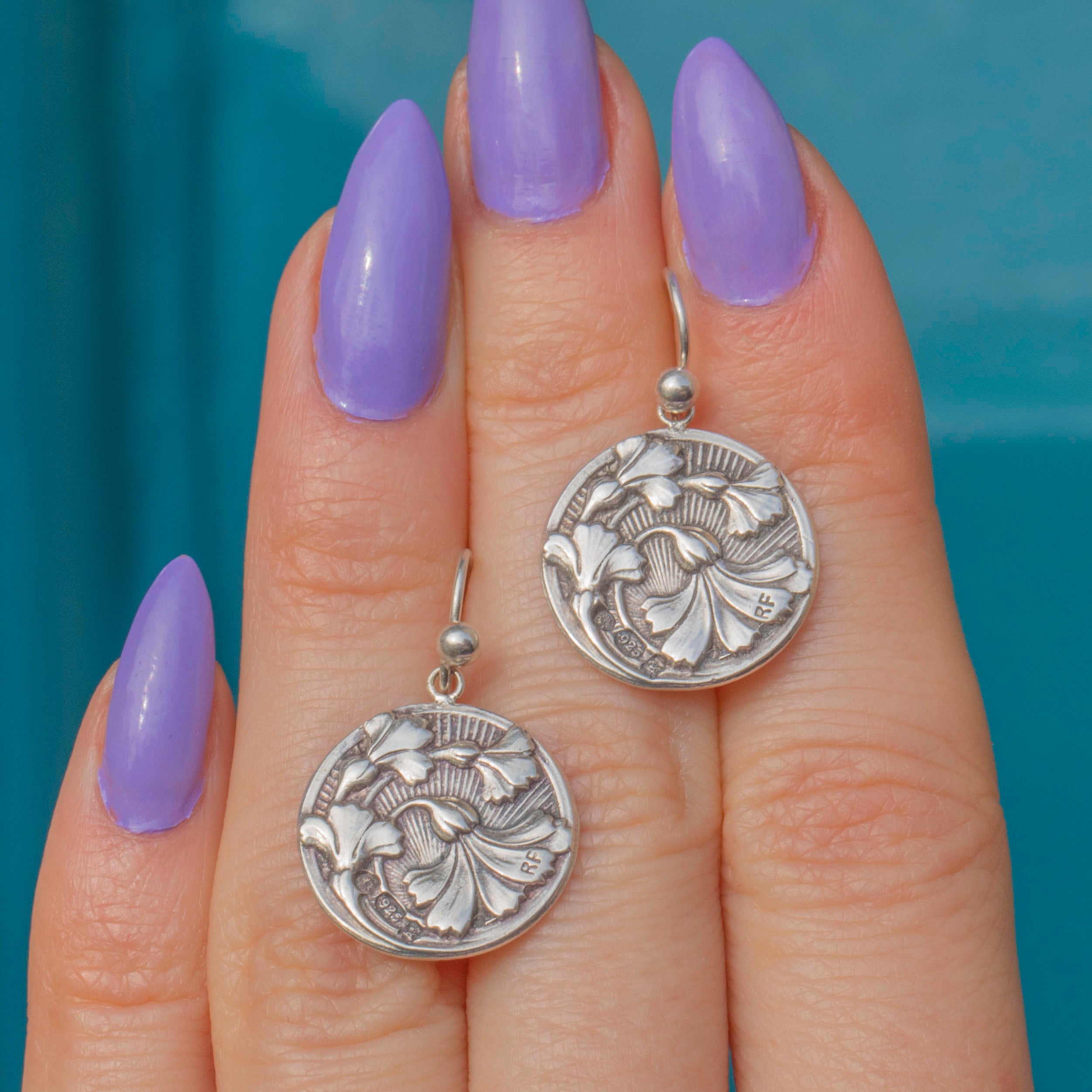 VERY GOOD-EXCELLENT: These antique Silver petunia floral earrings are in superb condition. The Silver is bright with the relief details having accrued a lovely patina, adding to their antique allure. The floral details are pristine with no signs of wear and the hallmarks have remained defined, allowing us to accurately date these antique earrings to 1905. There is some mild surface wear on the back of the earrings, commensurate with age, but this won't be noticeable when the earrings are worn. With slender and comfortable earring hooks, you can enjoy wearing these pretties with absolute confidence!