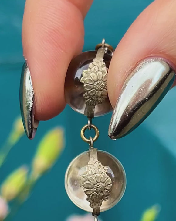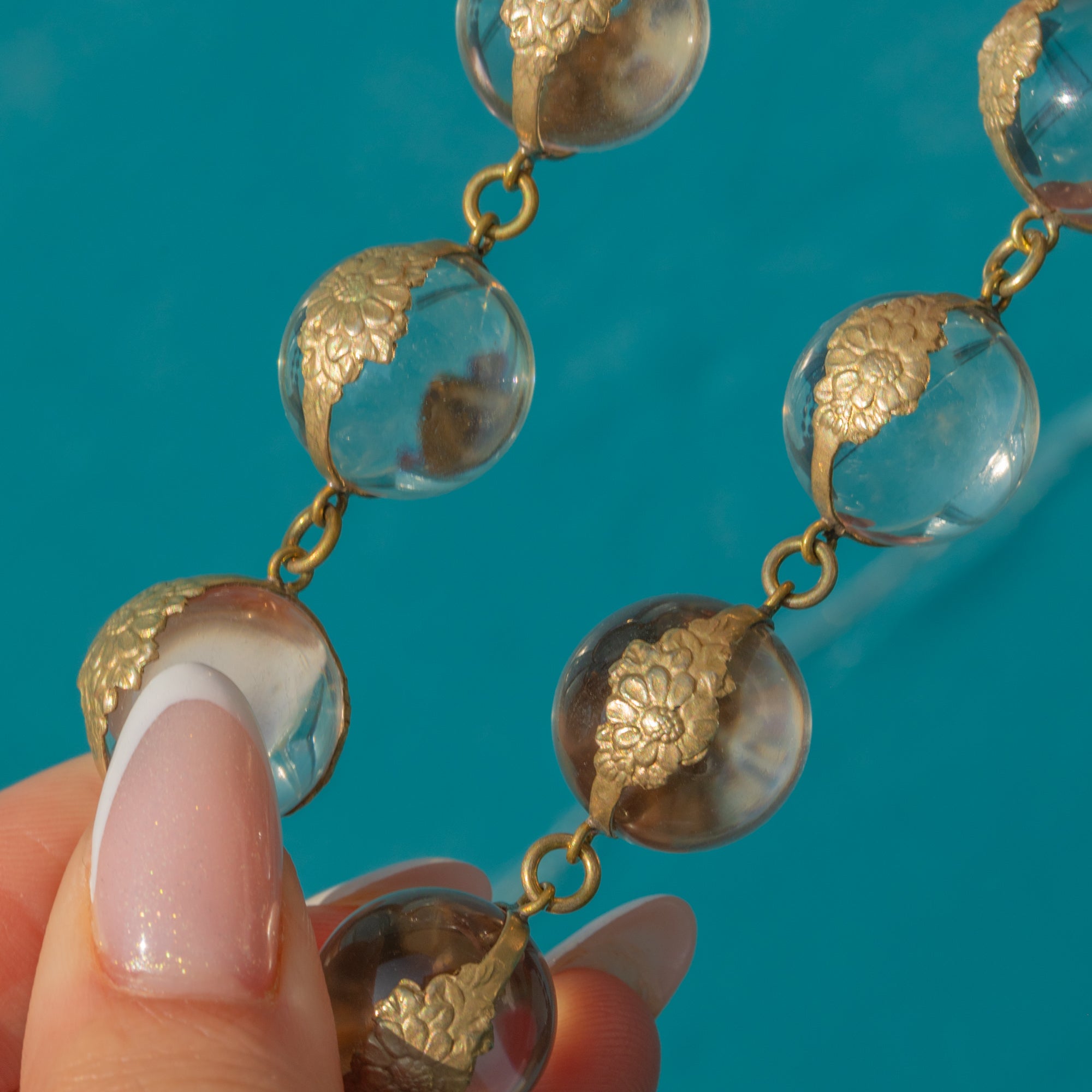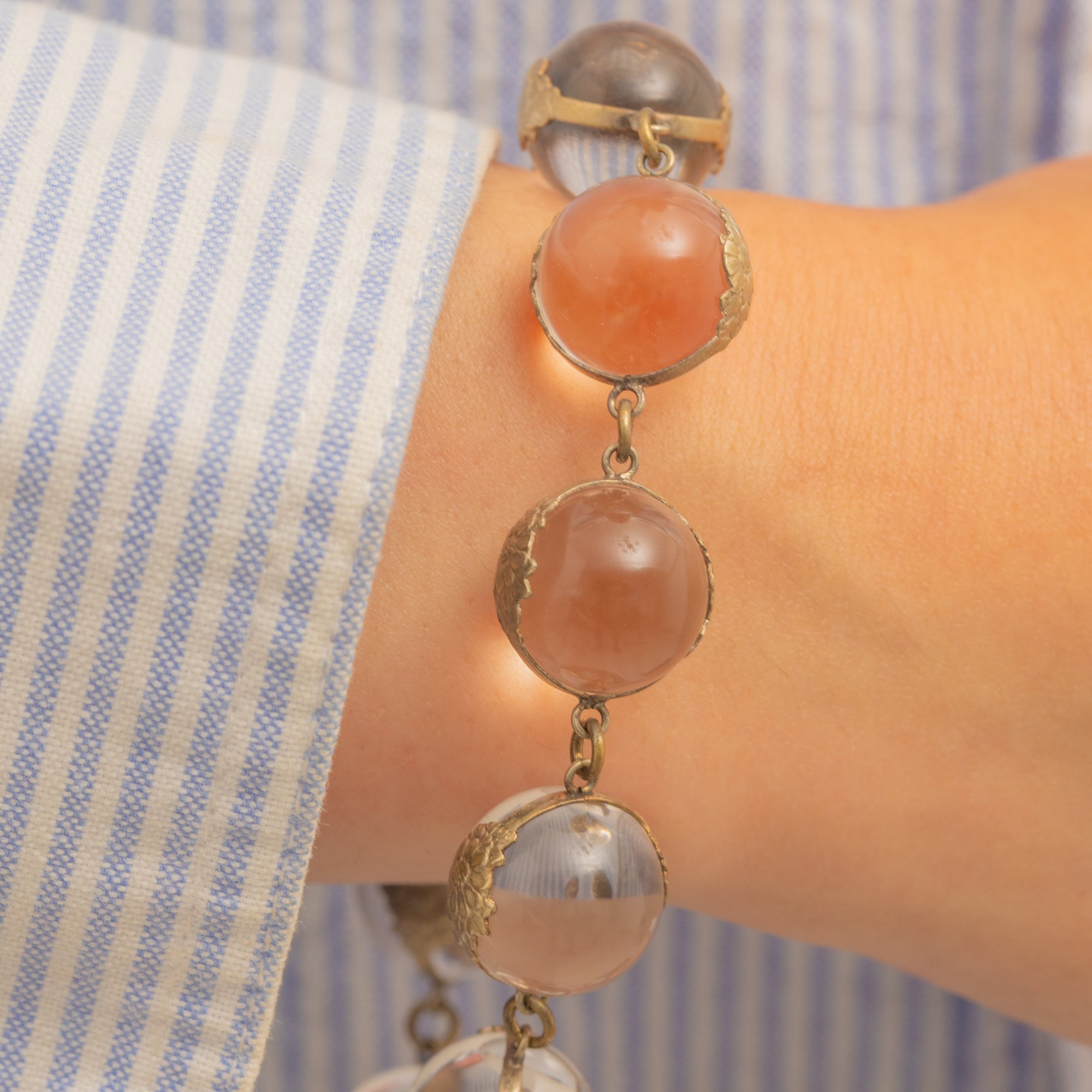 Comprised of ten spherical Rock Crystals, named 'pools of light' after their magical adularescence, this Victorian bracelet radiates a whimsical allure. Each crystal is set within lustrous floral Silver settings, adding a lovely antique charm to this piece.