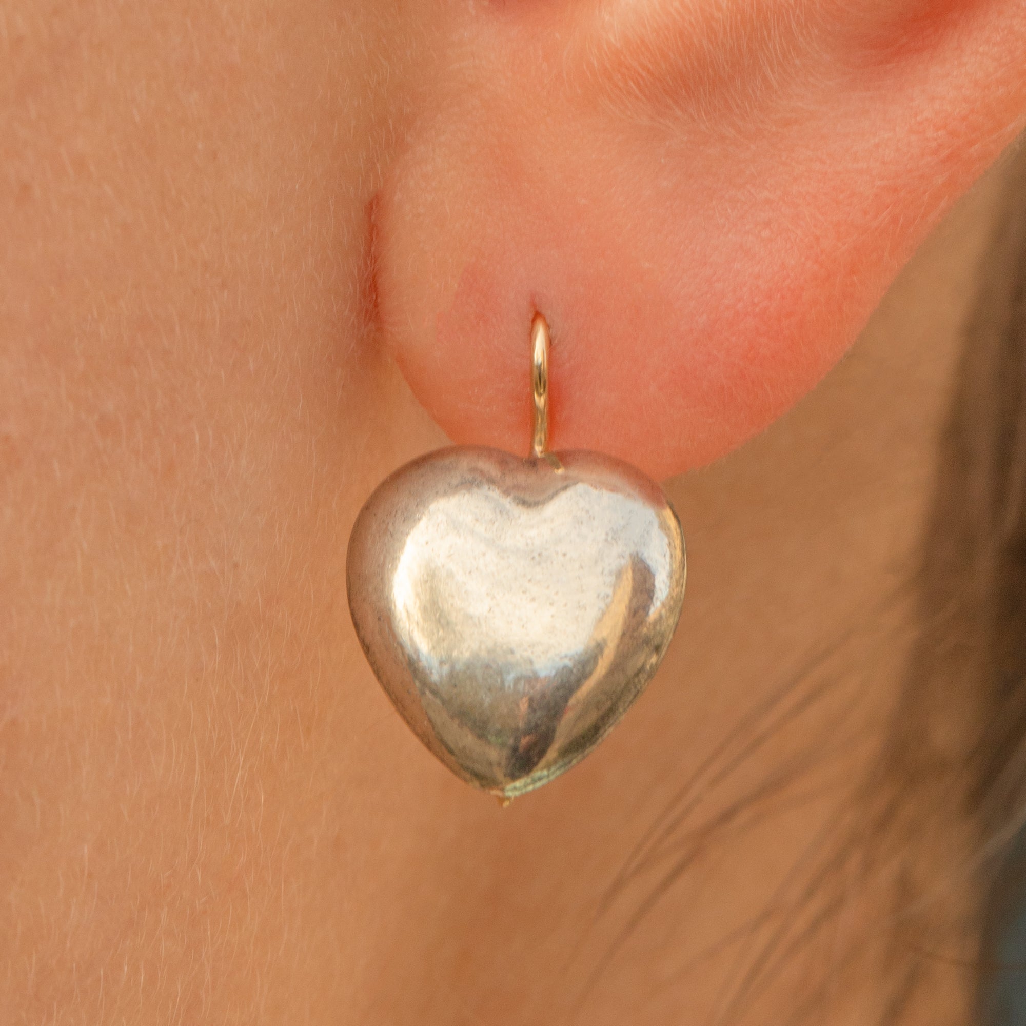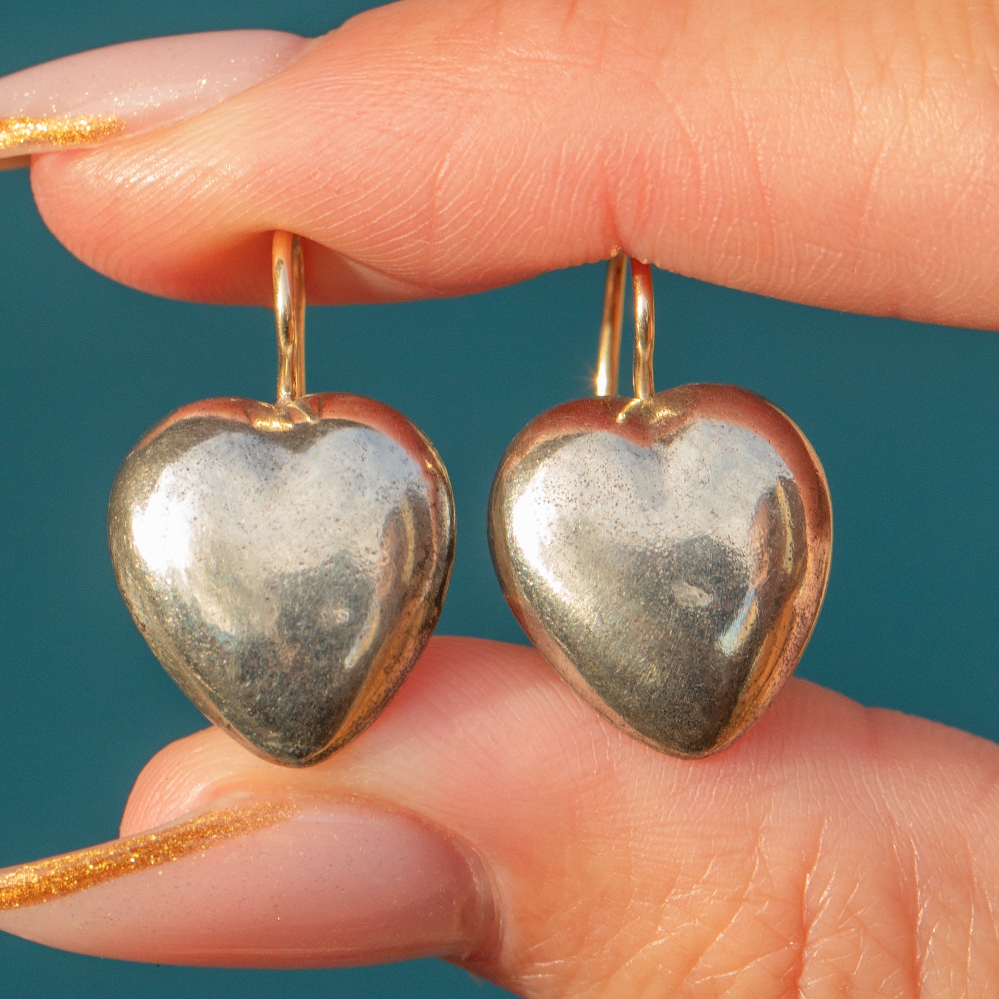Light, wearable and beautifully preserved, the Silver hearts have a smooth, glossy finish, while the high-carat Gold hooks add a luxurious touch and comfortable wear. A delightful everyday antique pair with timeless appeal.