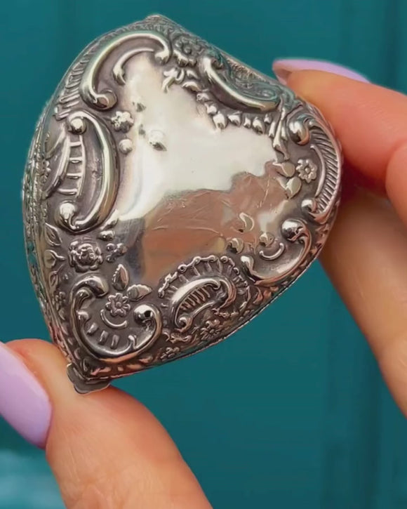 The perfect new abode for your most precious trinkets, this antique Silver repoussé heart shaped trinket box will bring a touch of Victorian charm to your nightstand!