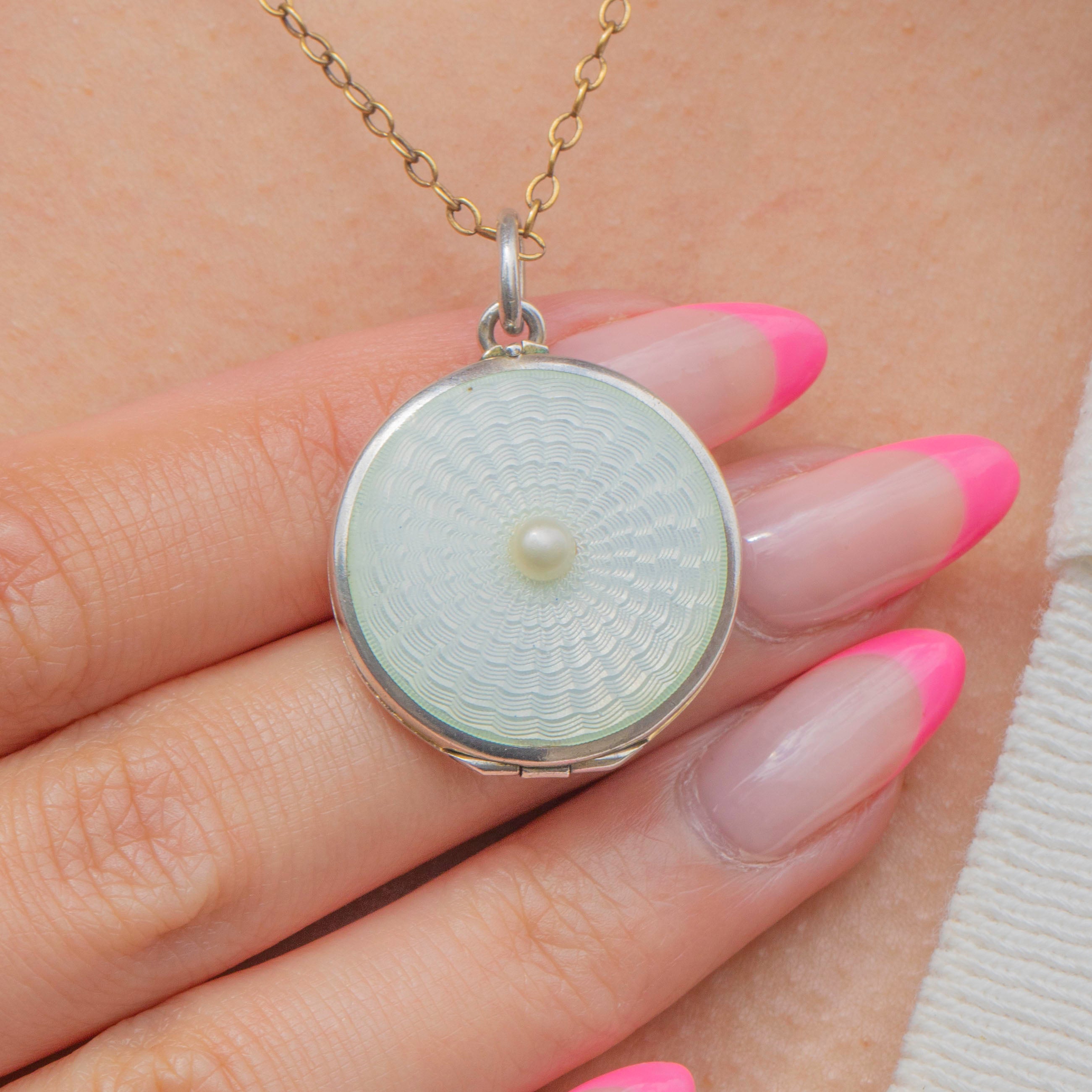 This antique Silver White Guilloché Enamel Pearl locket is incredibly charming! The shimmering powder-white patterns that radiate from her intricate Guilloché Enamel will captivate anyone who lays eyes on her.