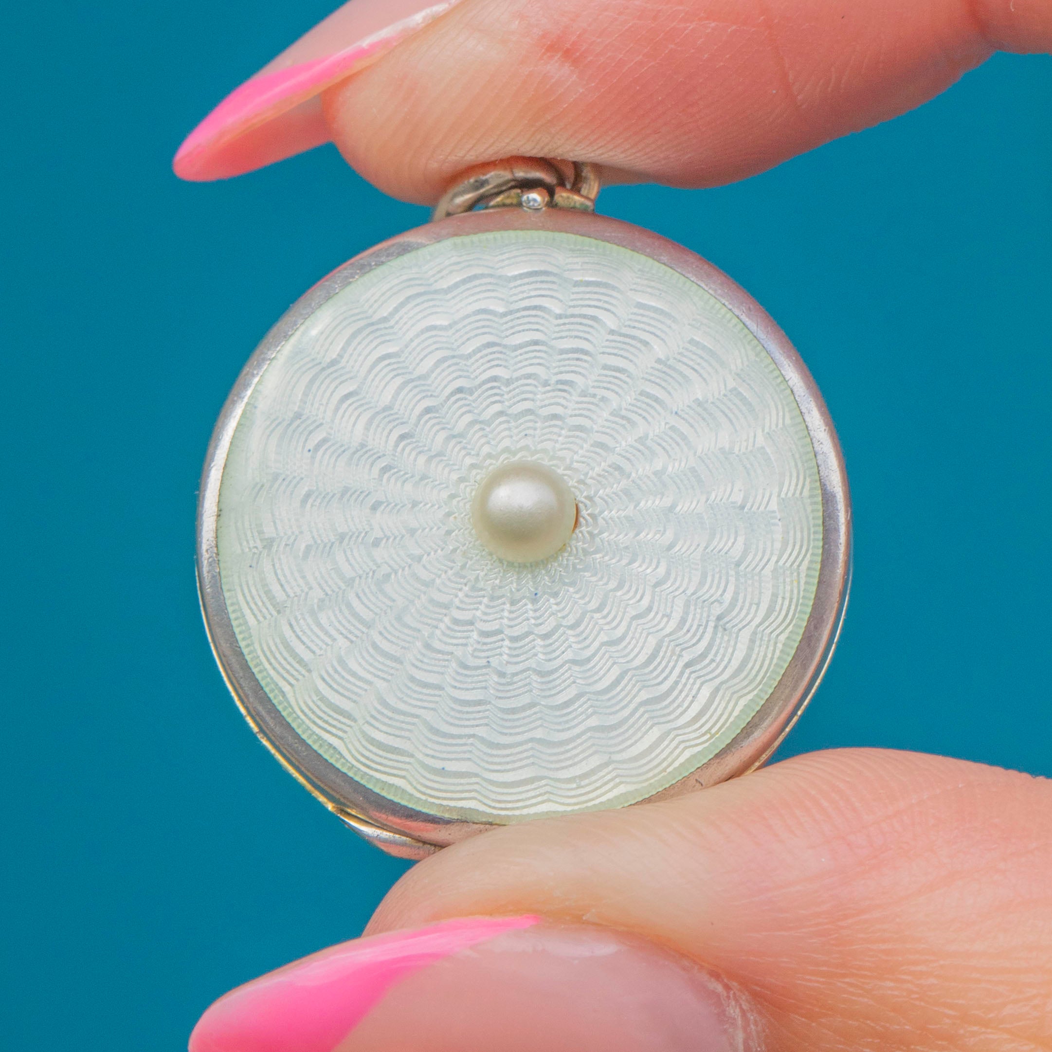 VERY GOOD: This antique Silver White Guilloché Enamel Pearl locket is in superb condition! Her Enamel is immaculate throughout, free from any damage to note. She has been kept in remarkable condition for her age. Her Pearl is securely set and has kept her lustre as well as her bright white tone. The Silver has accrued a slight patina, desirable on an authentic antique like herself! She has a few dings at the back, but nothing too impactful. Although she has no glass, she closes securely so you can place your favourite photograph inside and keep it close to your heart at all times.