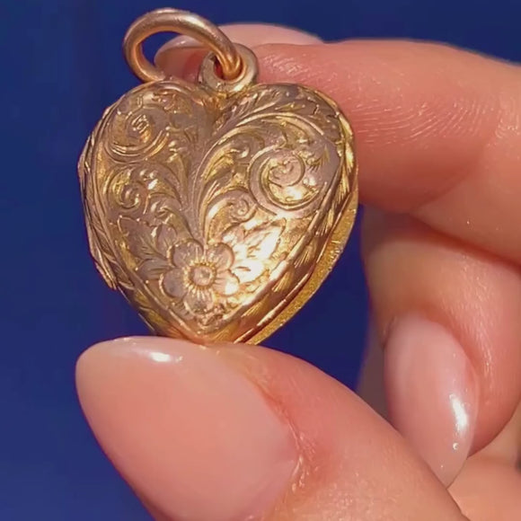 This antique solid 9ct Gold engraved heart locket is a whimsical dream! Both sides are covered with a delightful display of engravings, and has a splendid rich golden hue throughout.