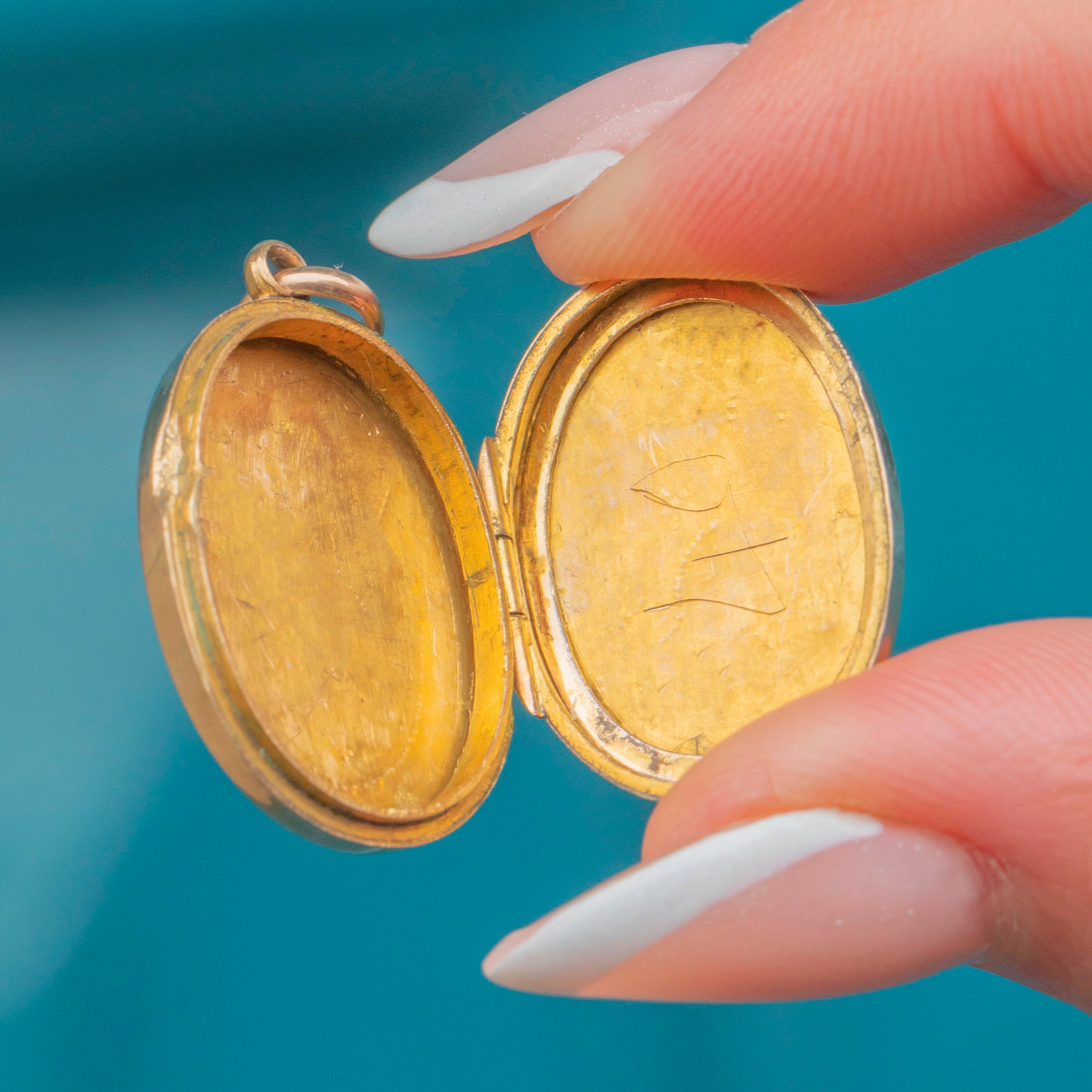 This antique solid 9ct Gold oval engraved locket is simply divine! This delightful piece is engraved on both sides and opens to reveal a frame, to which you can add a cherished photograph.