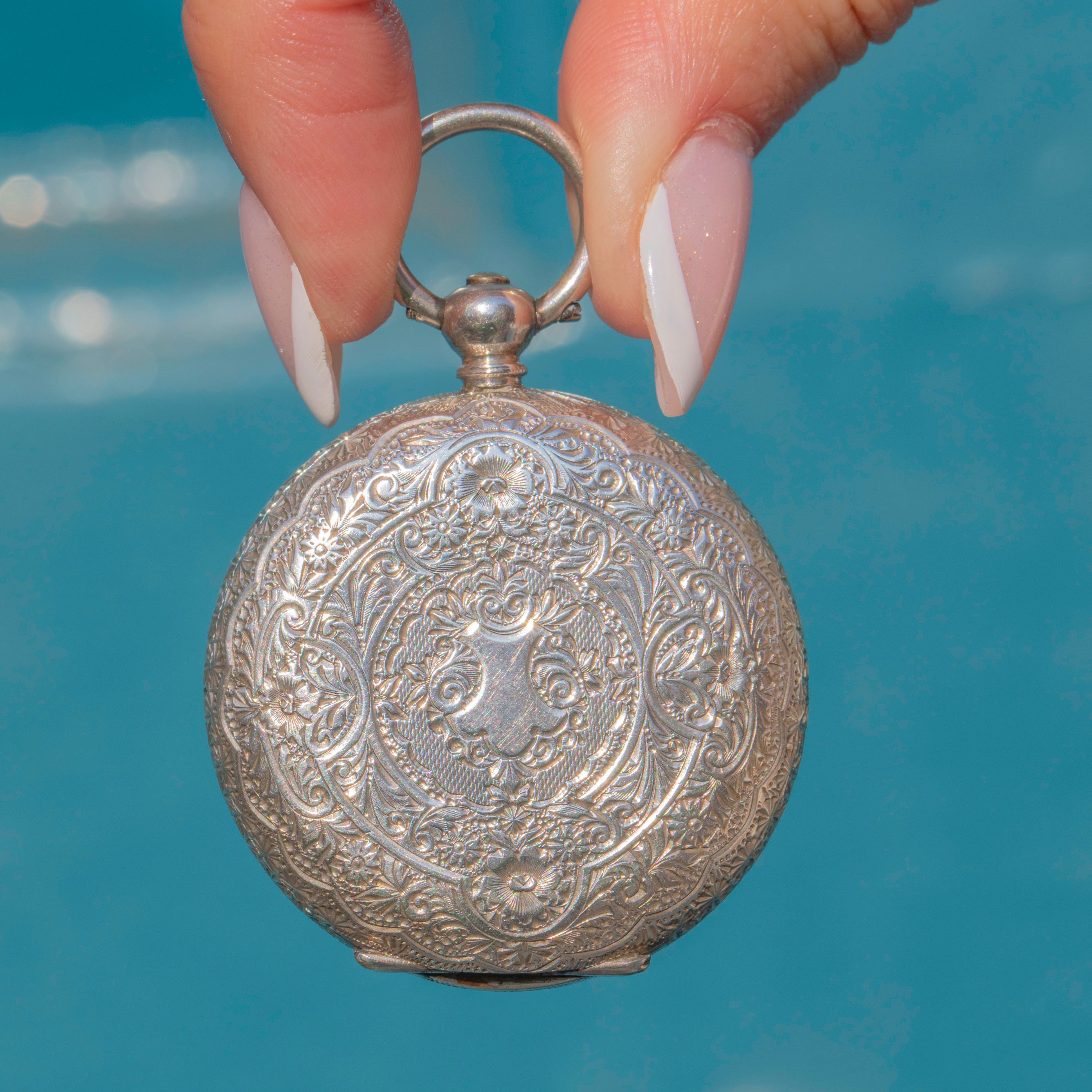 EXCELLENT: This antique Swiss Silver engraved pocket watch is in incredible condition. The watch can be opened easily by pressing the bale at the top, revealing its historic hallmarks inside. The hallmarks and engravings are well-preserved and crisp. This pocket watch will certainly take pride of place in your collection!