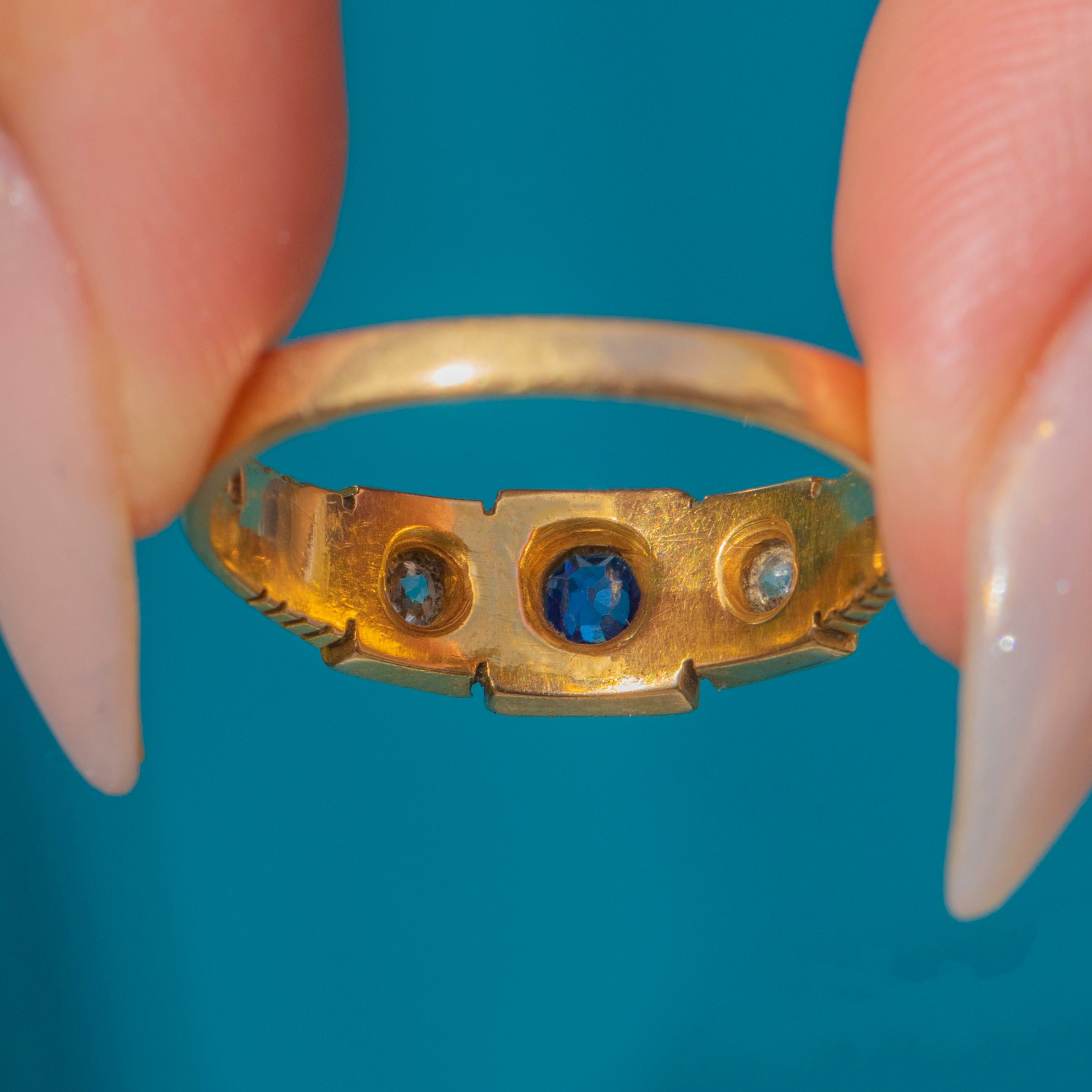 A superb antique Victorian gypsy ring in solid 18ct Gold, star-set with a vivid blue Sapphire and two sparkling Diamonds. Each stone is set within a crisp hand-engraved 8-pointed star, catching the light beautifully.