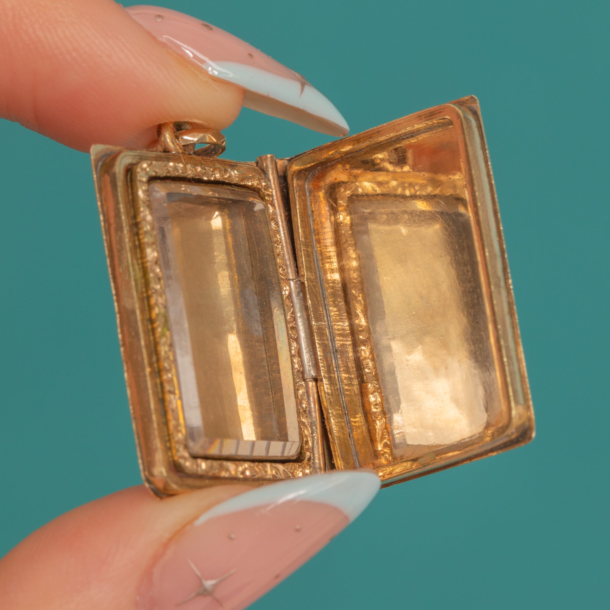 Opening on a side tubular hinge, the locket reveals a glazed compartment framed by bright-cut borders. Finished with a round hasp and oval jump ring, it’s an elegant, sentimental jewel with timeless charm.
