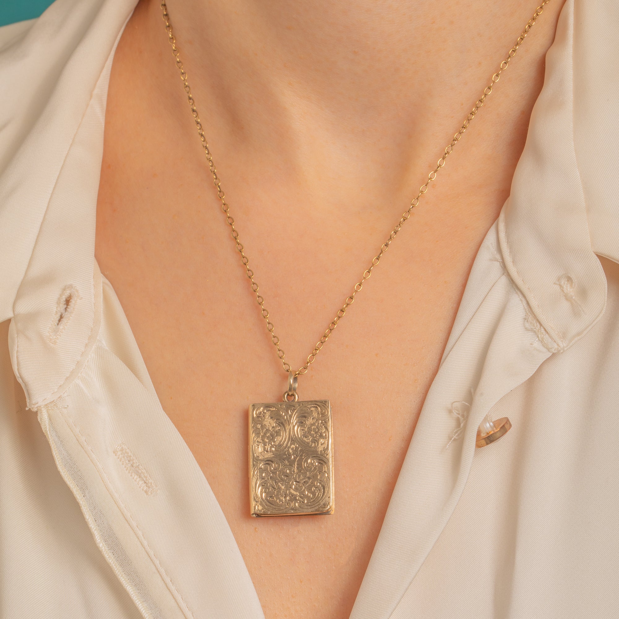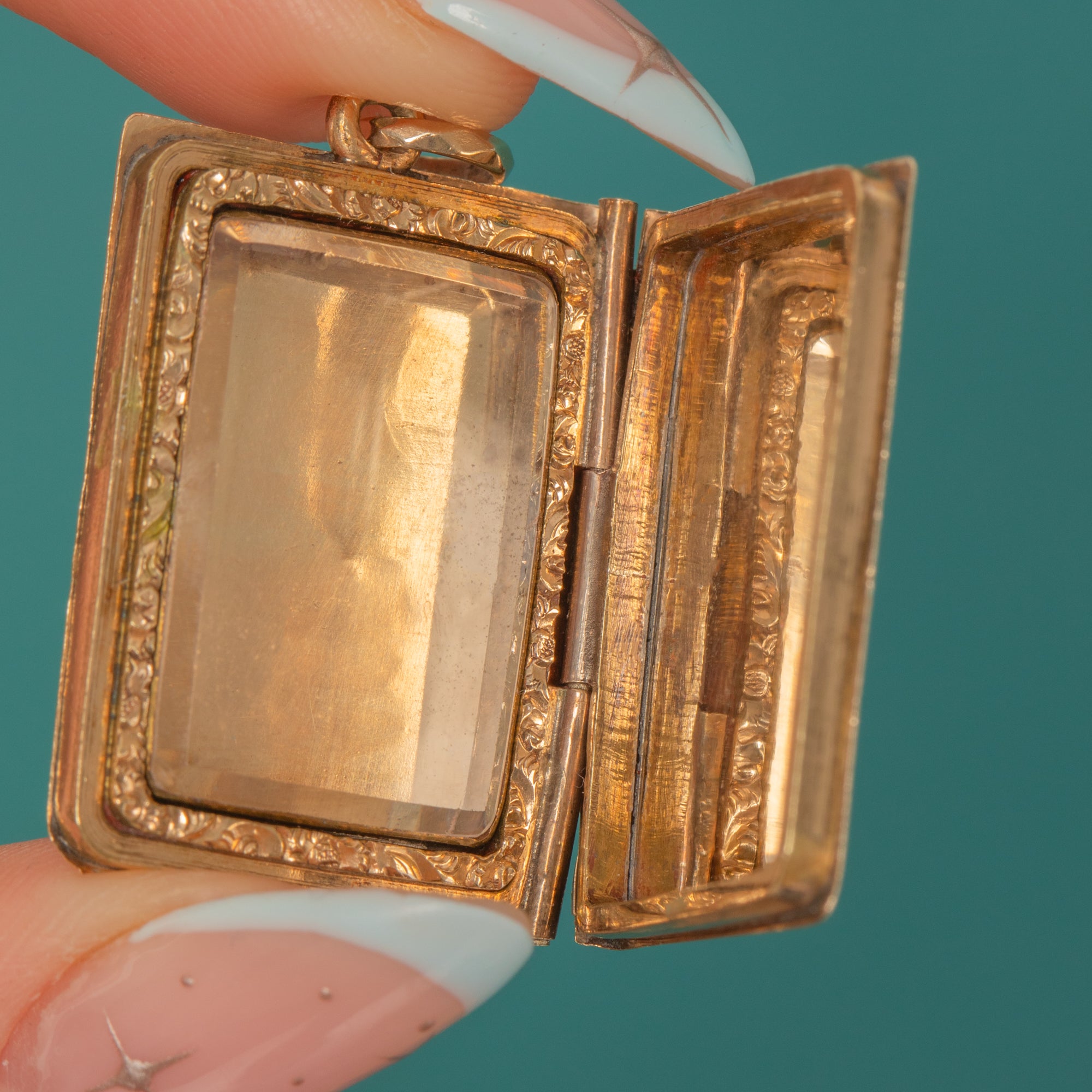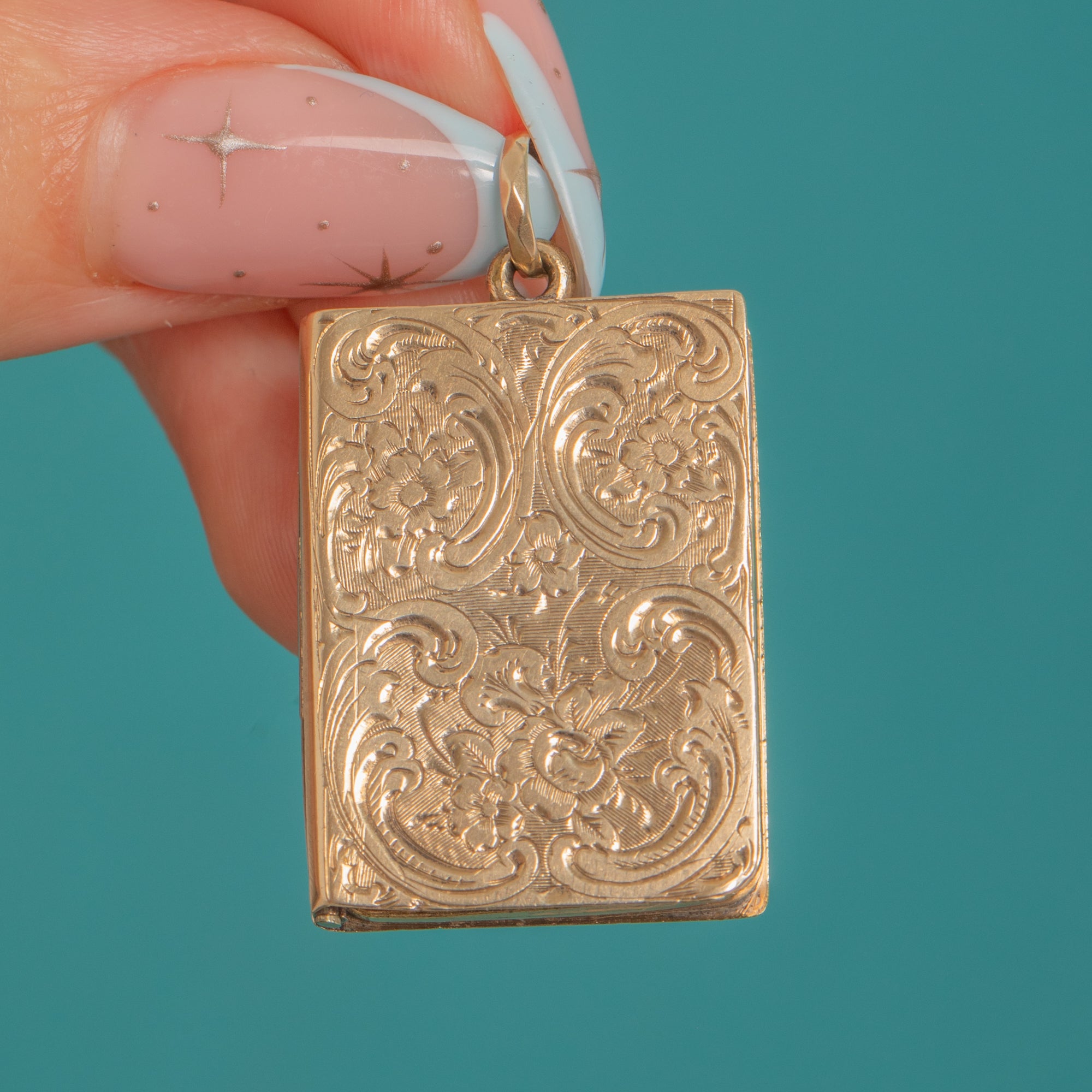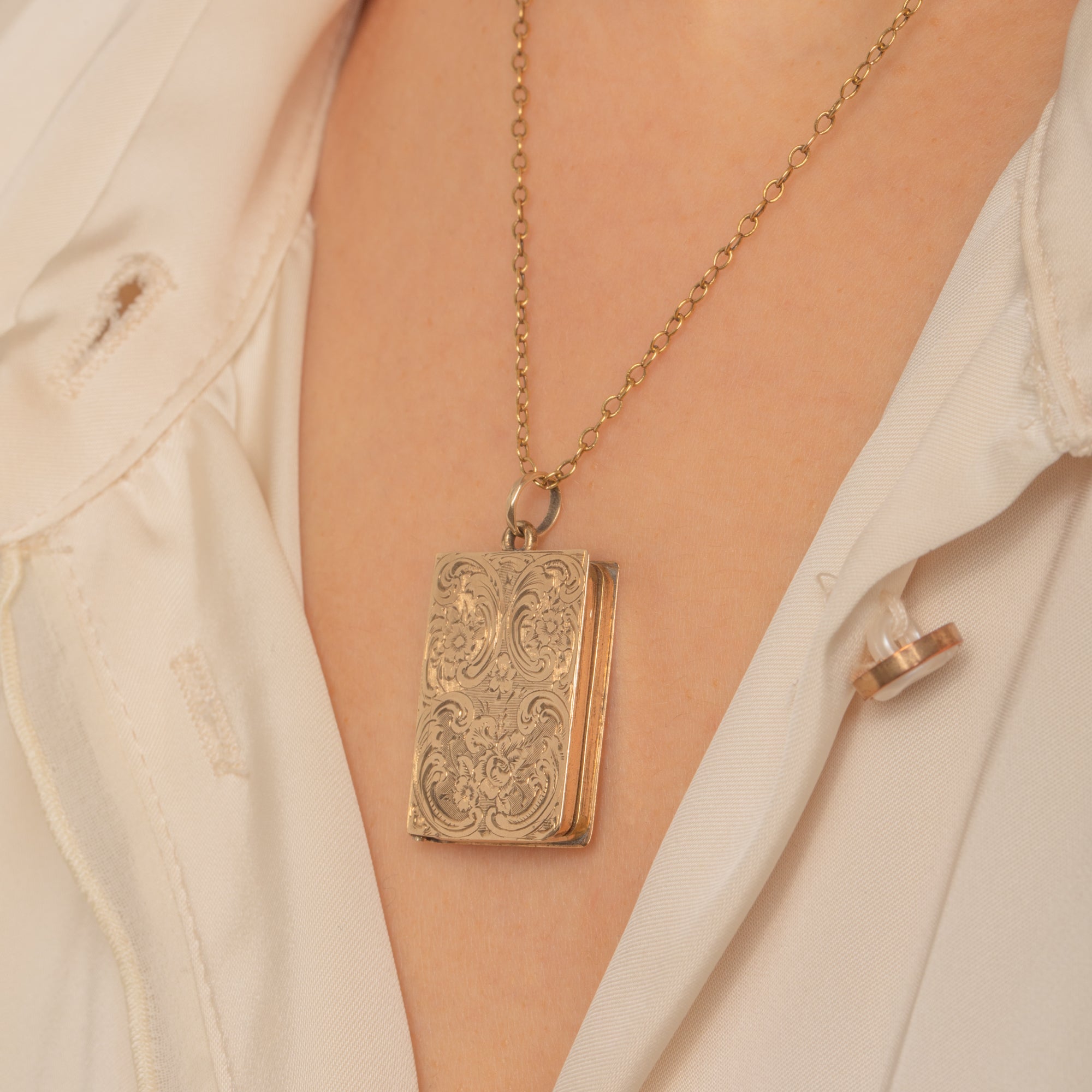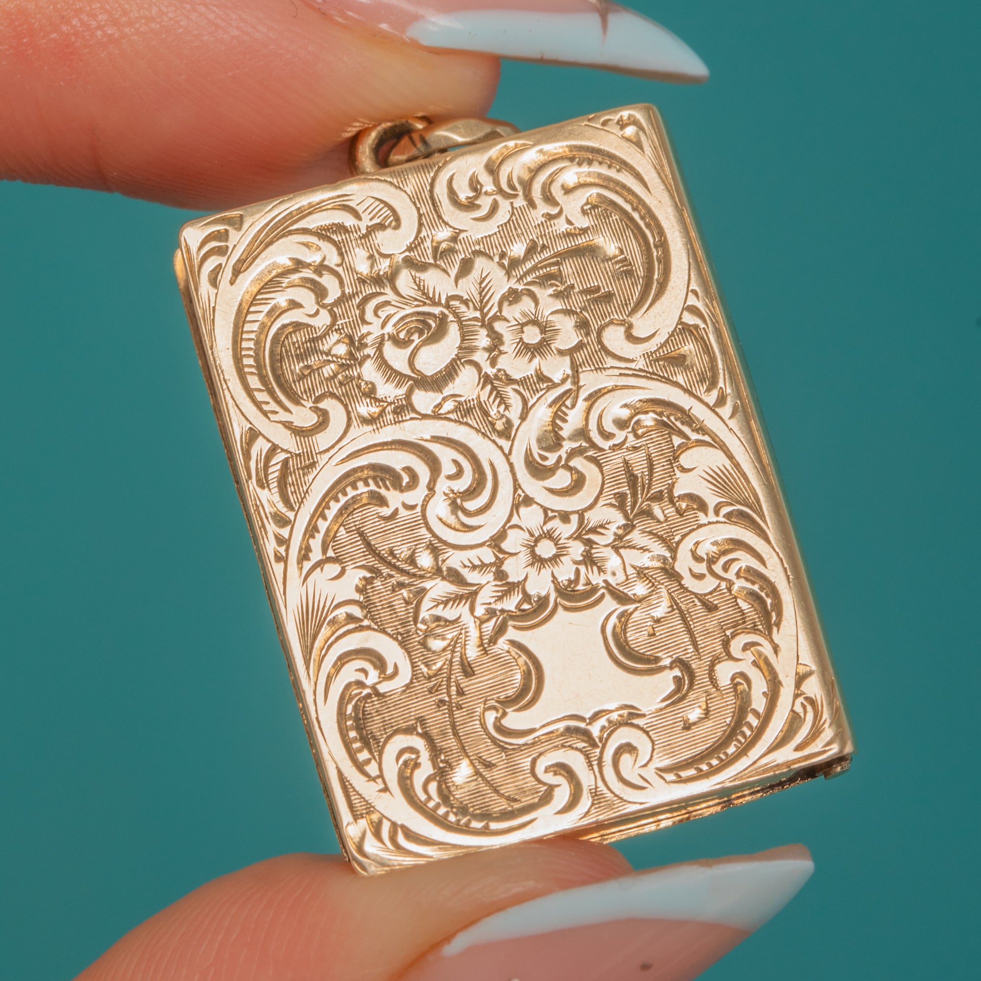 Ornate and romantic, this antique Victorian 9ct Gold book-form locket is richly hand-engraved with scrolling foliage and delicate rosettes over a fine lined ground. Its warm patina and crisp detailing making it a beautiful keepsake and a joy to handle.