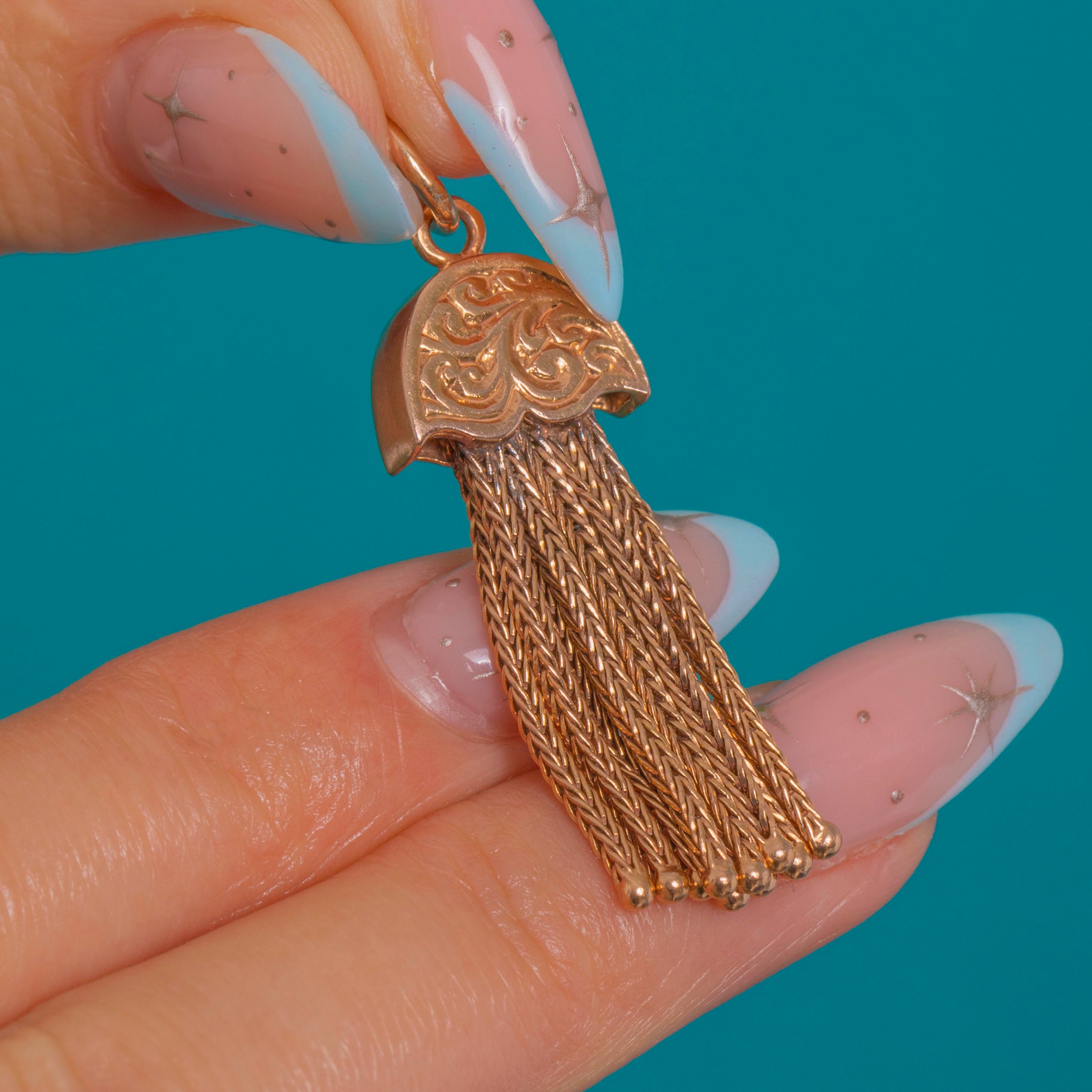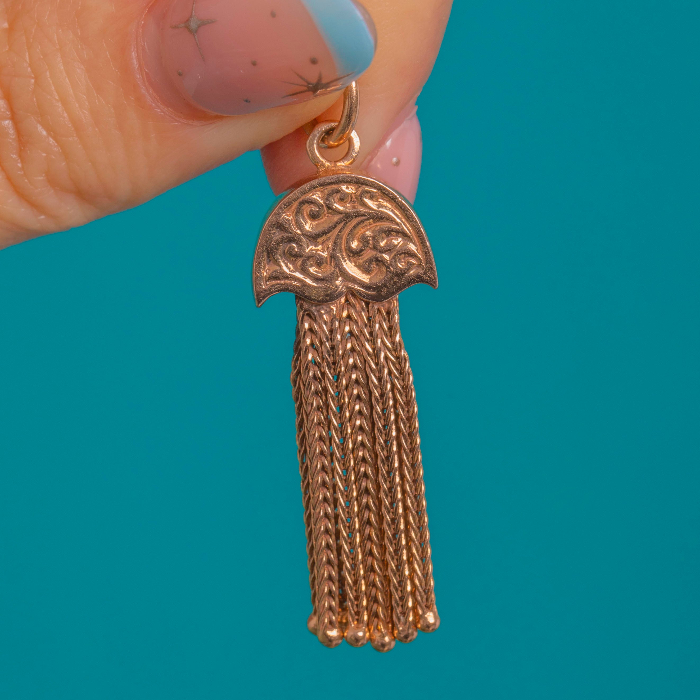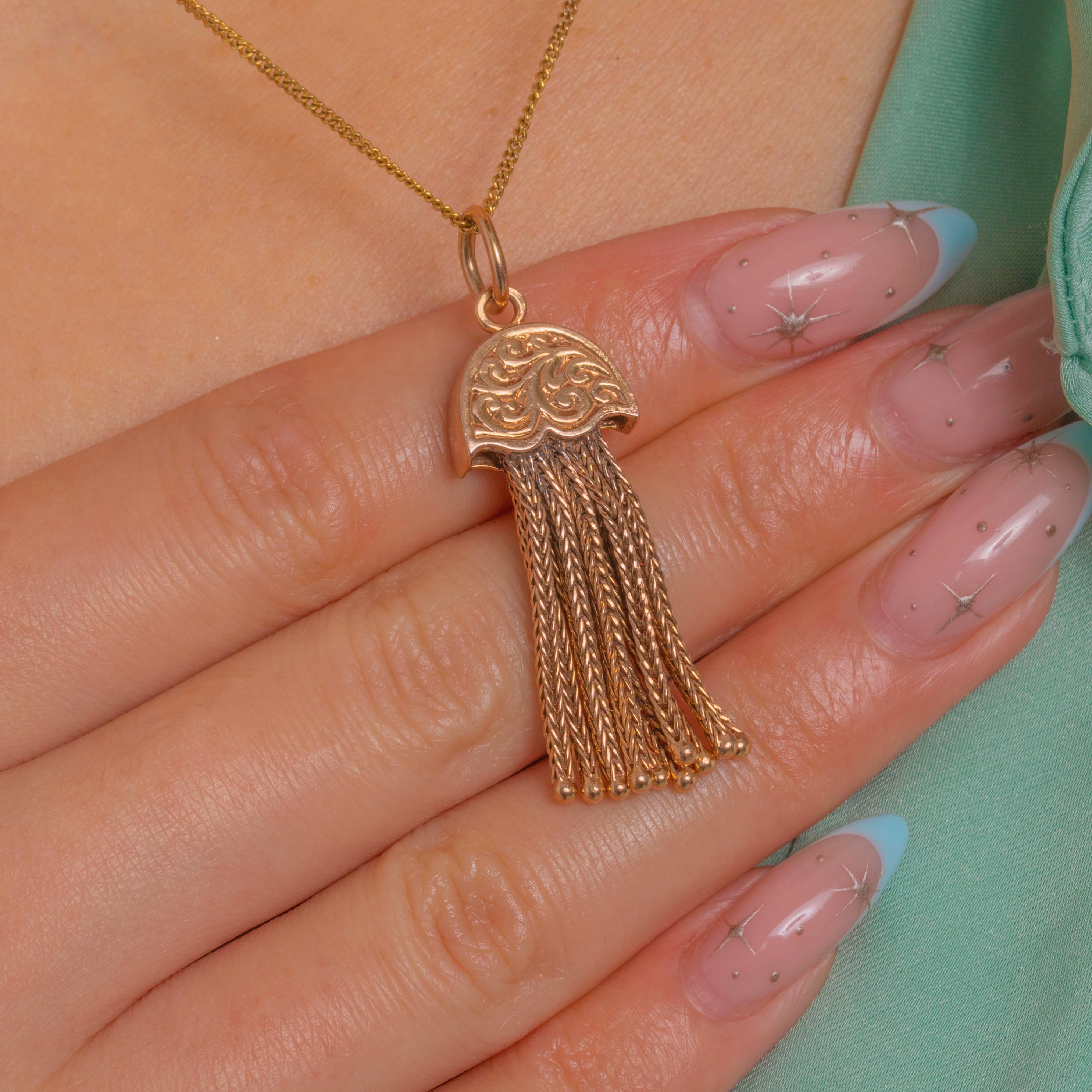 Sumptuously detailed and wonderfully tactile, this Victorian 9ct Gold tassel pendant is a petite treasure with beautiful movement. The domed, scalloped cap is richly engraved with scrolling foliate motifs, flowing into a fringe of fine foxtail chain strands tipped with tiny beads for a lively, dancing finish.