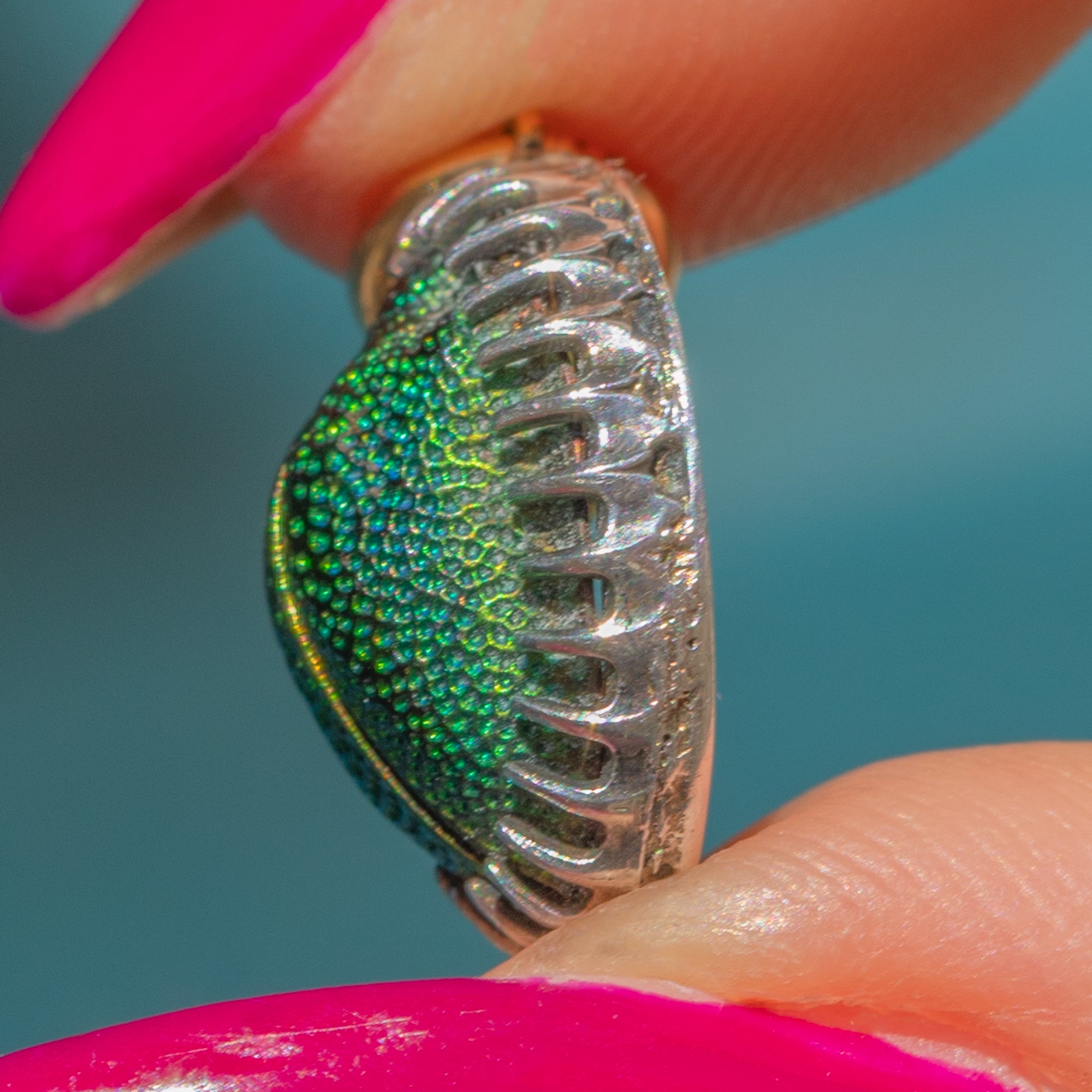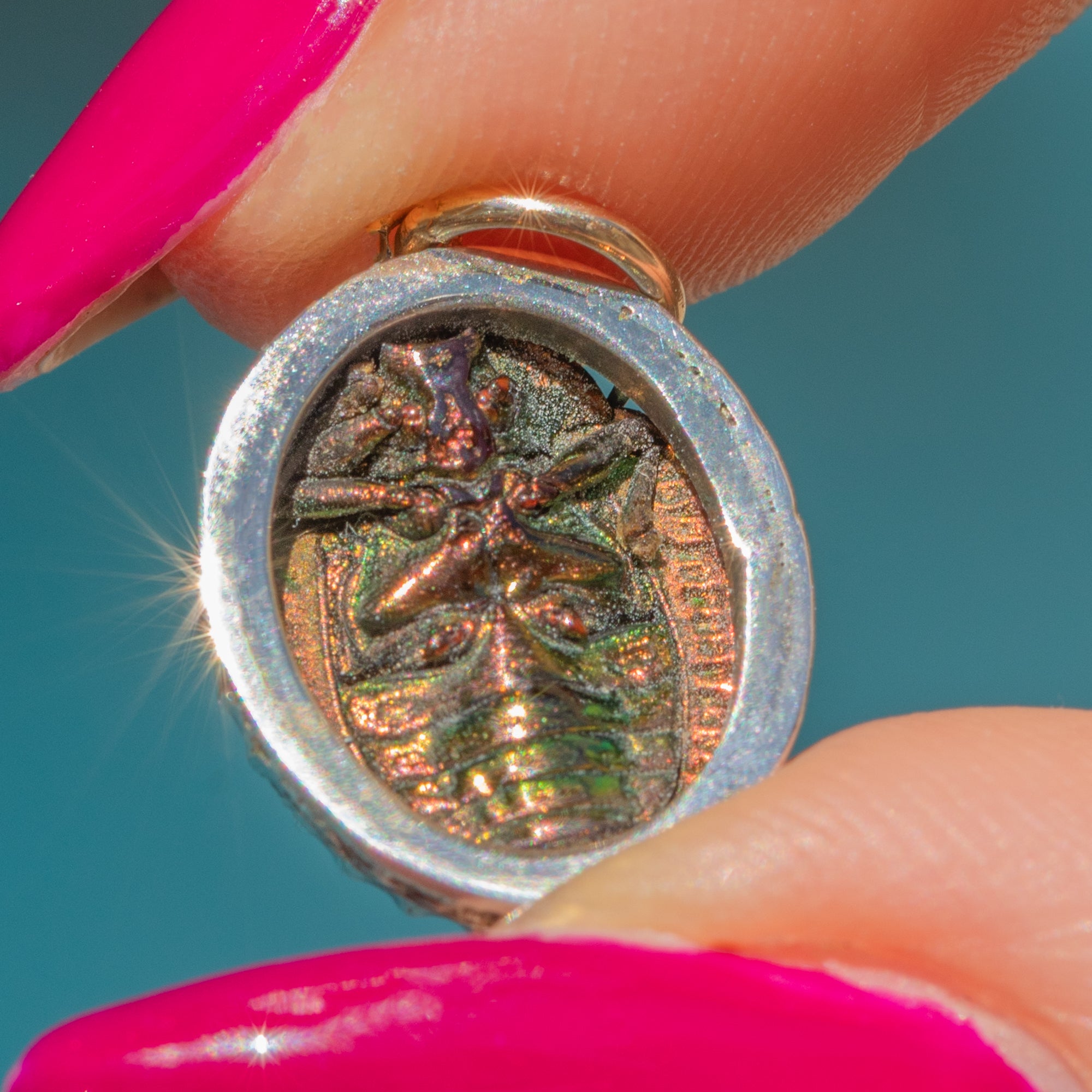 The natural Scarab Beetle boasts a deep green hue, with a gorgeous iridescence that shimmers in the light, and is displayed within striking Silver claws creating an eye-catching treasure that can easily be suspended from a skinny chain!