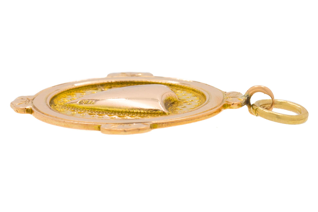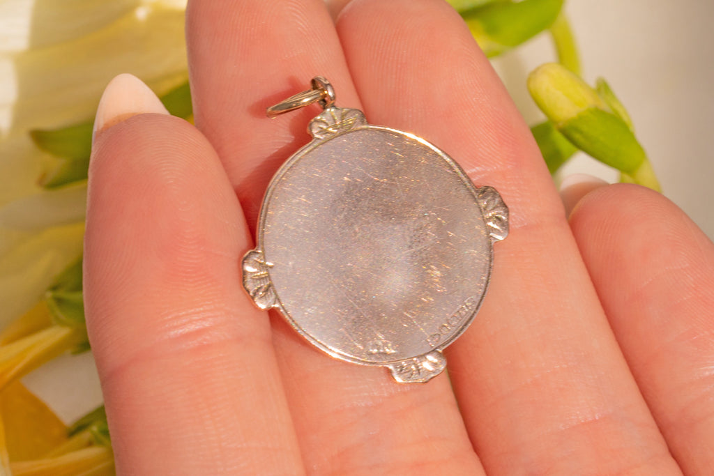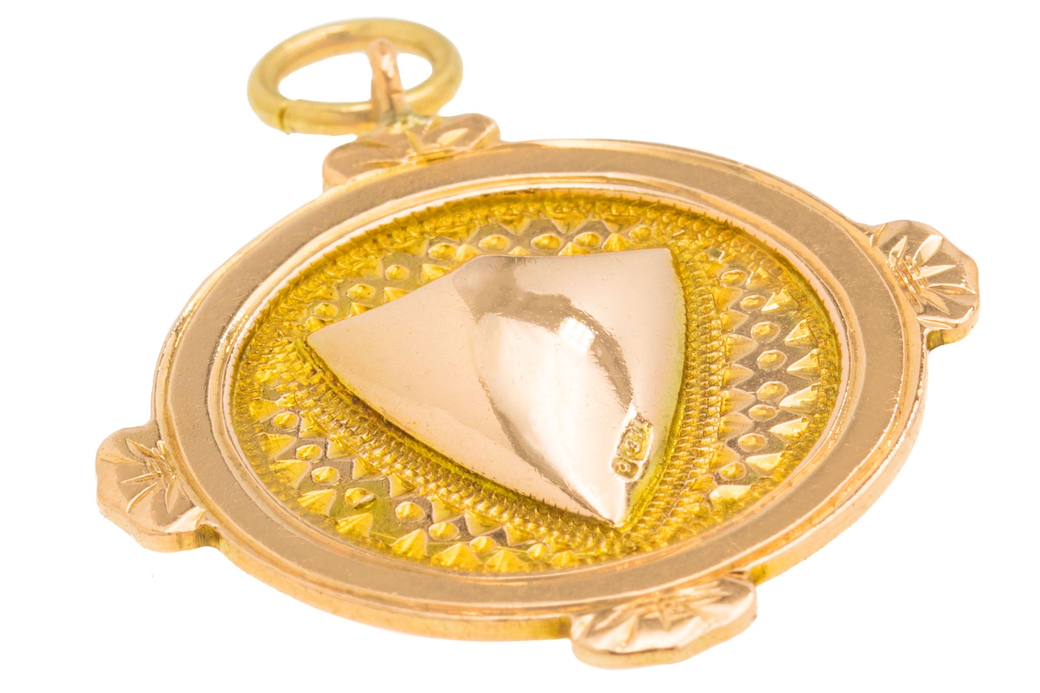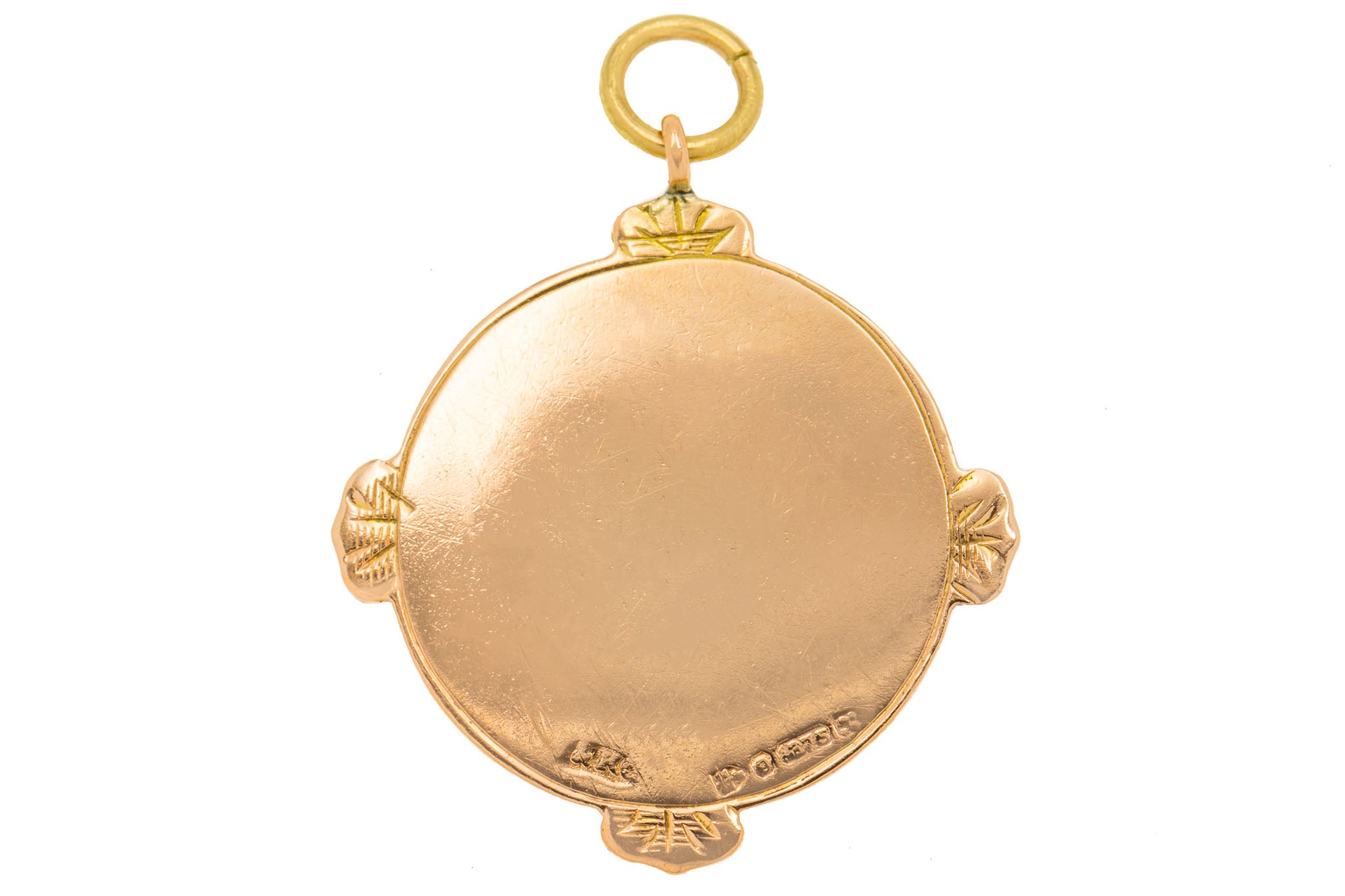 VERY GOOD. This Art Deco 9ct Gold medal fob pendant is in very good condition! The Gold is gorgeous and the details are delightful. There are a few little scratches to the back of the piece, but this is surface wear commensurate with age. This beauty has an ever so slightly thinned hasp, which is visible from the side, but the piece is still robust and sure to last many more years. This is a gorgeous piece.