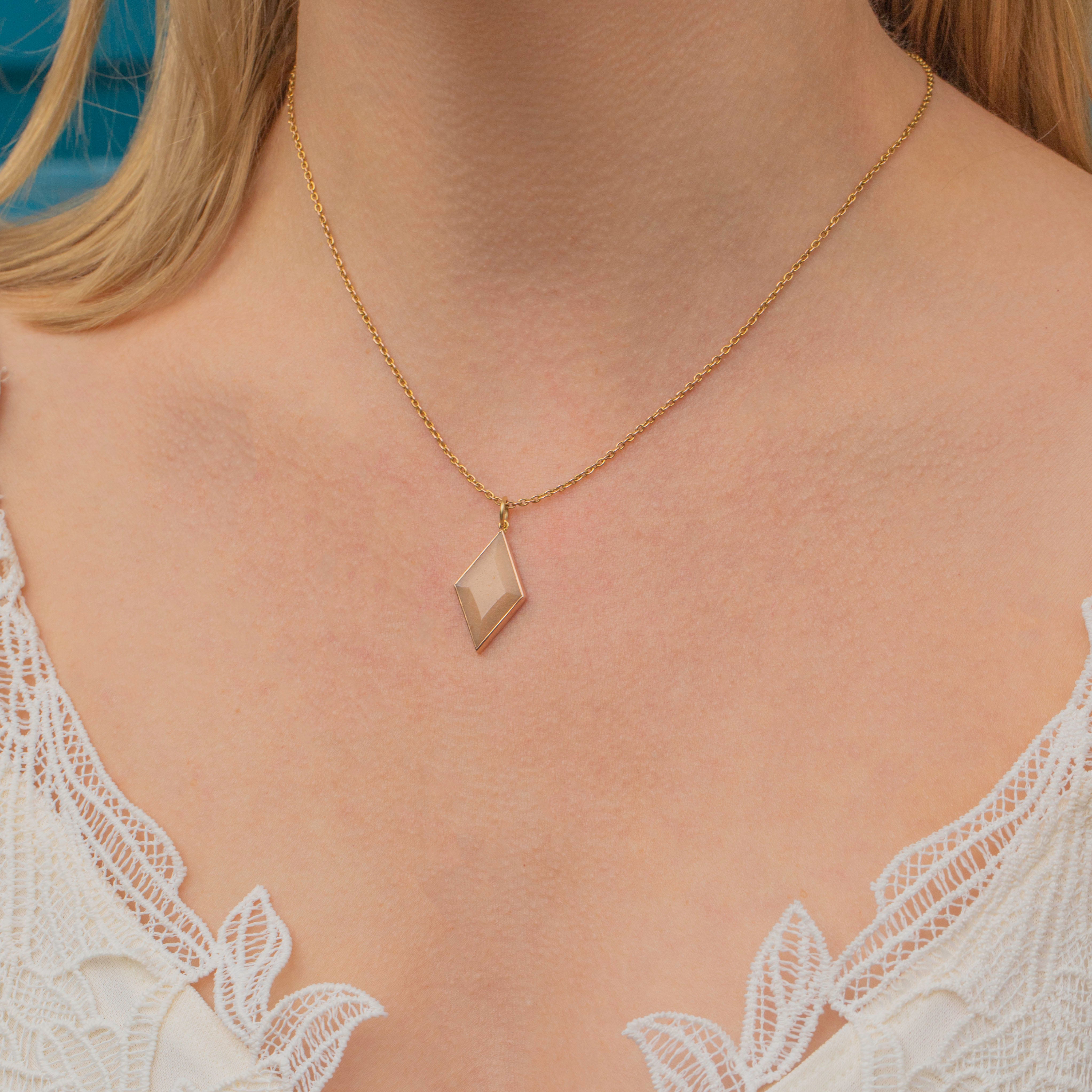 Set in 14ct blushed gold, the sleek geometric lines and minimalistic design highlight the era’s focus on refined craftsmanship and luxury. This pendant embodies the bold yet elegant Art Deco aesthetic.