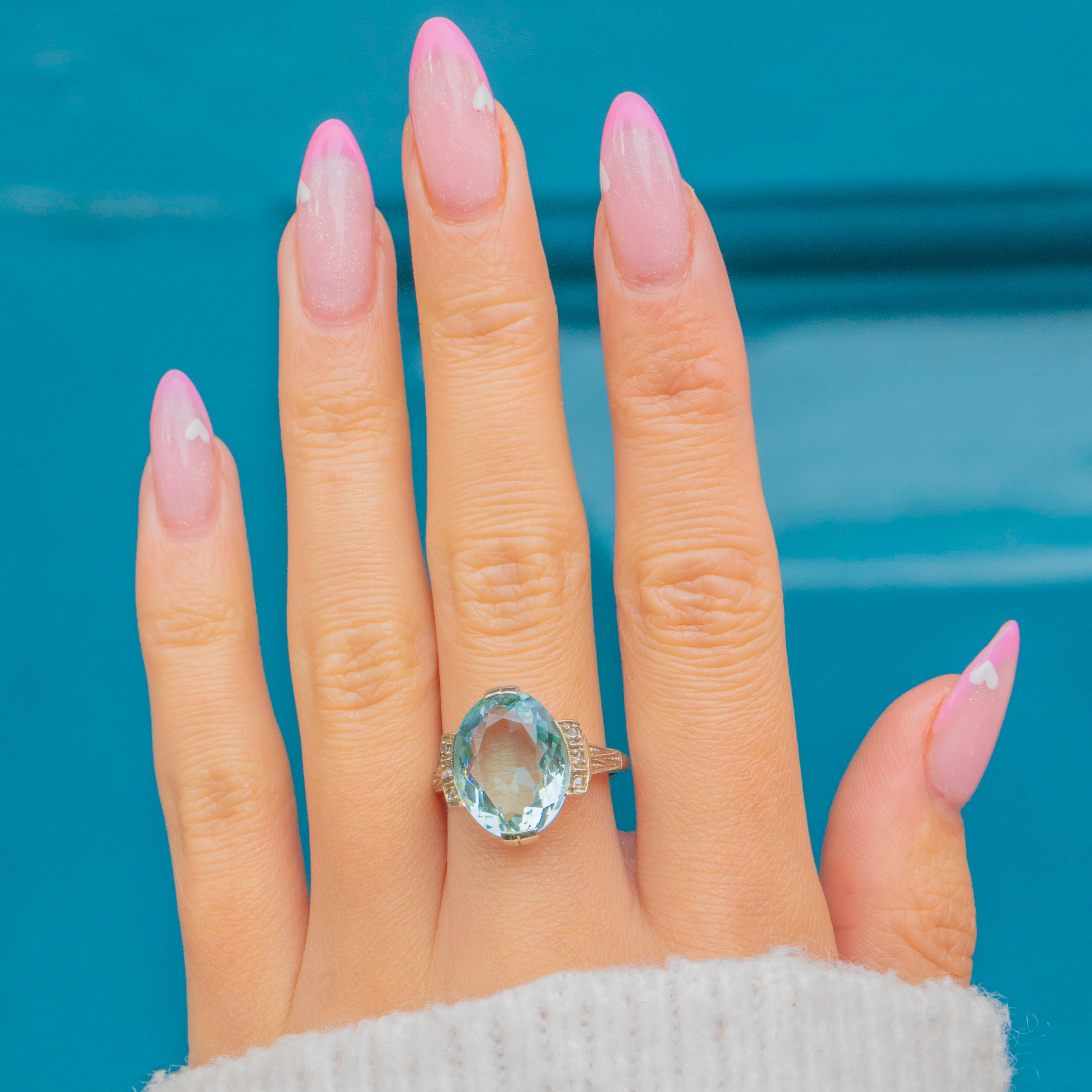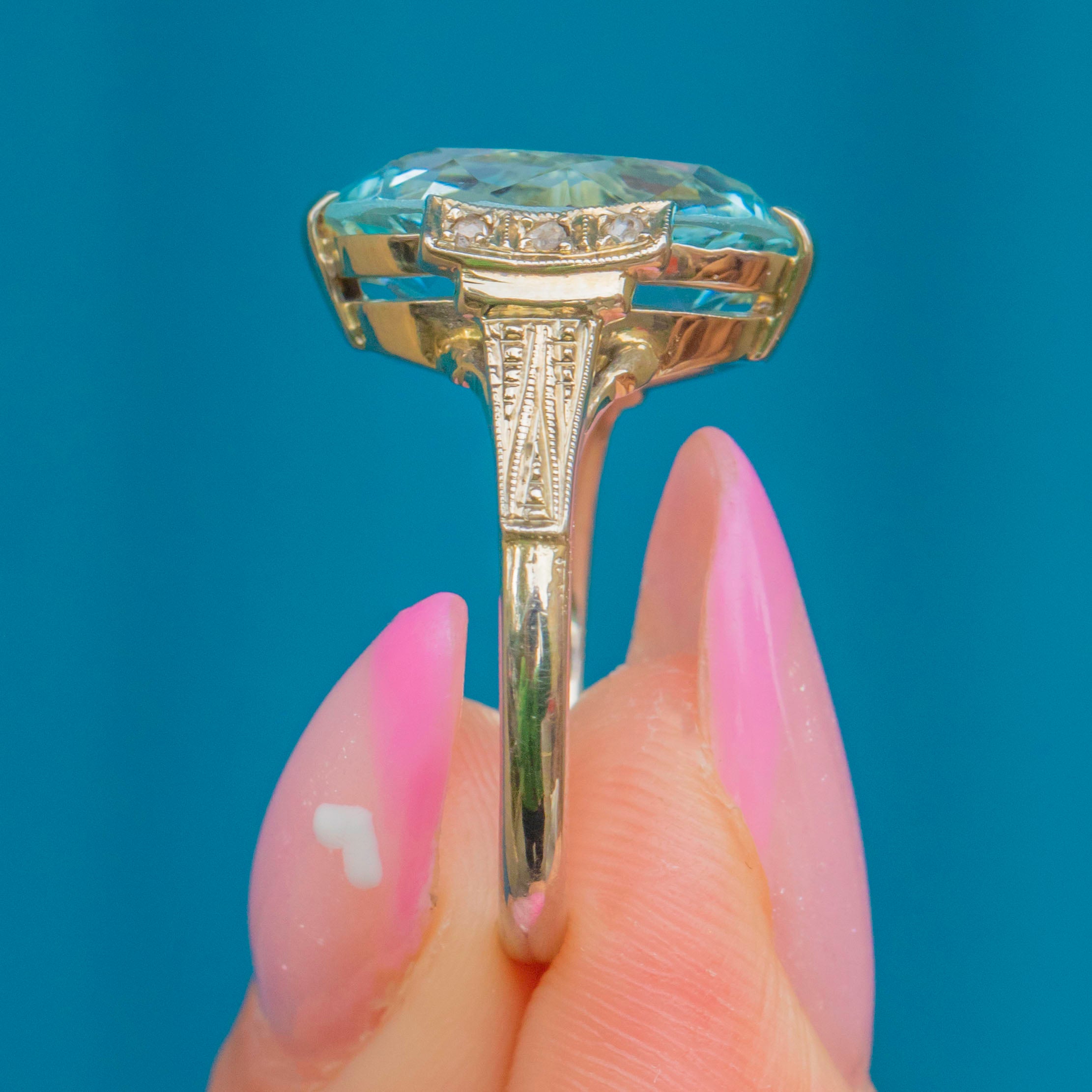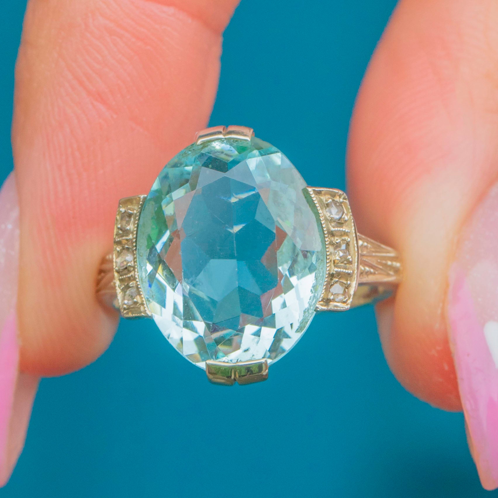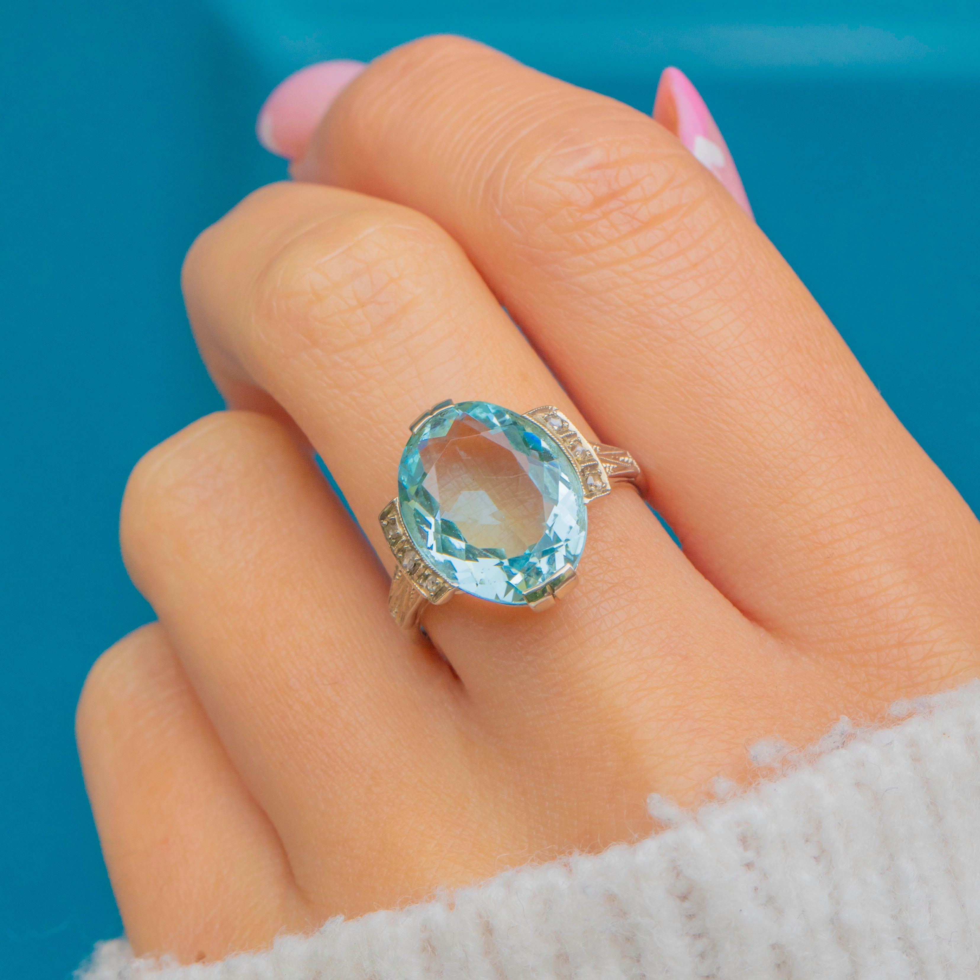 A breathtaking Continental Art Deco ring showcasing a magnificent 10.00ct Aquamarine framed by six tiny accent Diamonds. The cool, ocean-blue Aquamarine glows beautifully within its 14ct Gold mount, enhanced by three 1mm Diamonds on each shoulder for a touch of sparkle.