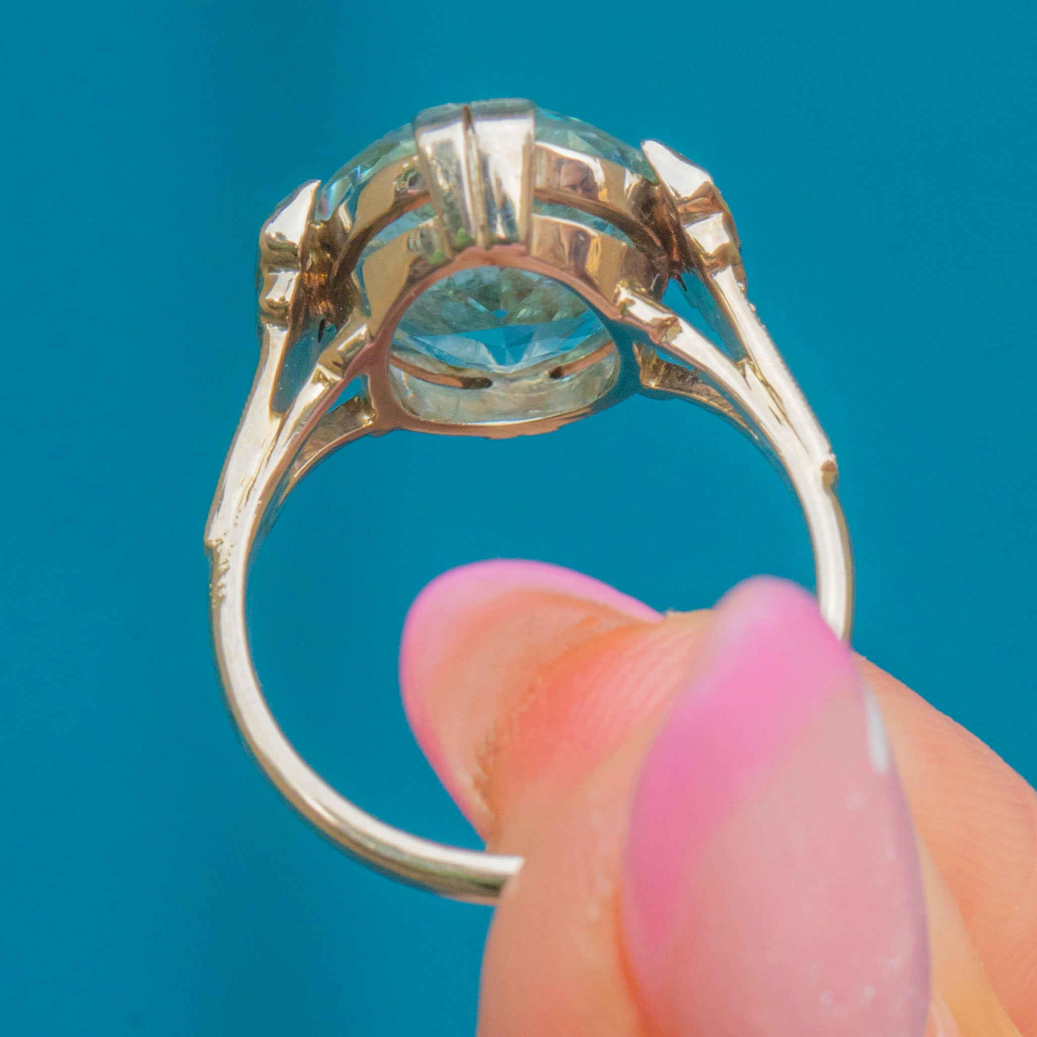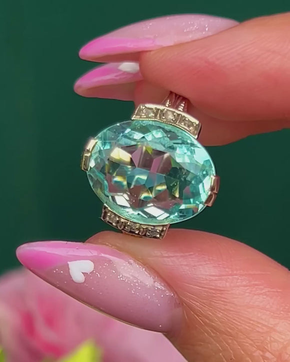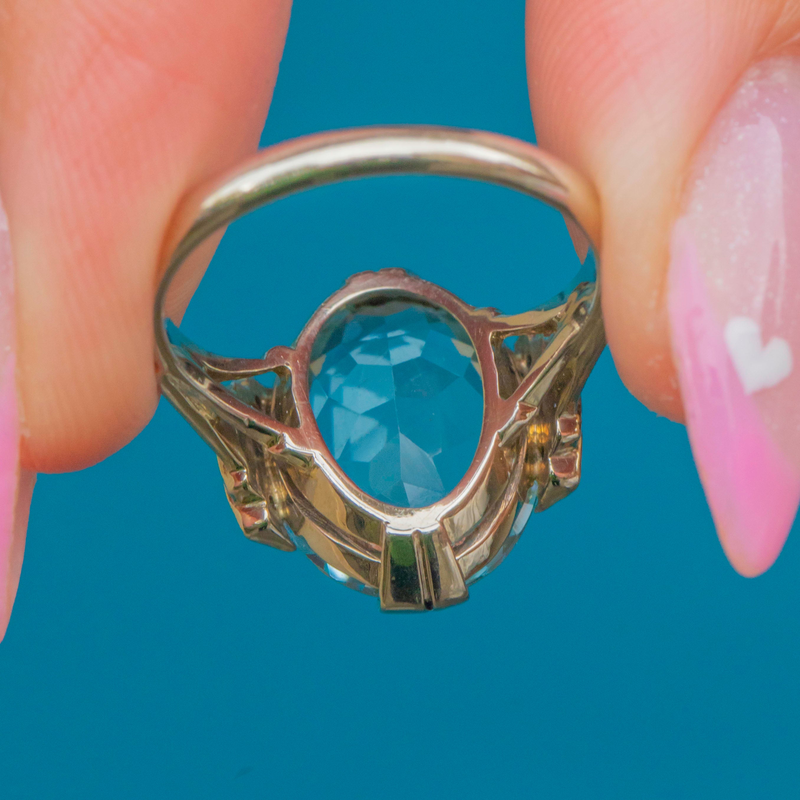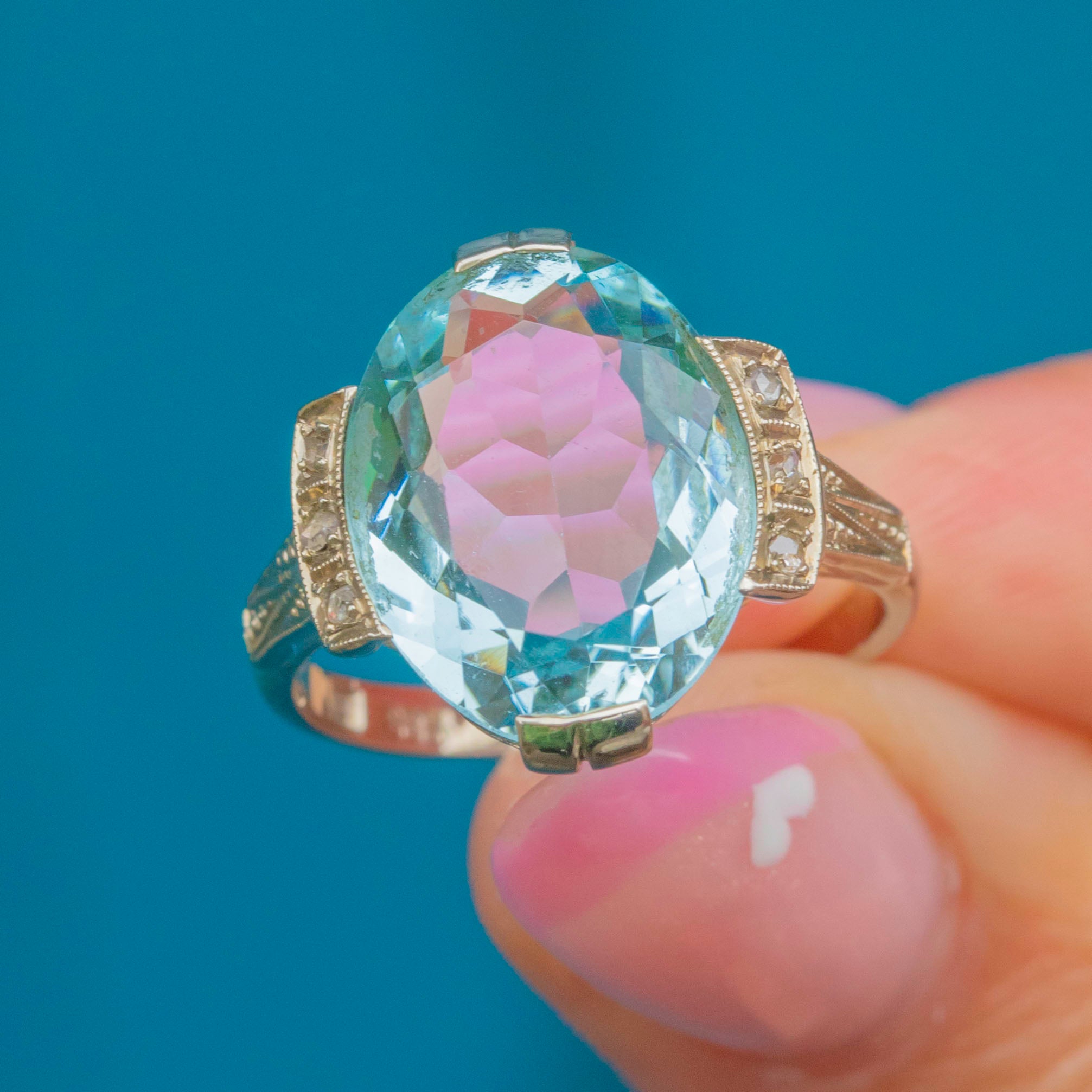 A breathtaking Continental Art Deco ring showcasing a magnificent 10.00ct Aquamarine framed by six tiny accent Diamonds. The cool, ocean-blue Aquamarine glows beautifully within its 14ct Gold mount, enhanced by three 1mm Diamonds on each shoulder for a touch of sparkle.