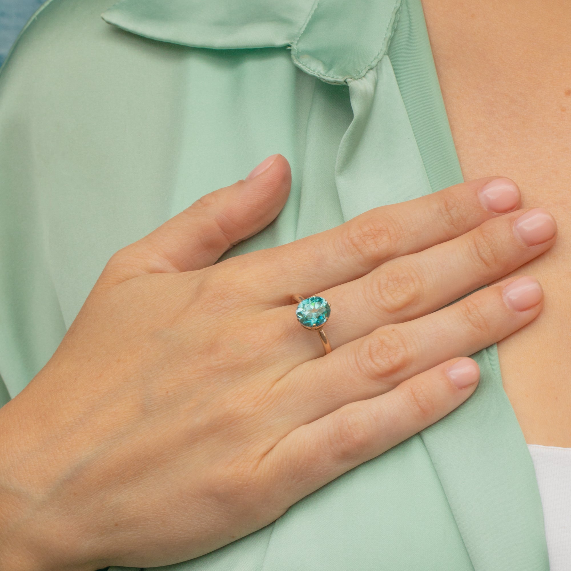 Taking centre stage is a breathtaking sky blue Zircon that will add a joyful pop of colour to any attire. An impressive 2.25ct Blue Zircon, her facets glistens in the light resulting in the perfect piece to transition piece from day to night.