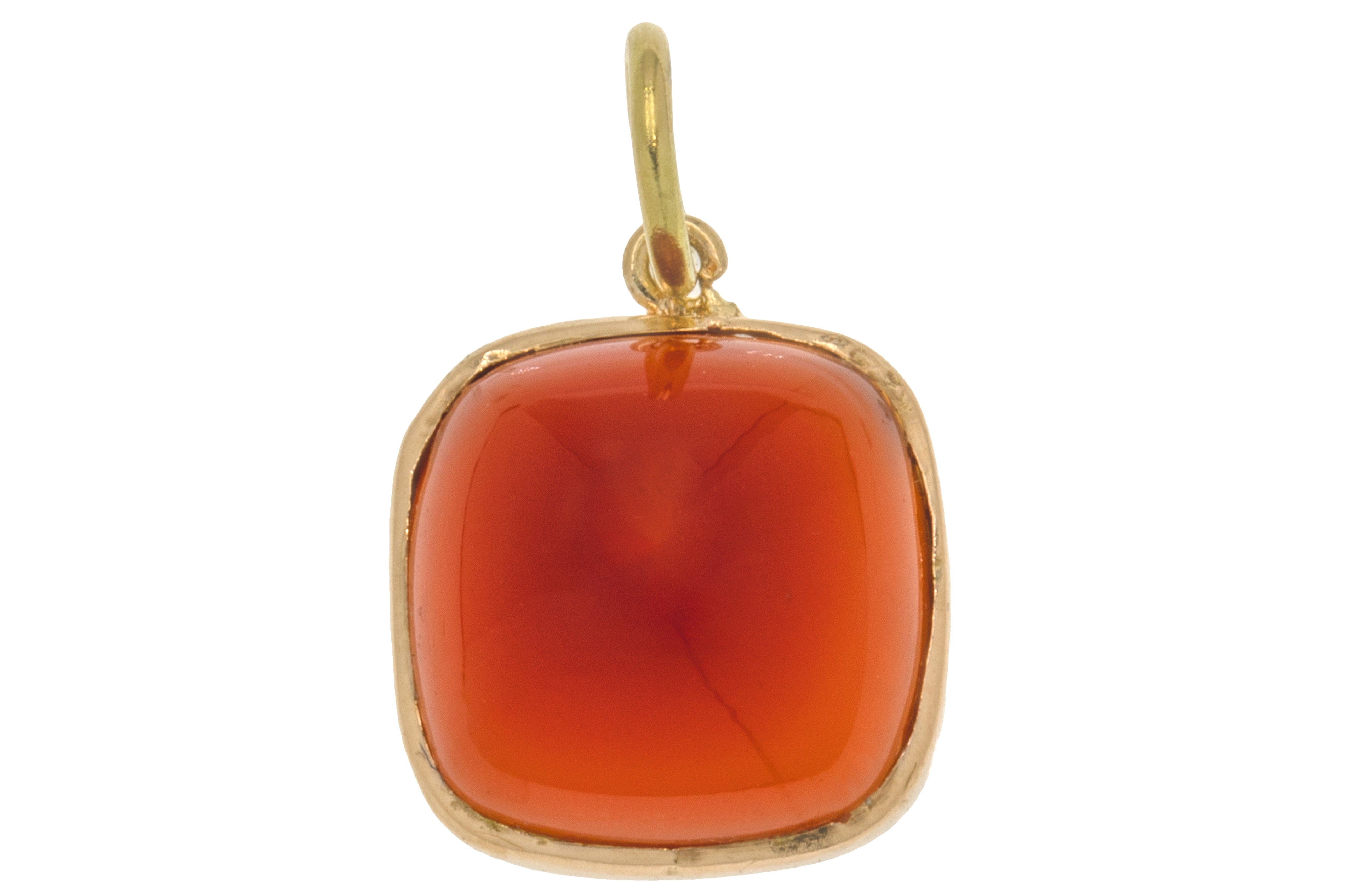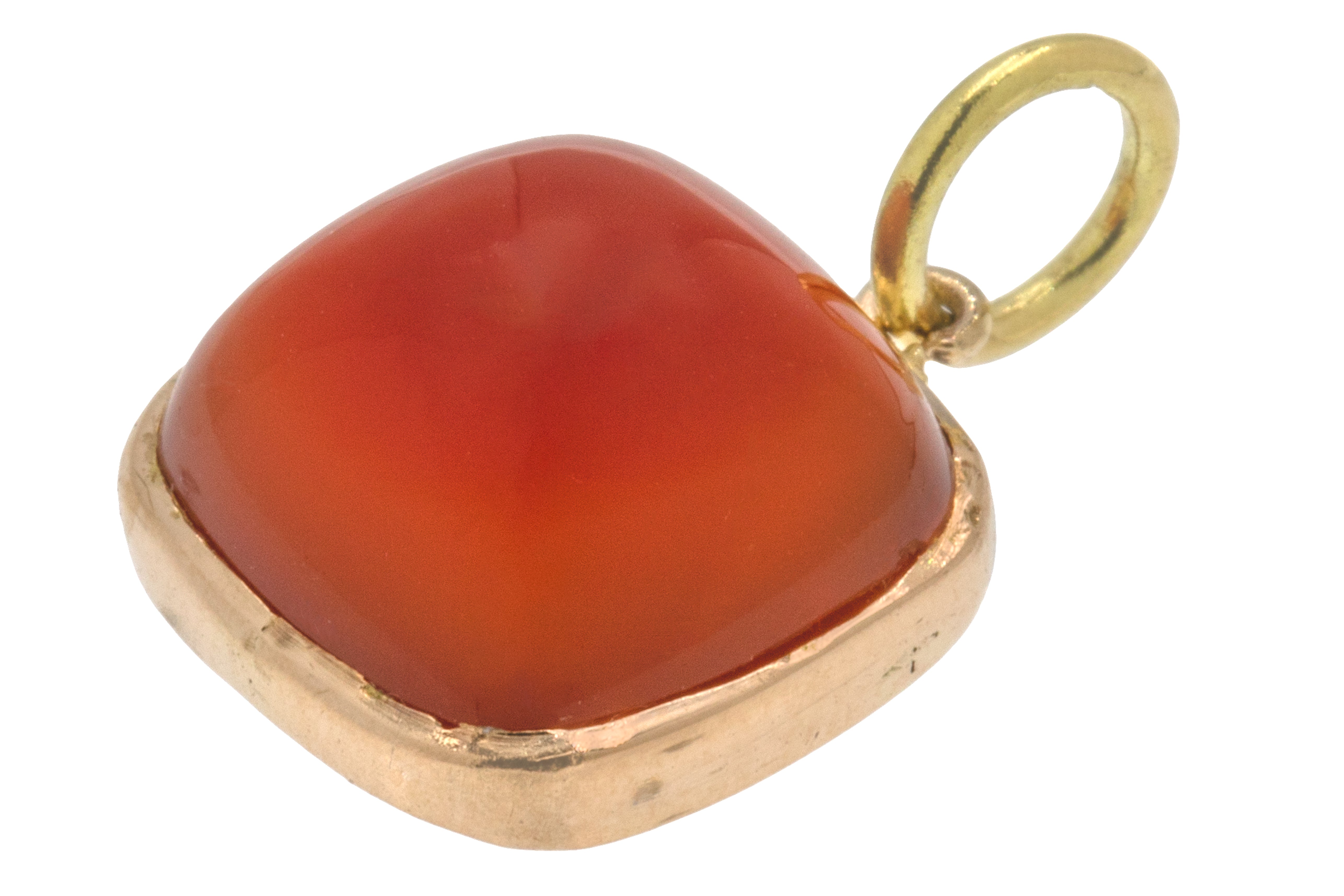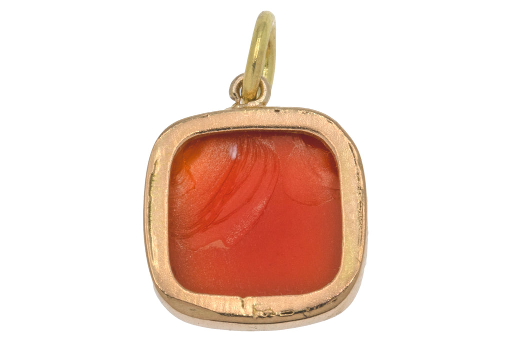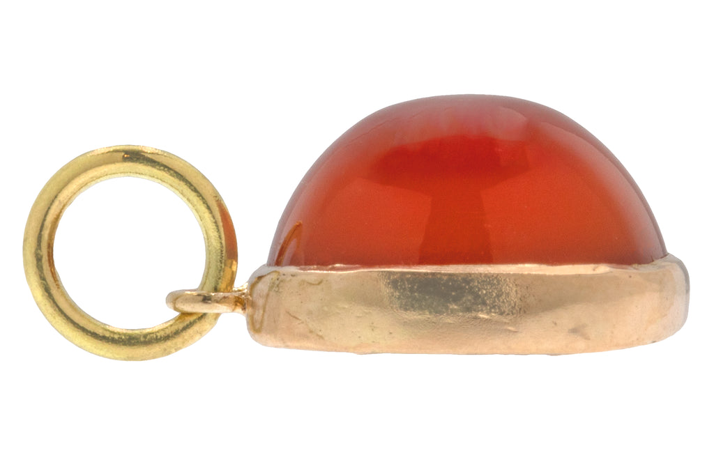 MATERIALS: Tests as 14ct Gold bezel setting, 18ct Gold jump-ring, Carnelian.