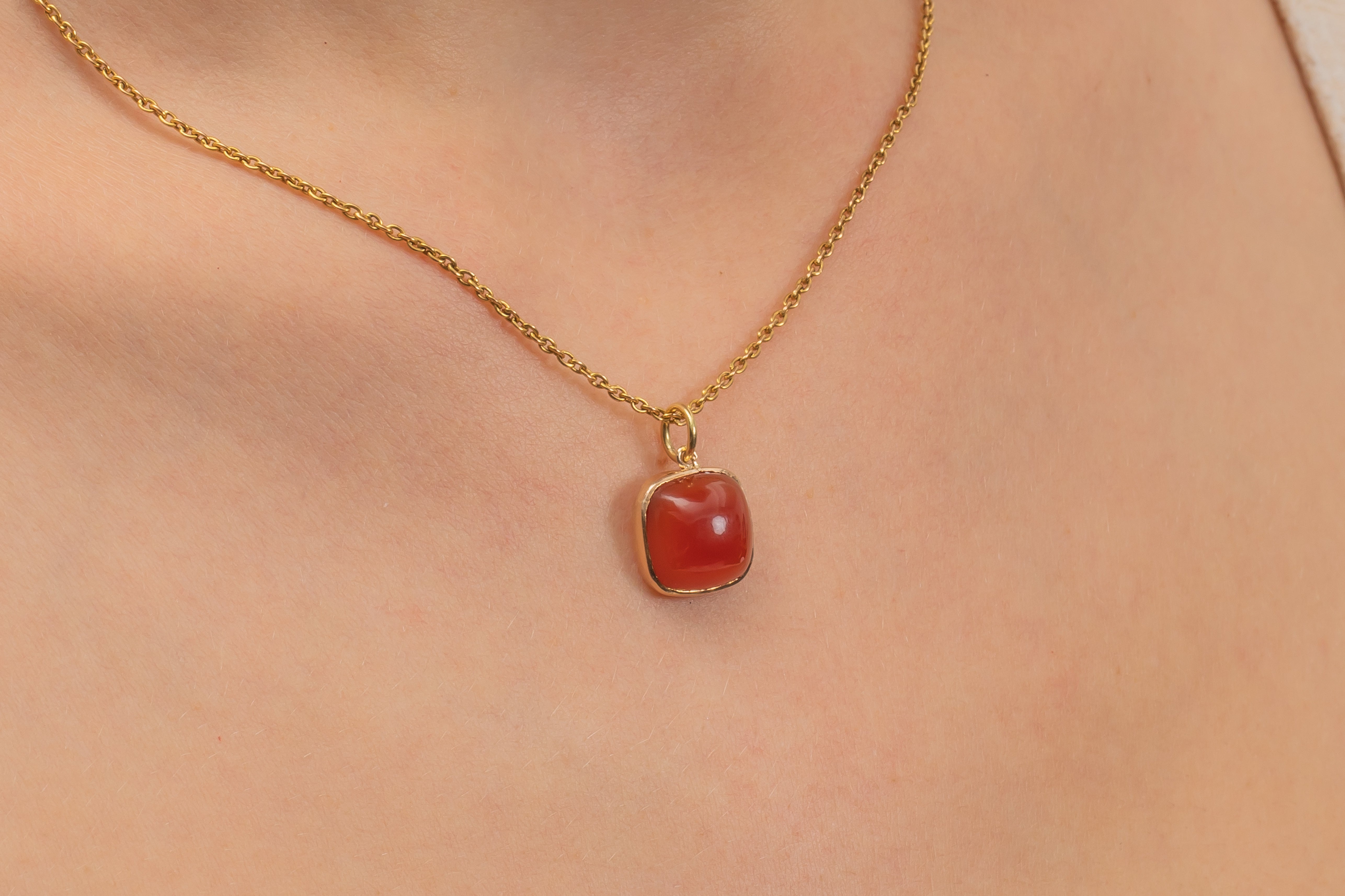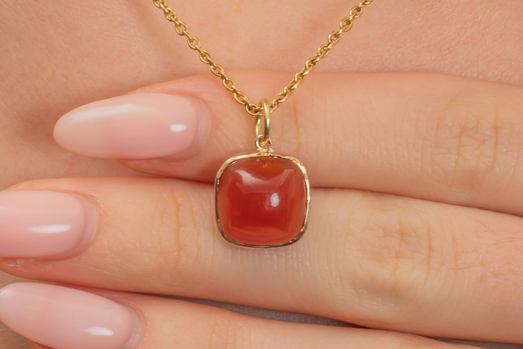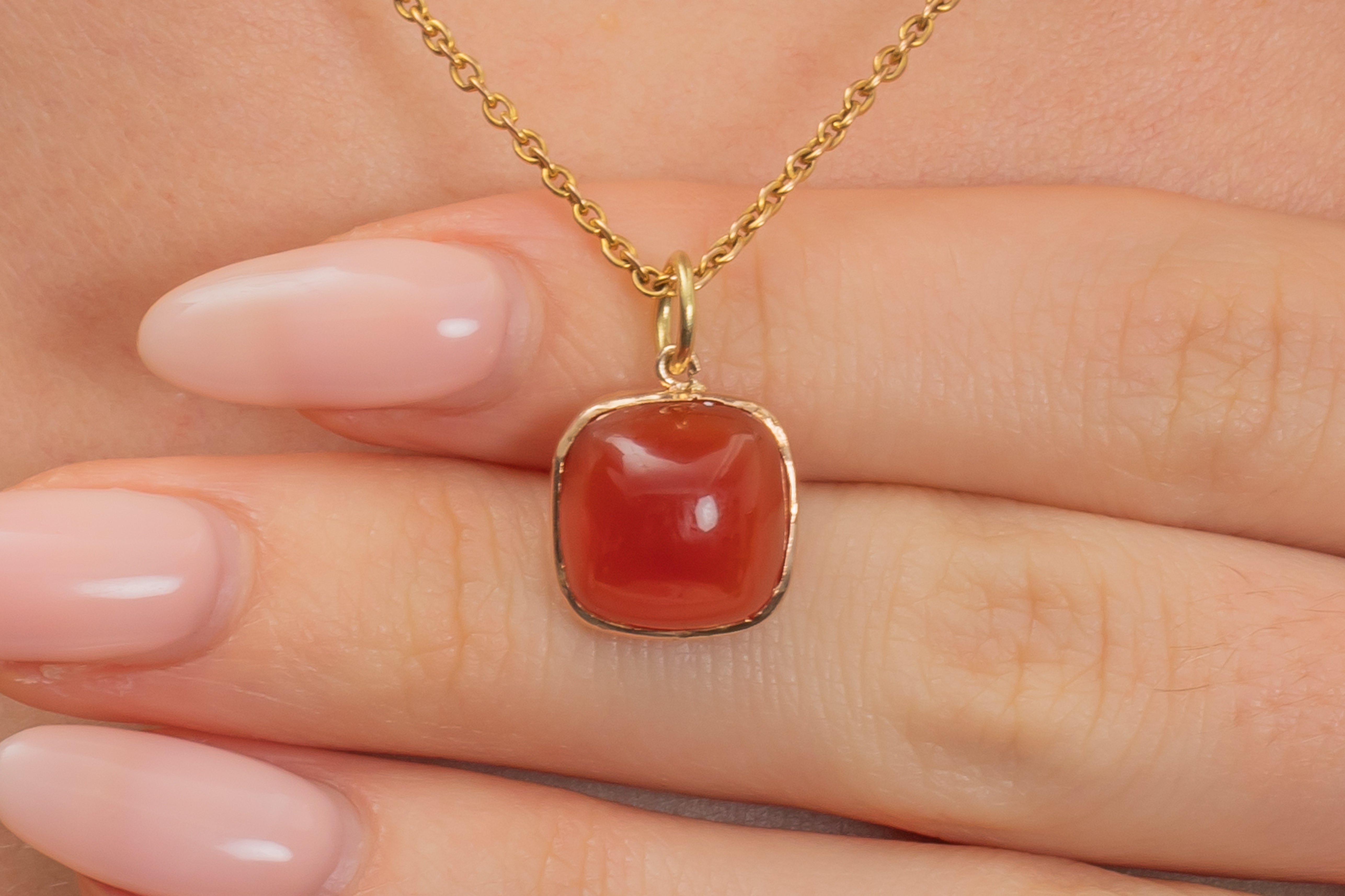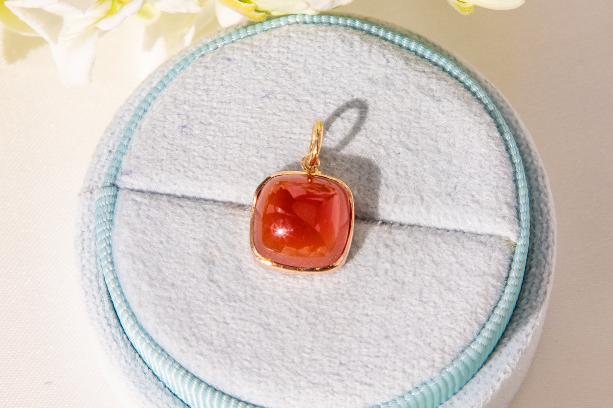 The antique Carnelian is encased in buttery 14ct Gold bezel setting, two highly desirable characteristics within antique jewellery. Said to bring warmth, this Art Deco Carnelian pendant is the perfect pendant to see you through those chilling winter months!