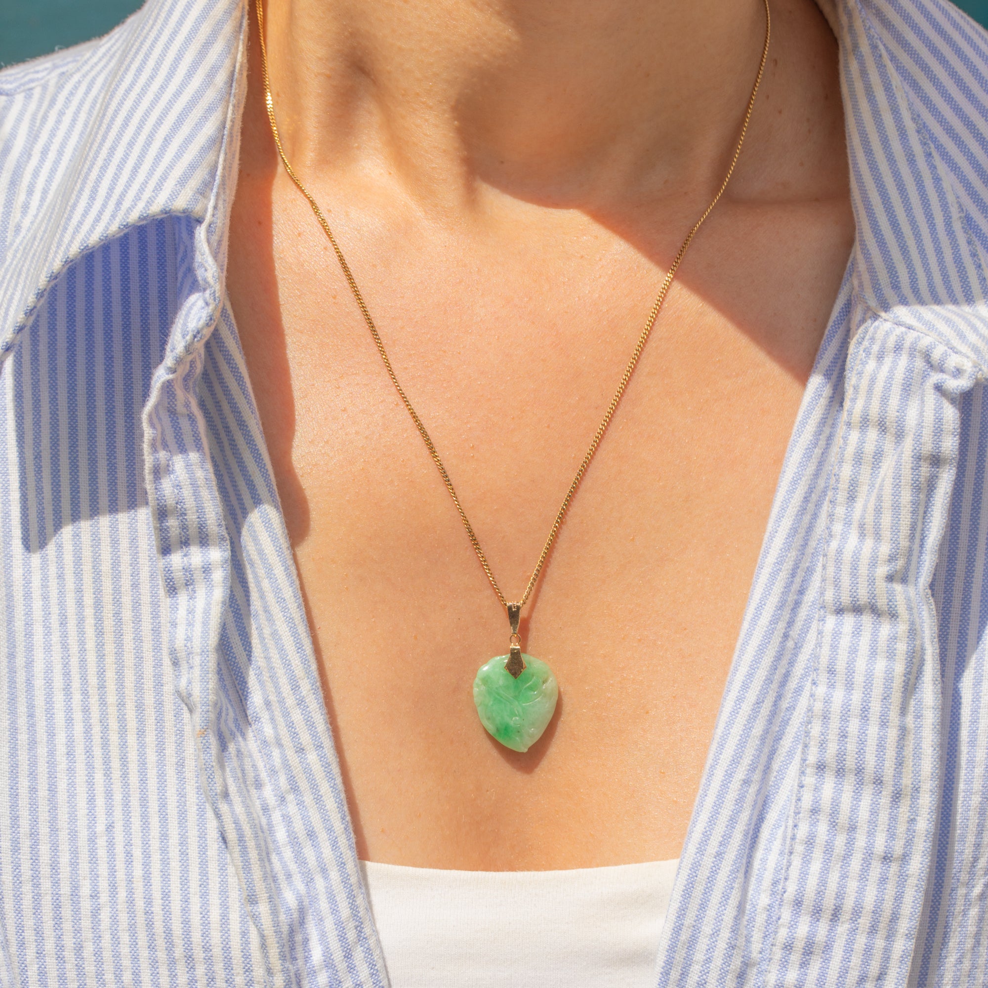 This sweet Art Deco 14ct Gold Carved Jade heart pendant will make a fabulous addition to your antique jewellery collection. This Art Deco delight displays a minty-green Jade, carved into a gorgeous heart with intricate engravings throughout, and is suspended from a 14ct Gold bale for a luxurious finishing touch!
