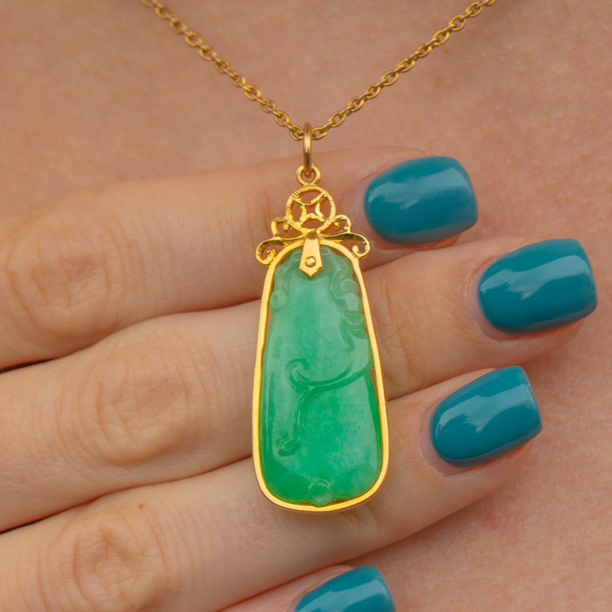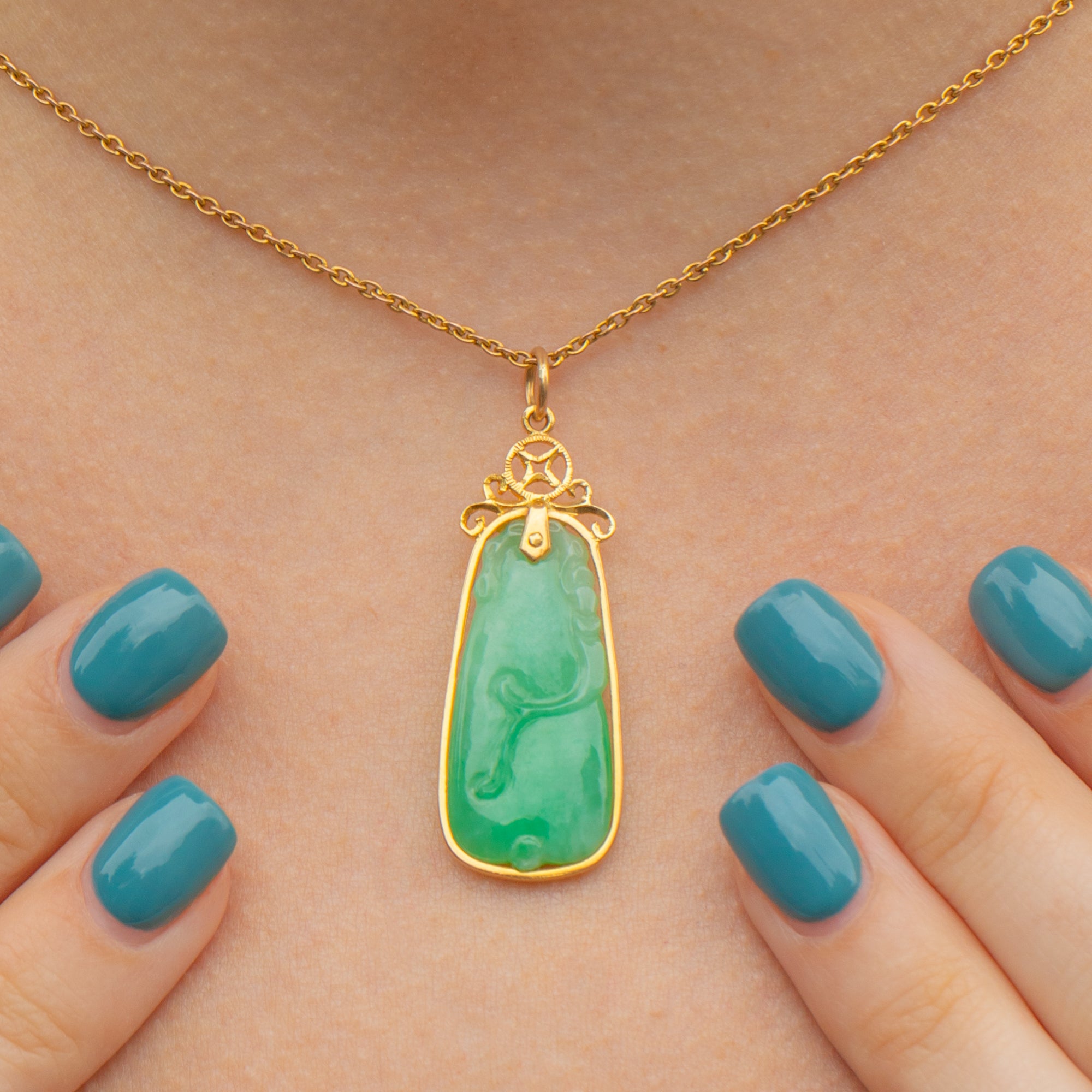 Feast your eyes on this 14ct Gold carved Jade pendant! This piece has an earthy feel, and we adore the detailing of this lovely Jade pendant with the fancy top to the Art Deco pendant being the cherry on top of the cake!
