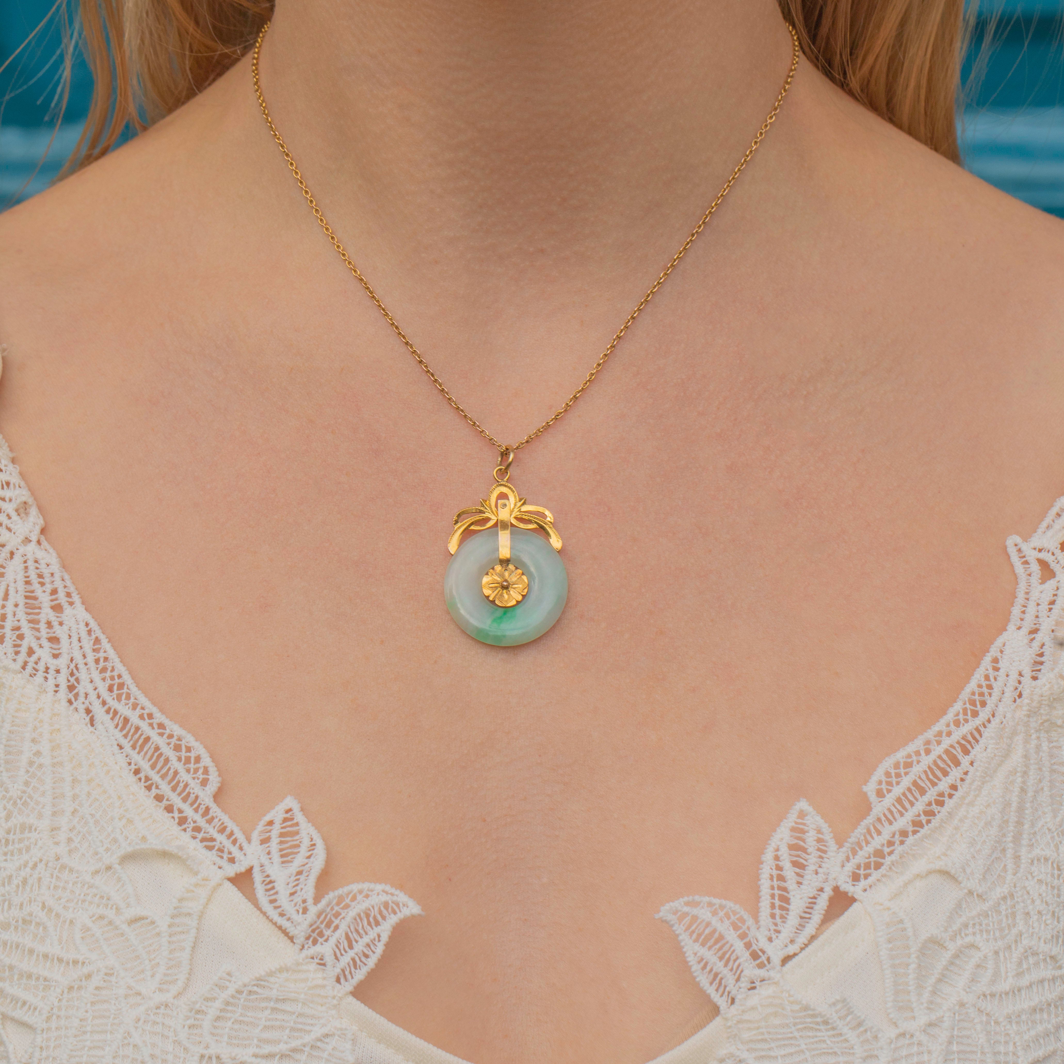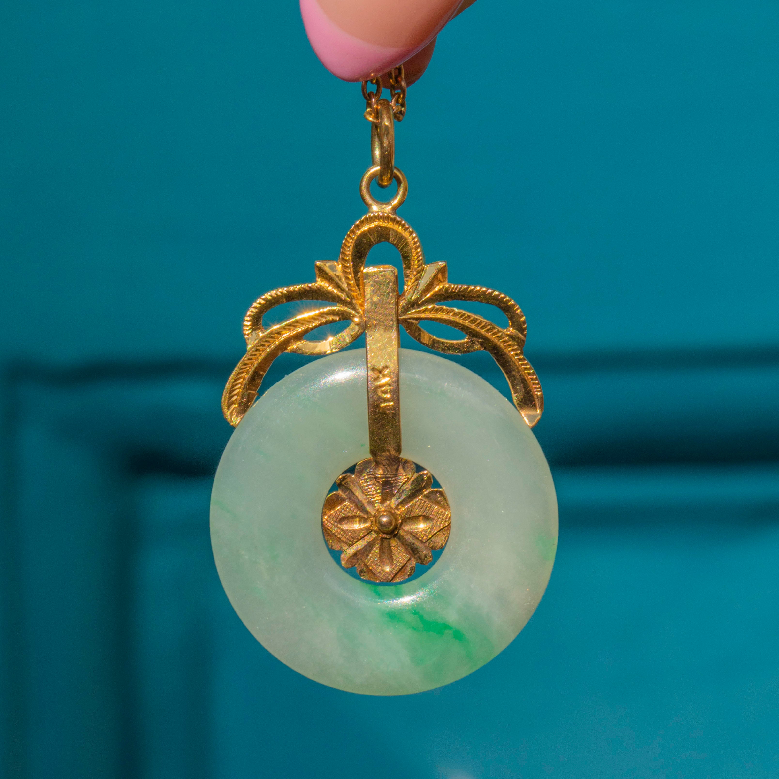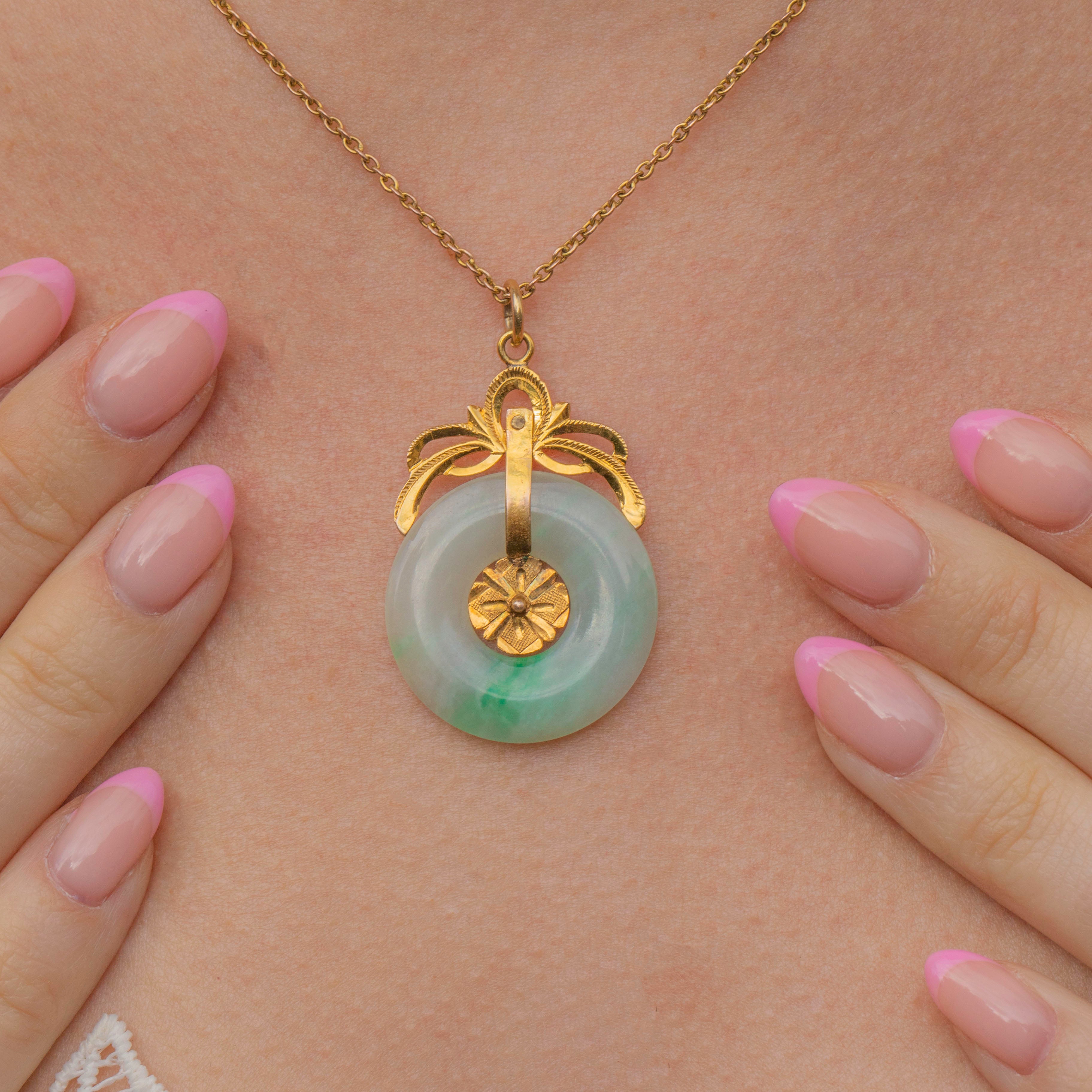 EXCELLENT. This Art Deco 14ct Gold Jade disc pendant is in excellent condition. The Jade is beautifully preserved, showcasing its natural colour and intricate carving without any chips or cracks. The 14ct Gold setting retains its original luster with minimal signs of wear. Ready to be worn and enjoyed for years to come, this Art Deco pendant will make a fabulous addition to your collection!