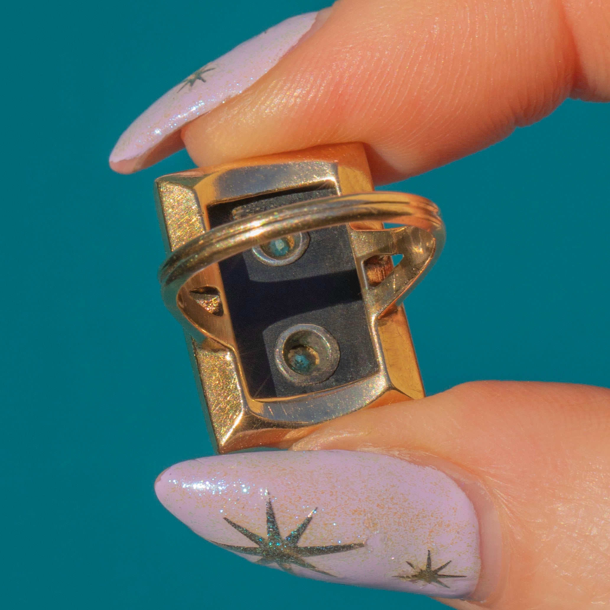 Bring some Deco decadence to your hand with this impressive Art Deco 14ct Gold Onyx Diamond panel ring! The buttery 14ct Gold displays a striking Onyx slab, inlaid with 0.30cts of old-European cut Diamonds providing the glossy ink-black surface with a bright scintillation.